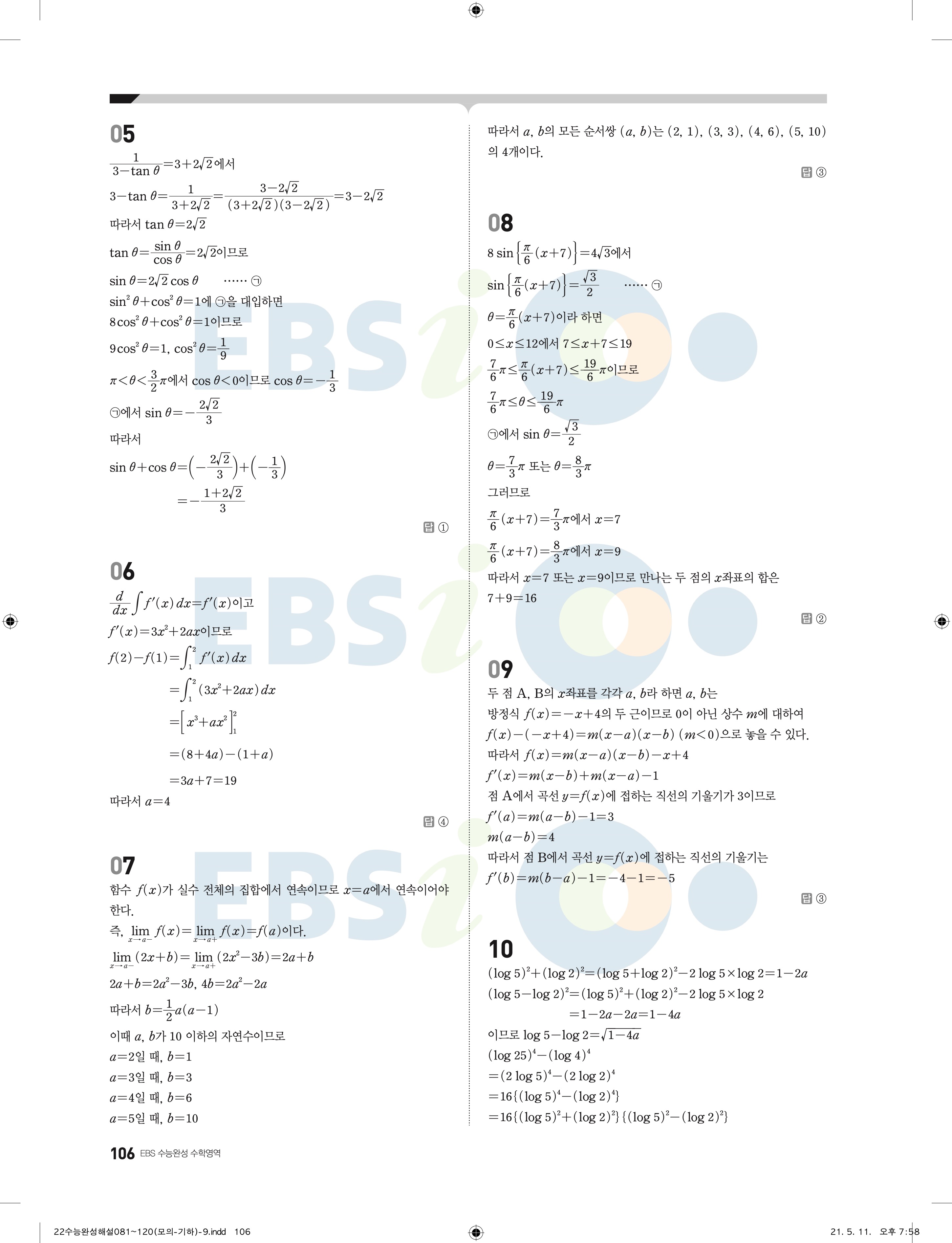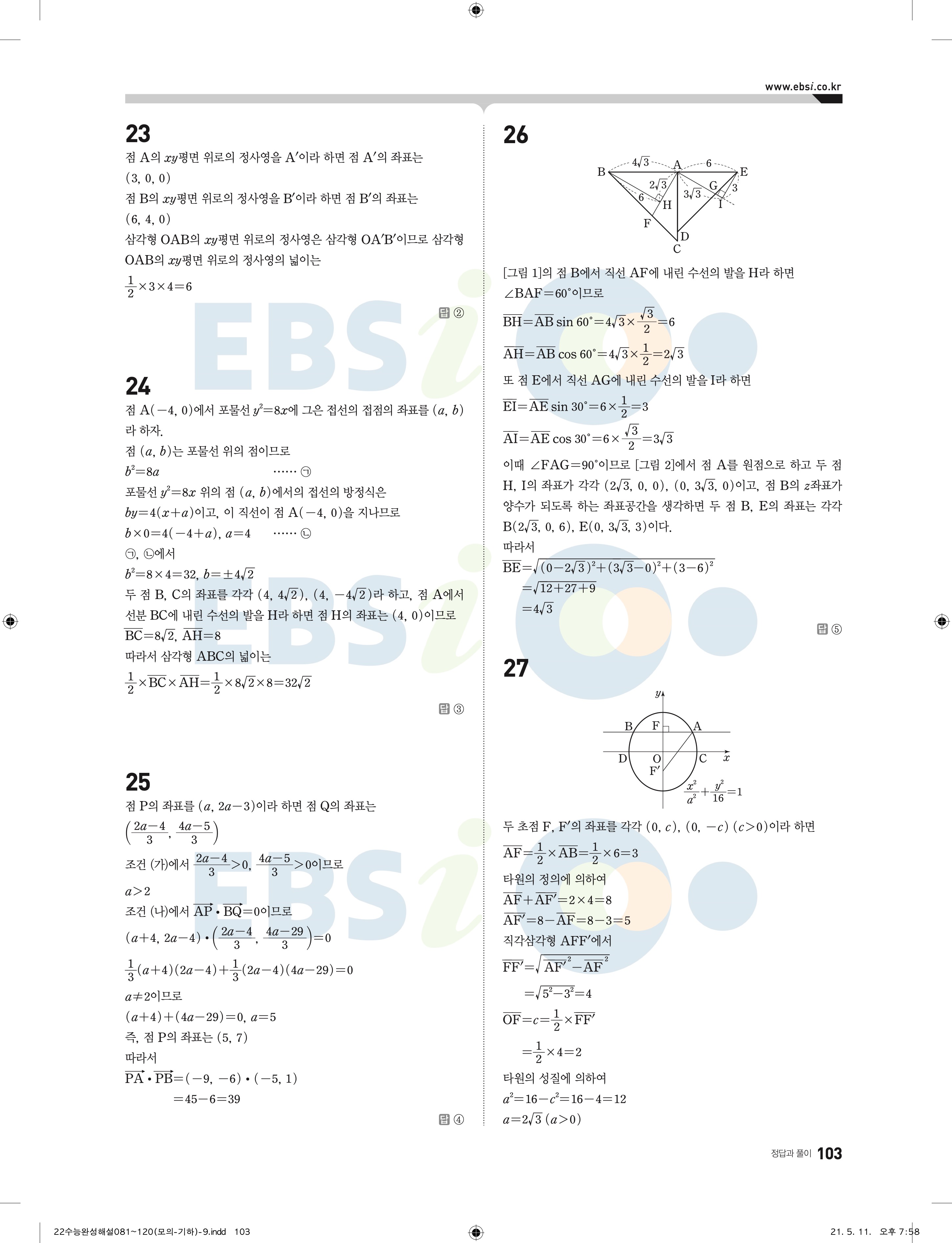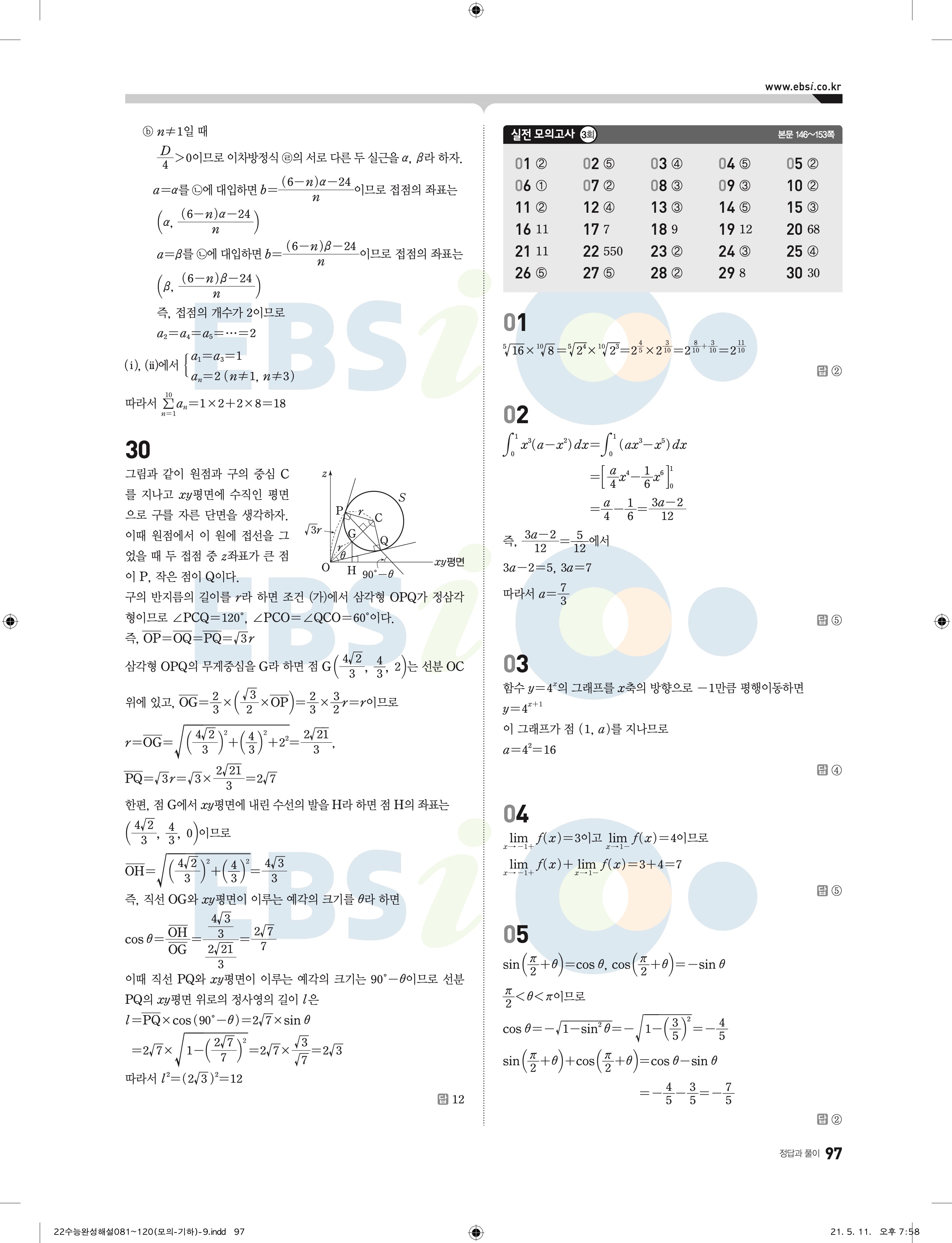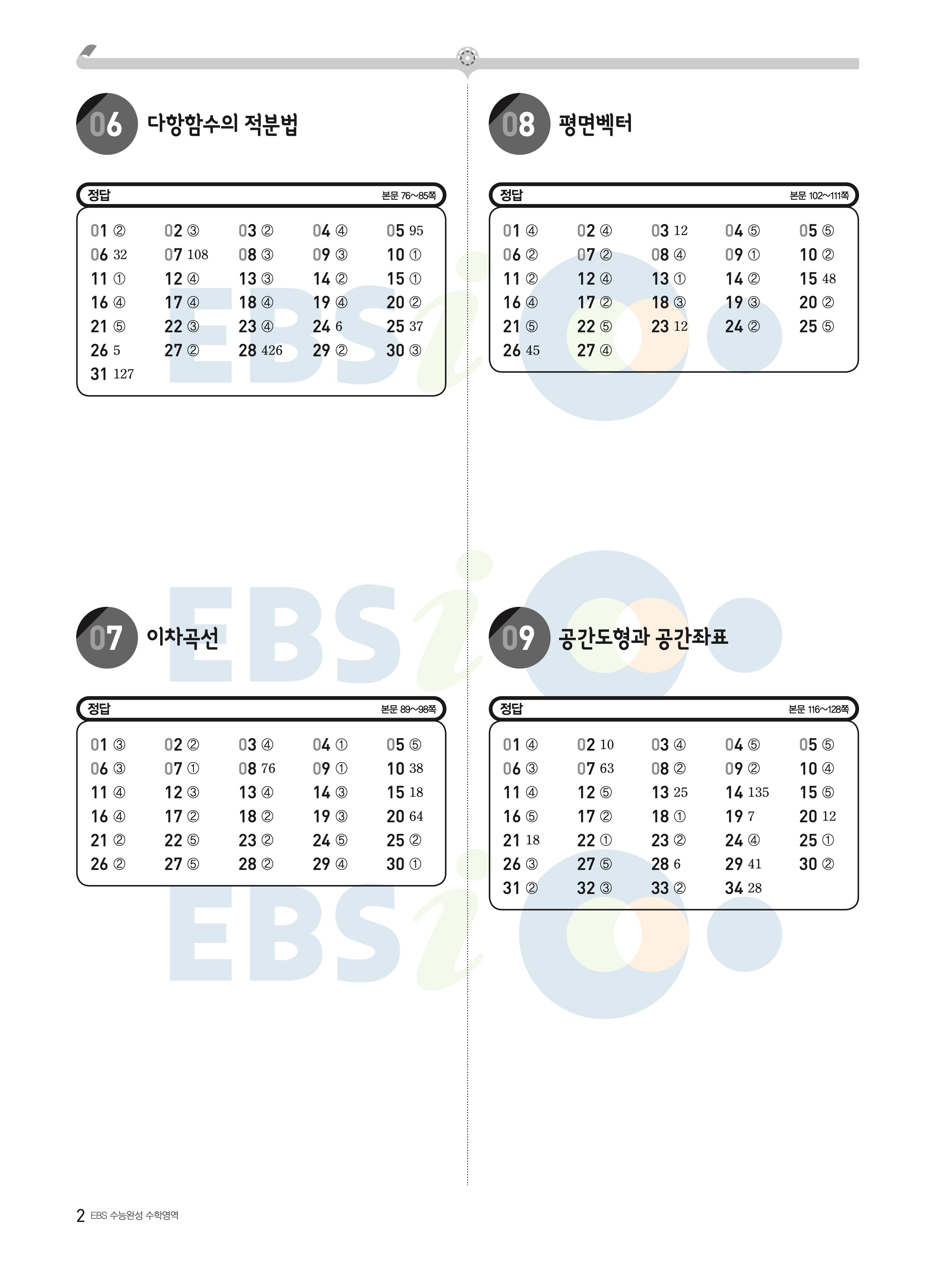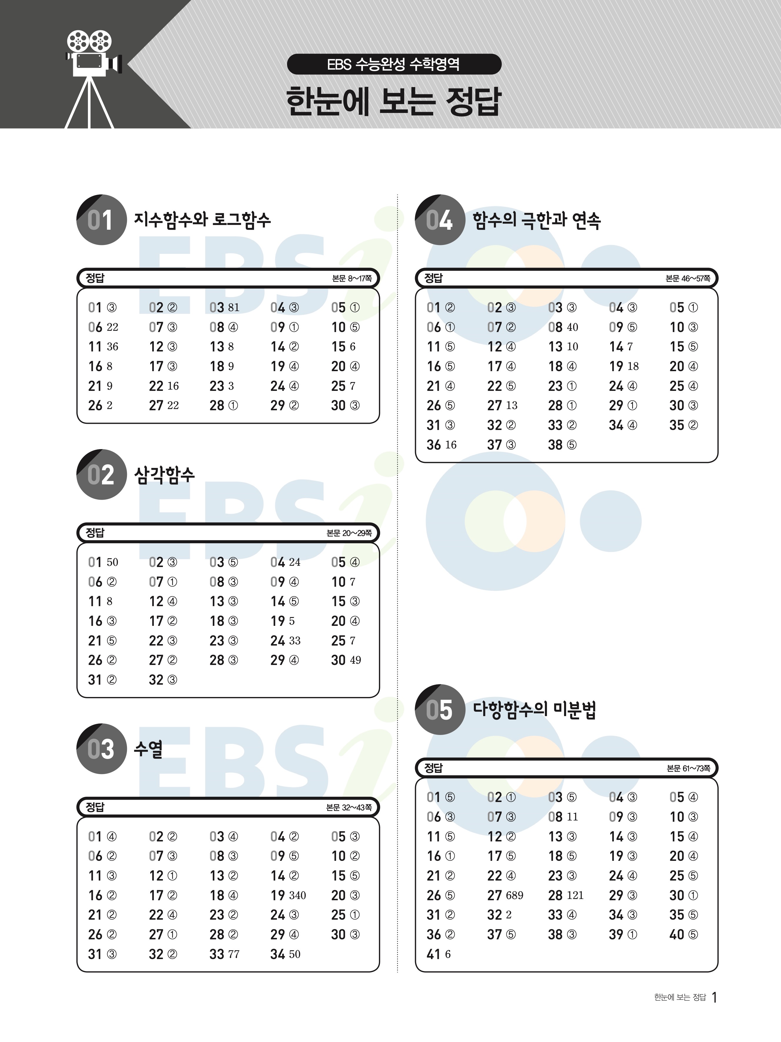 2022 EBS 수능완성 수학영역 수학1 수학2 기하 답지 해설 바로보는 사진답지 모바일최적화