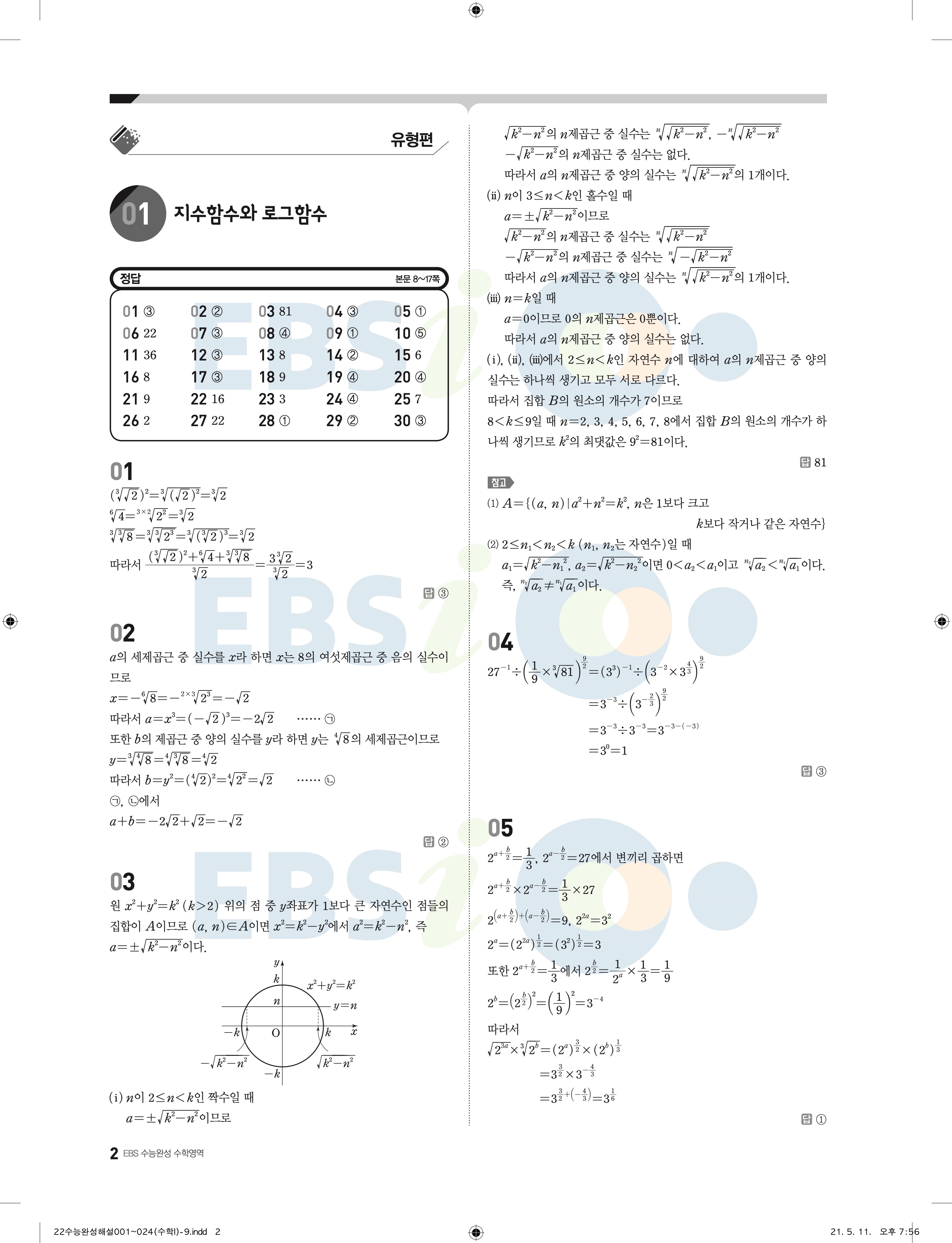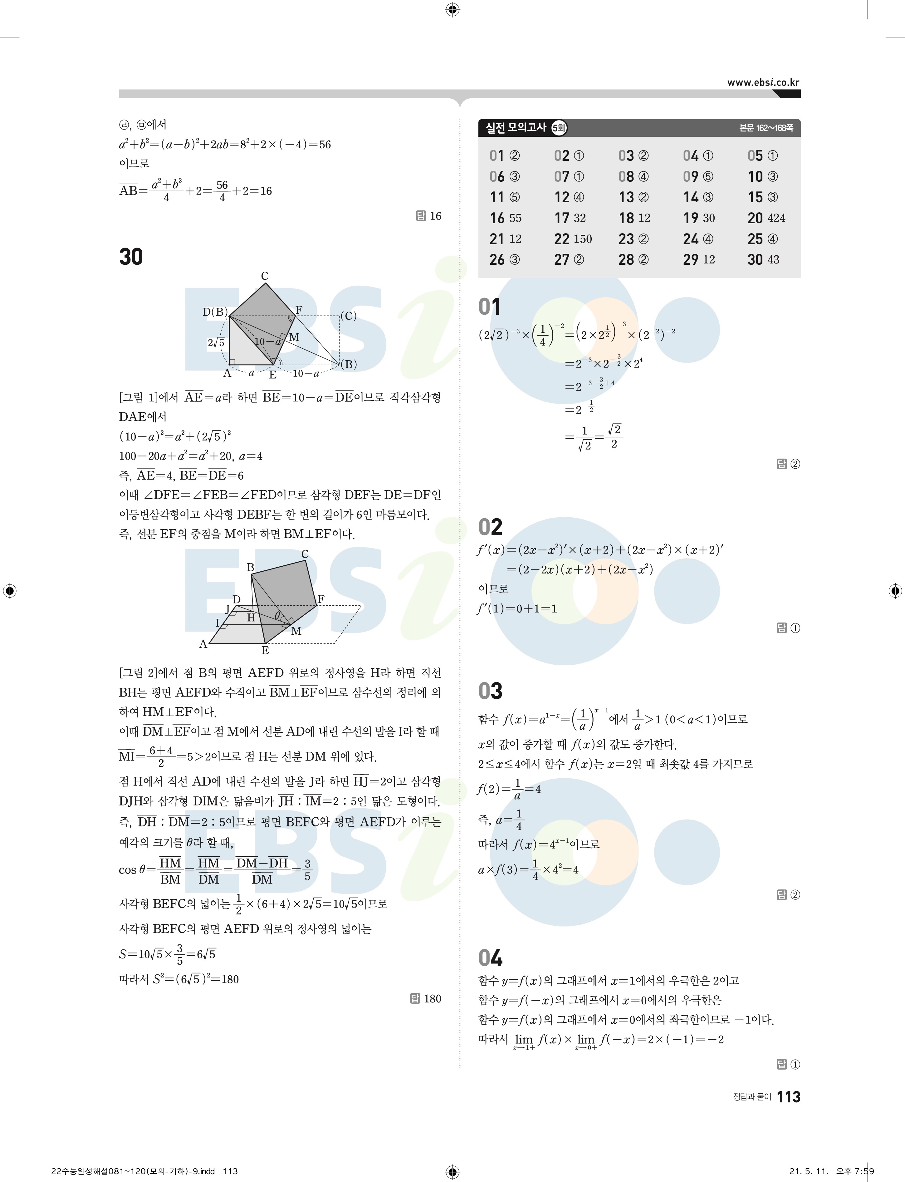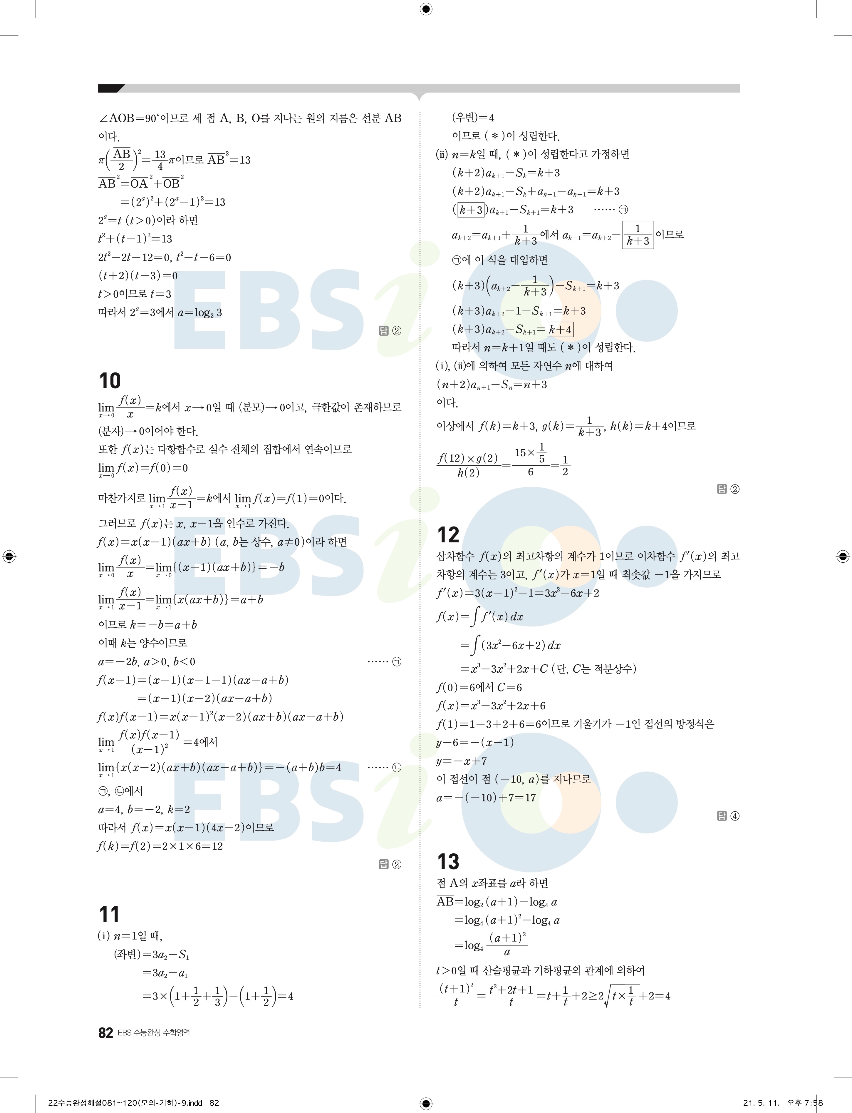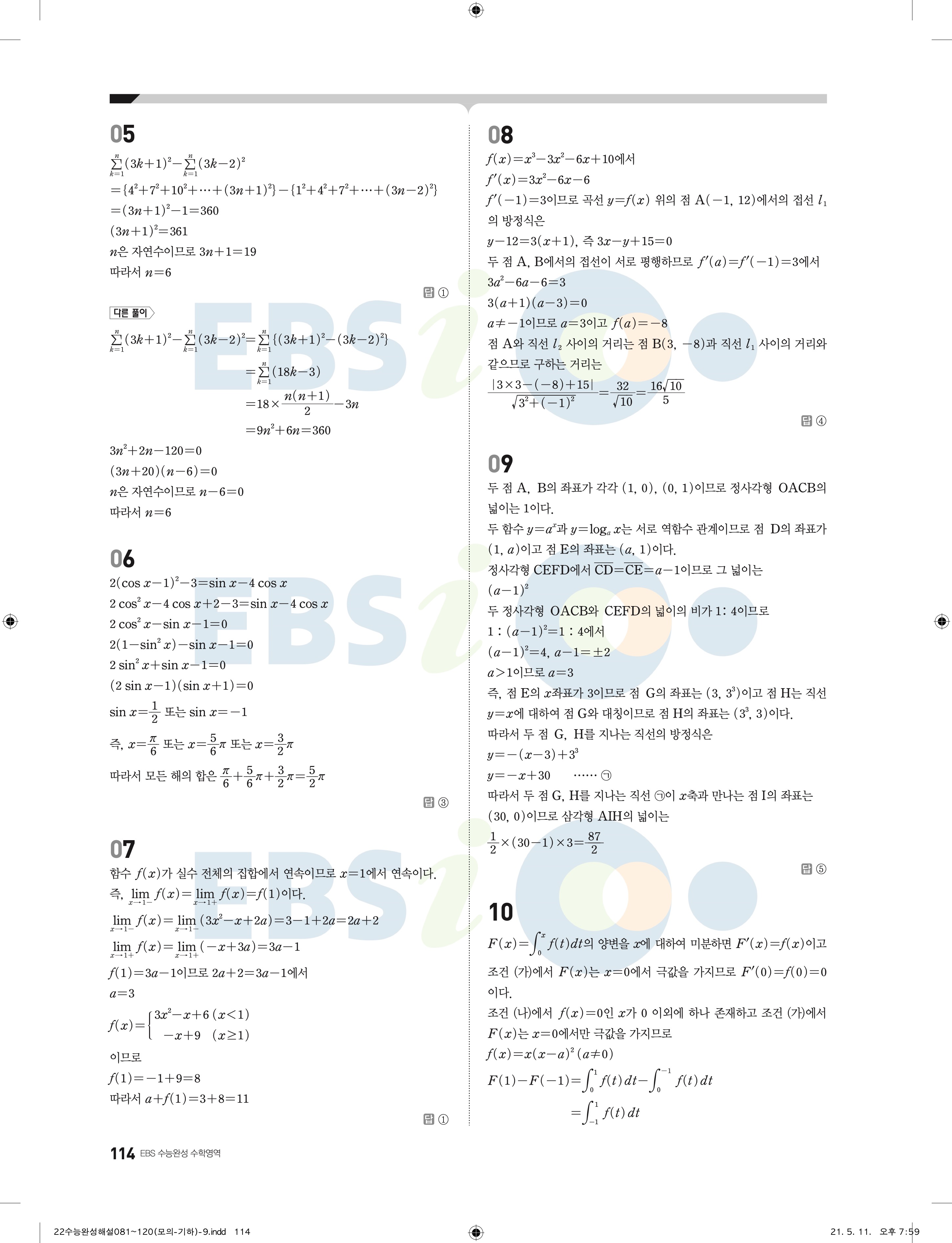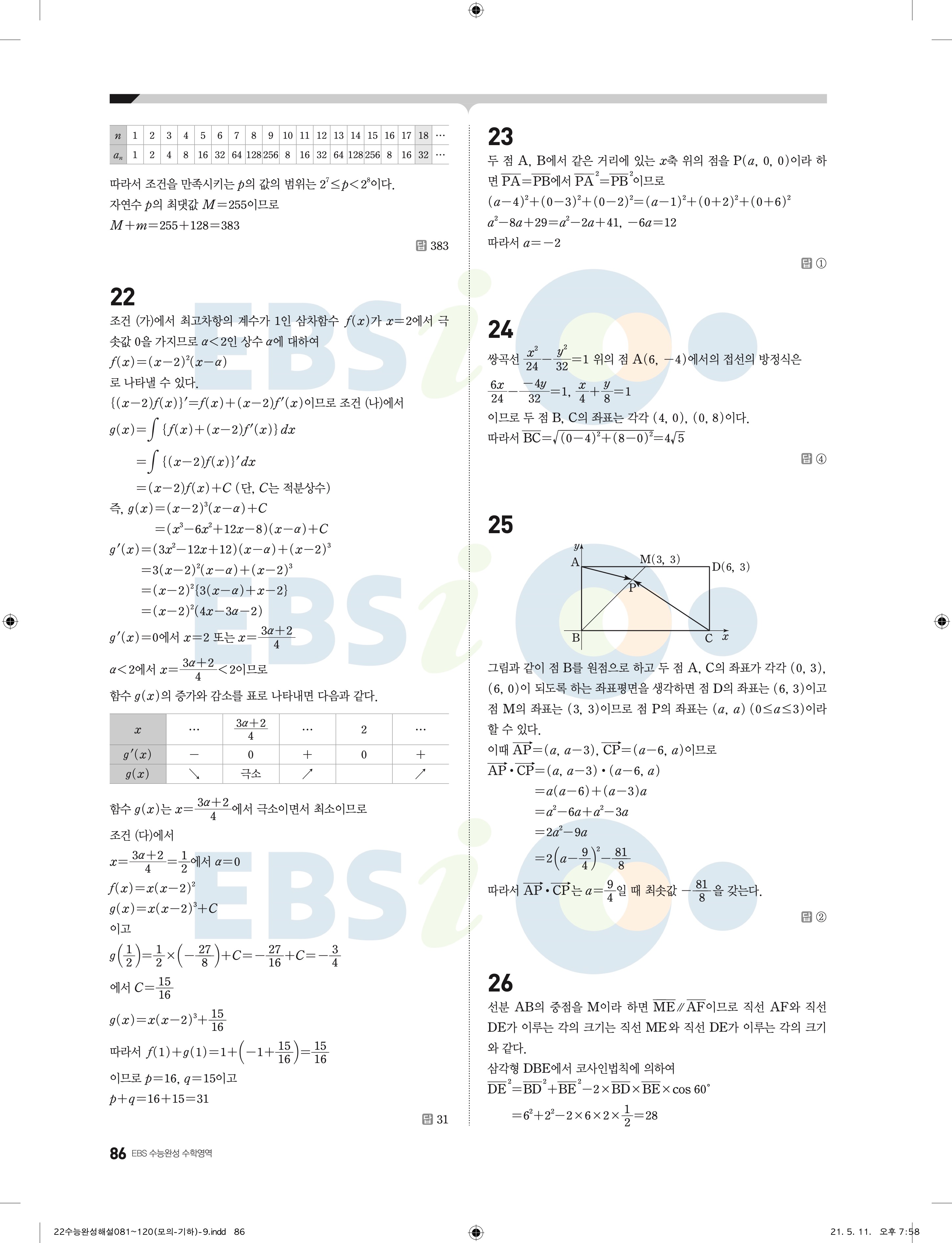 2022 EBS 수능완성 수학영역 수학1 수학2 기하 답지 해설 바로보는 사진답지 모바일최적화