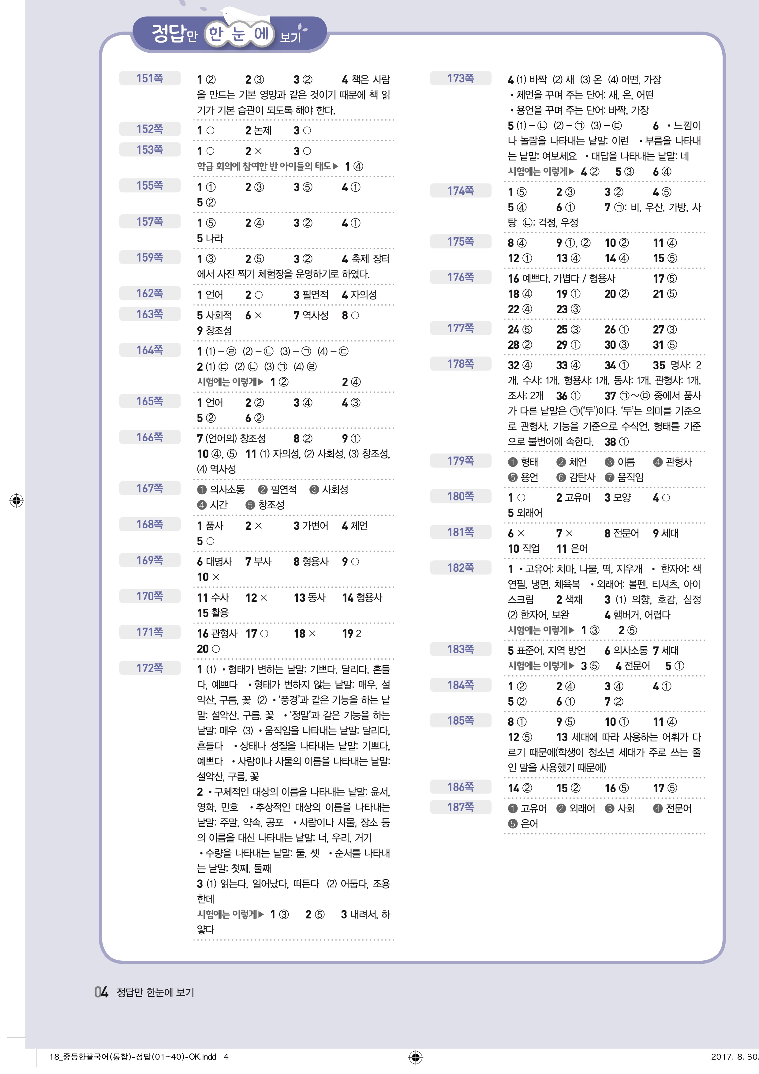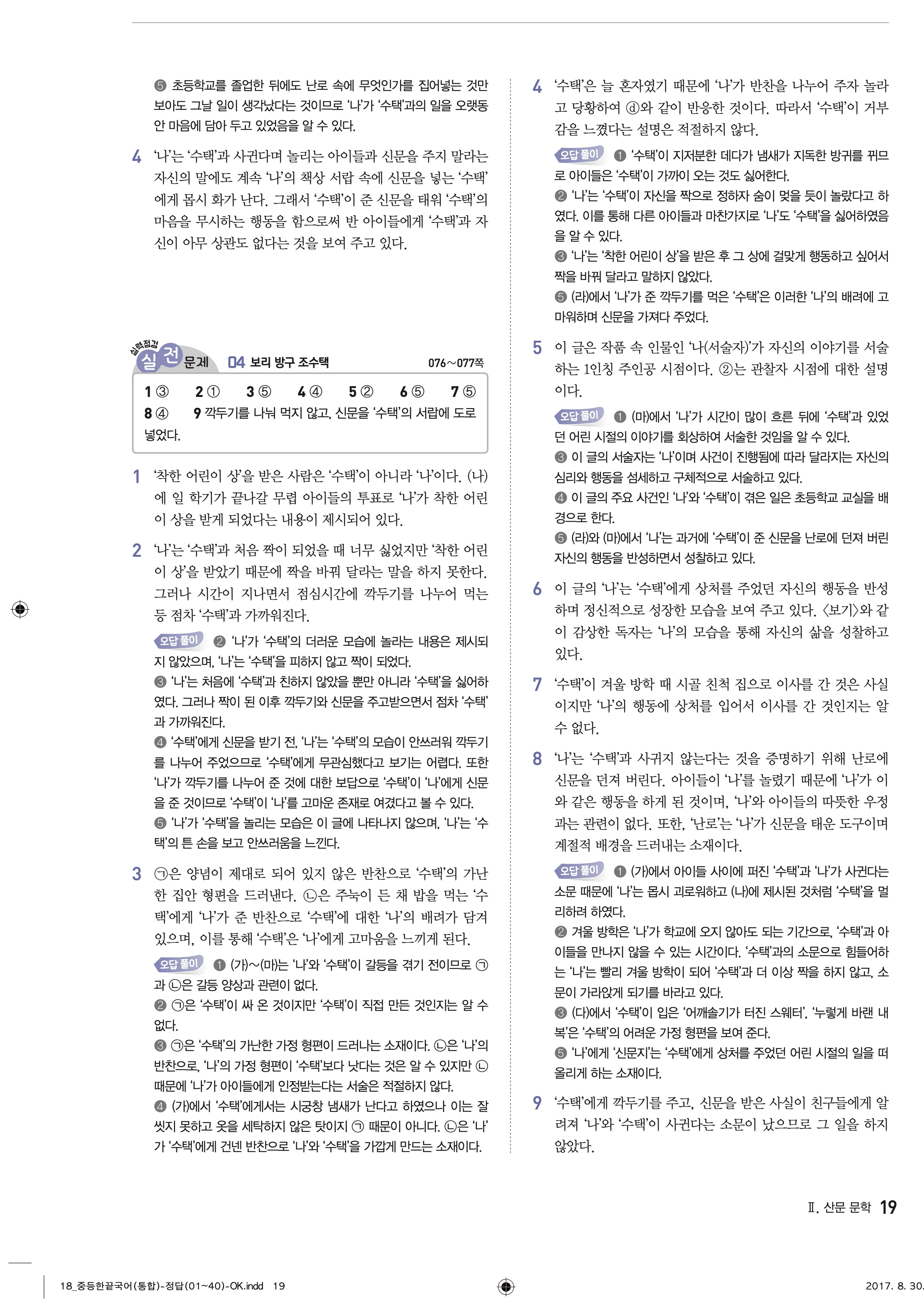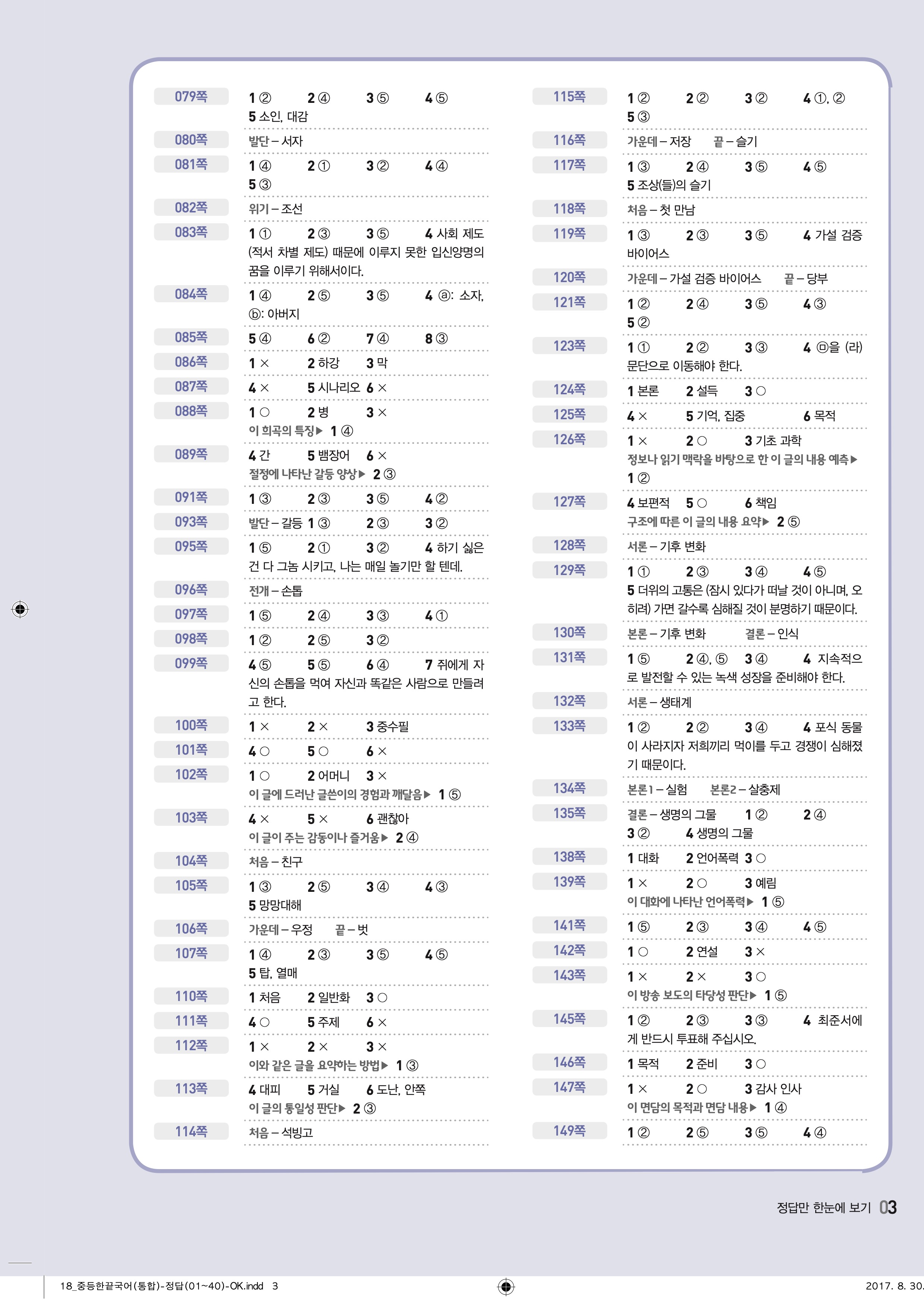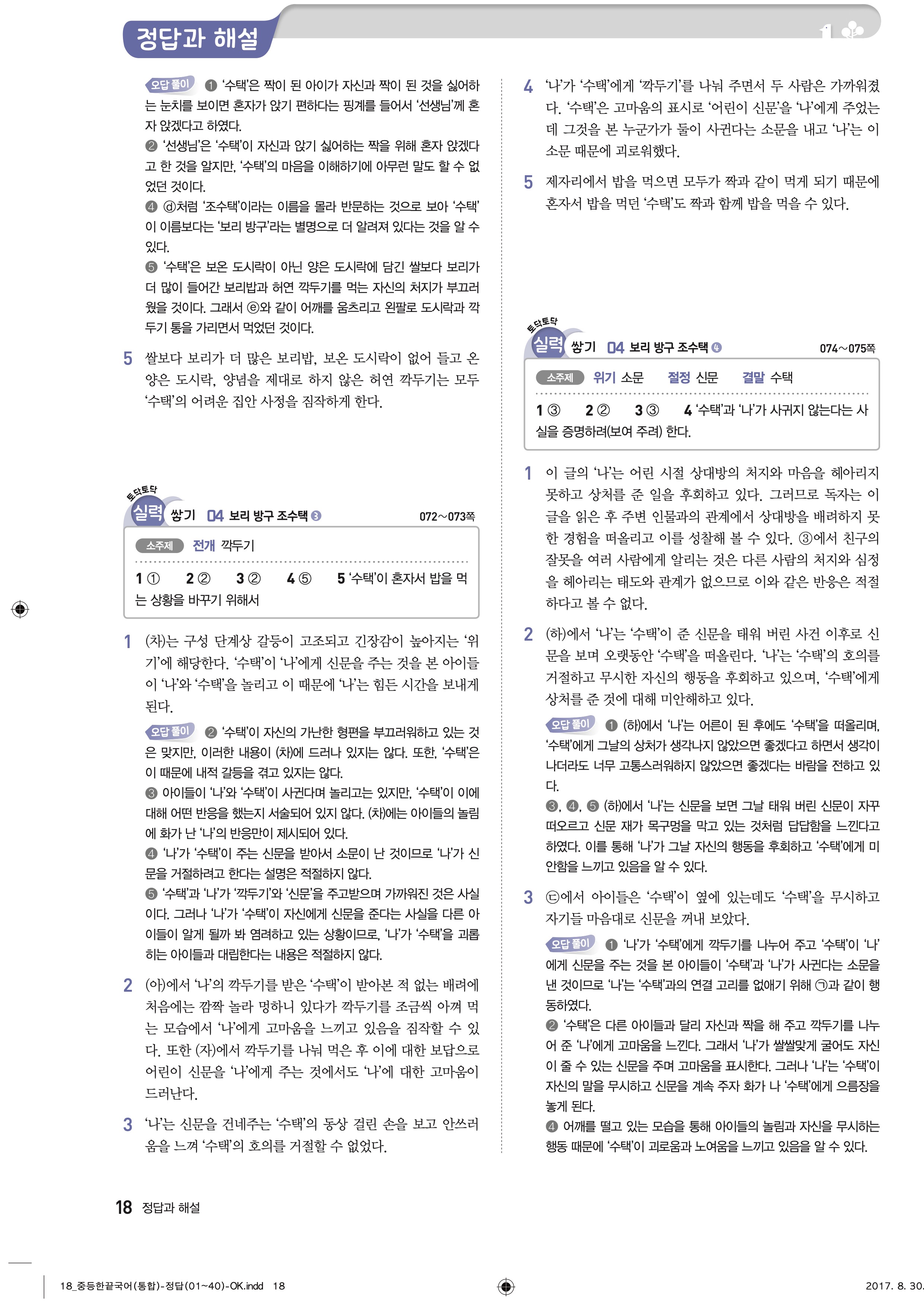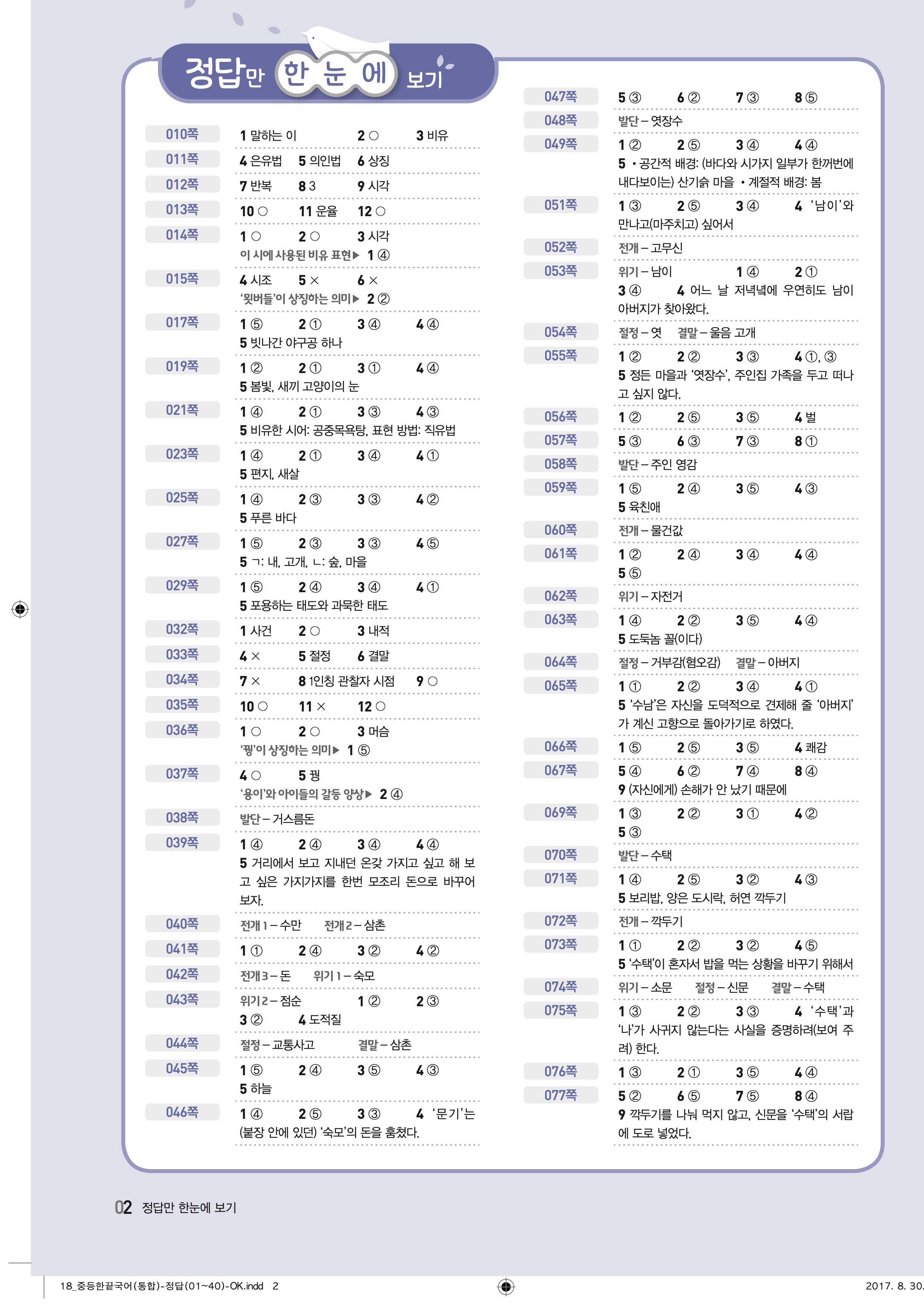 한끝 중등국어 통합편 1-1 답지 해설 바로보는 사진답지 빠른답지 모바일최적화