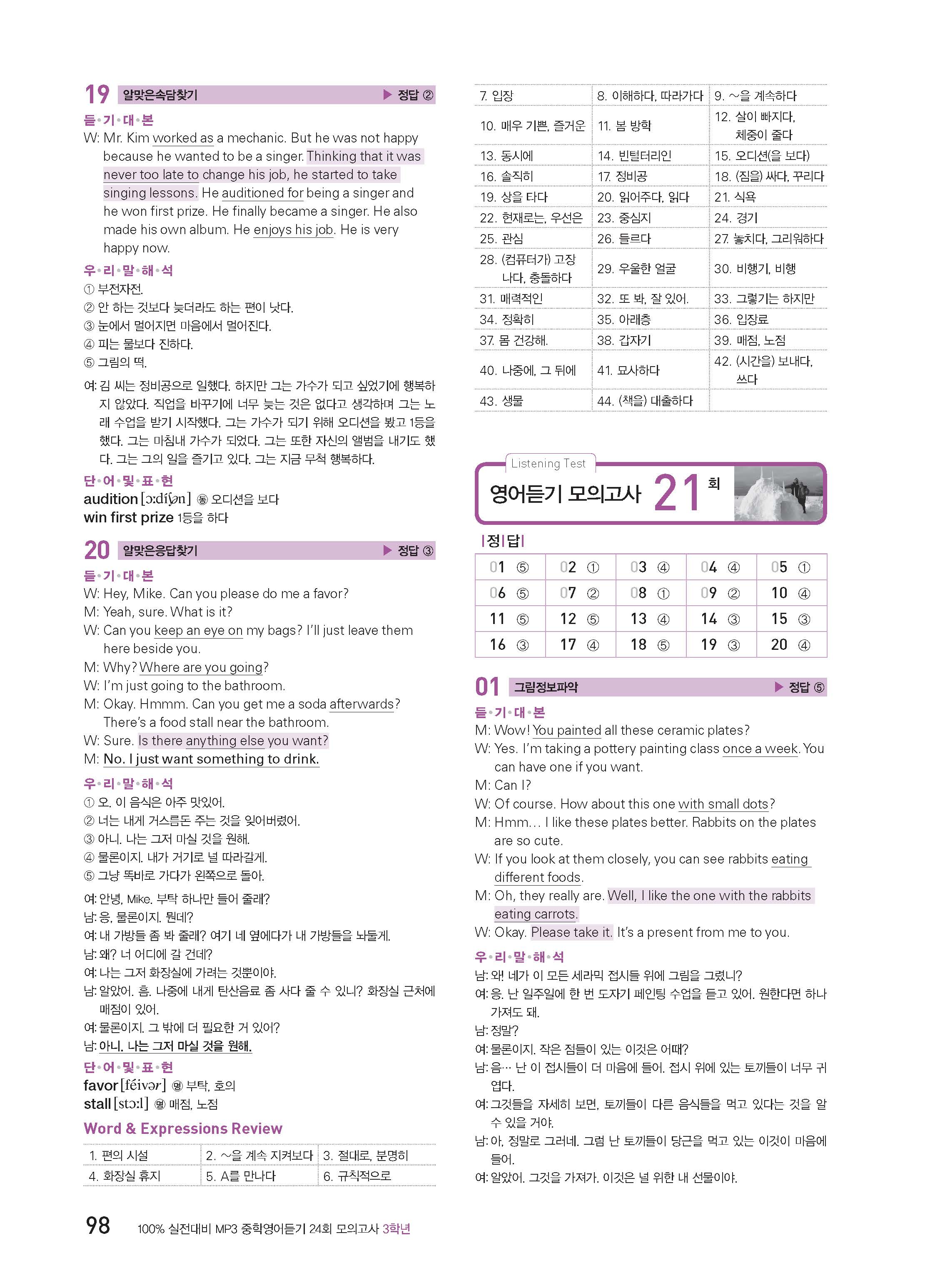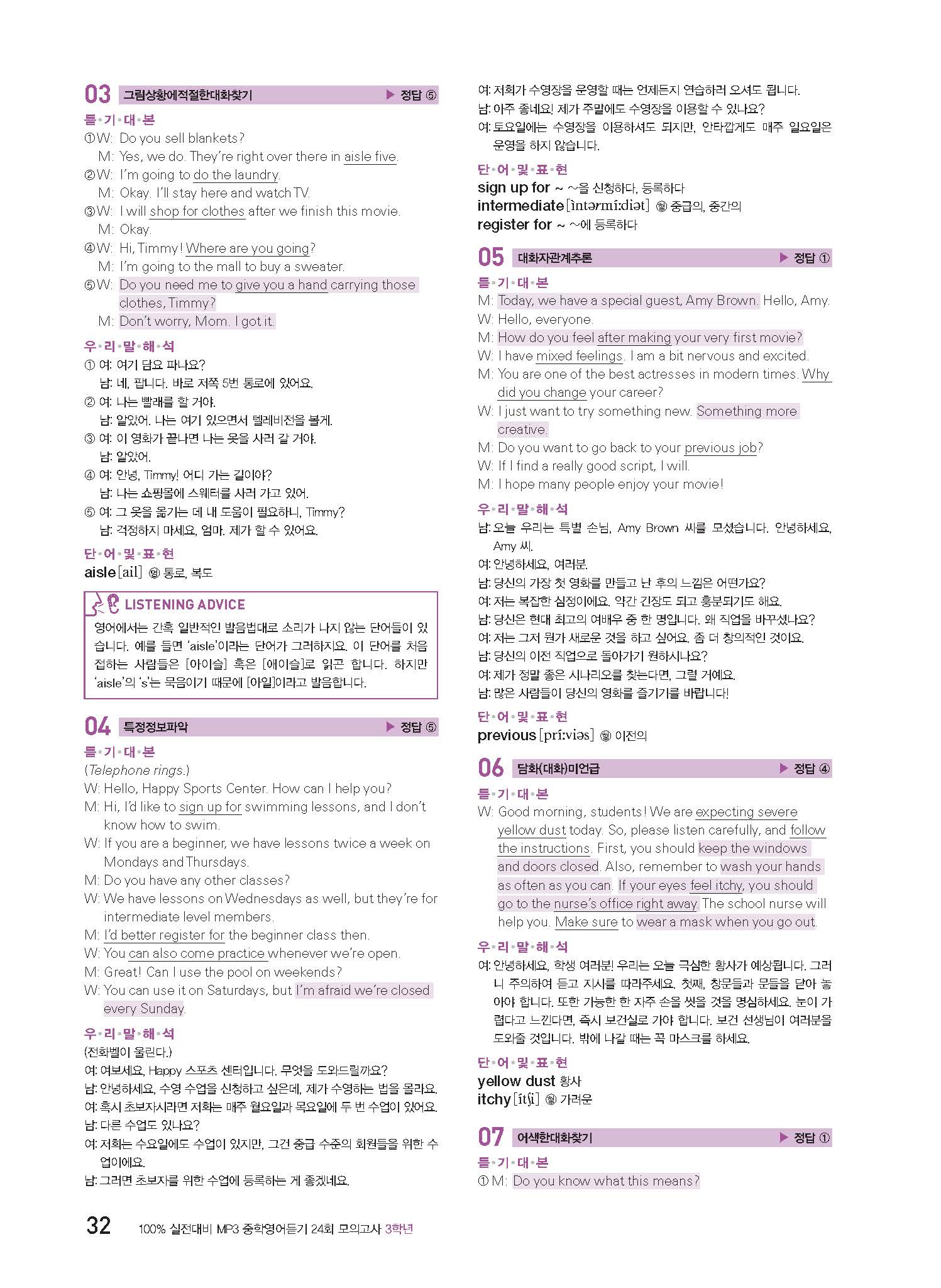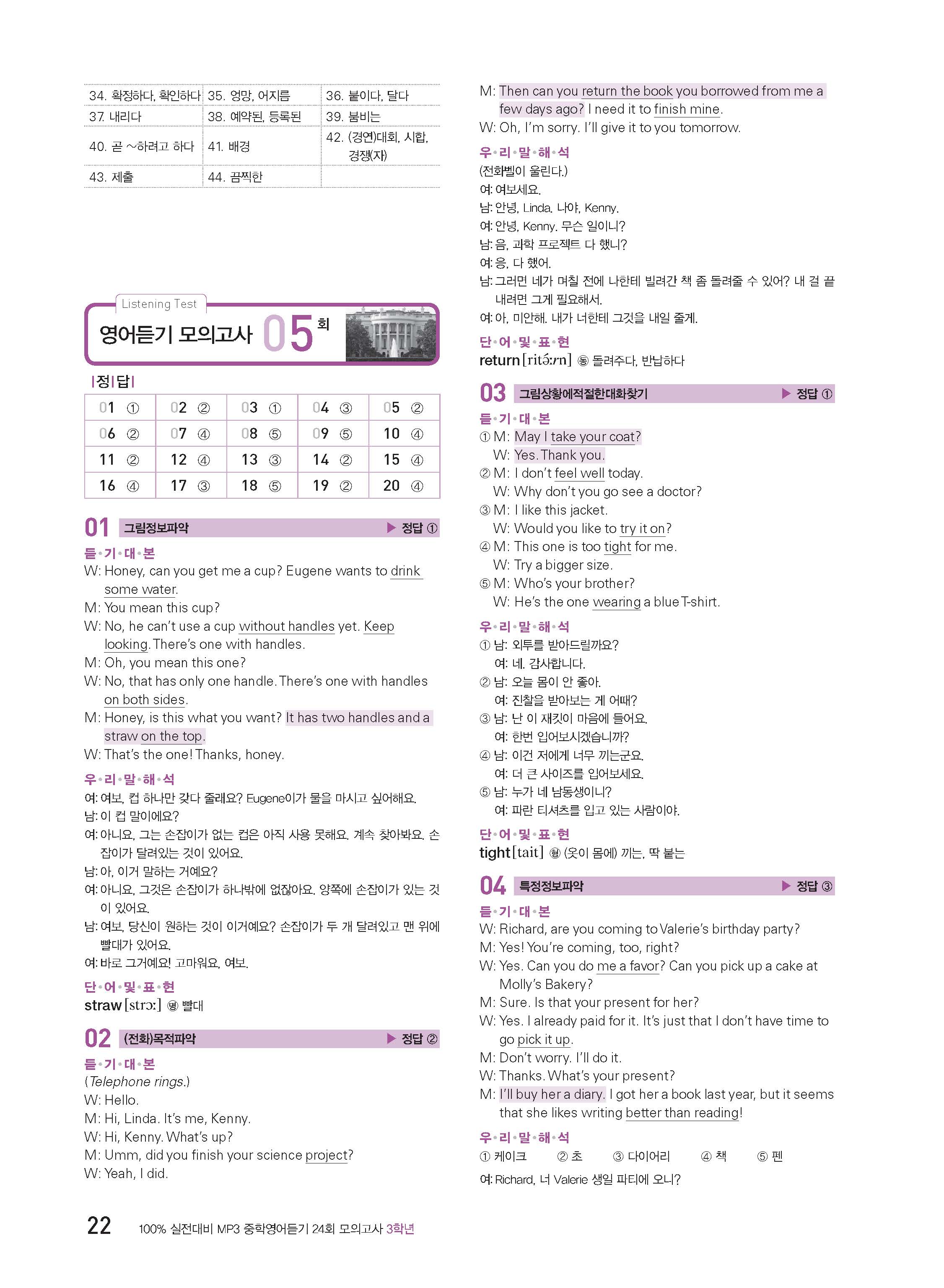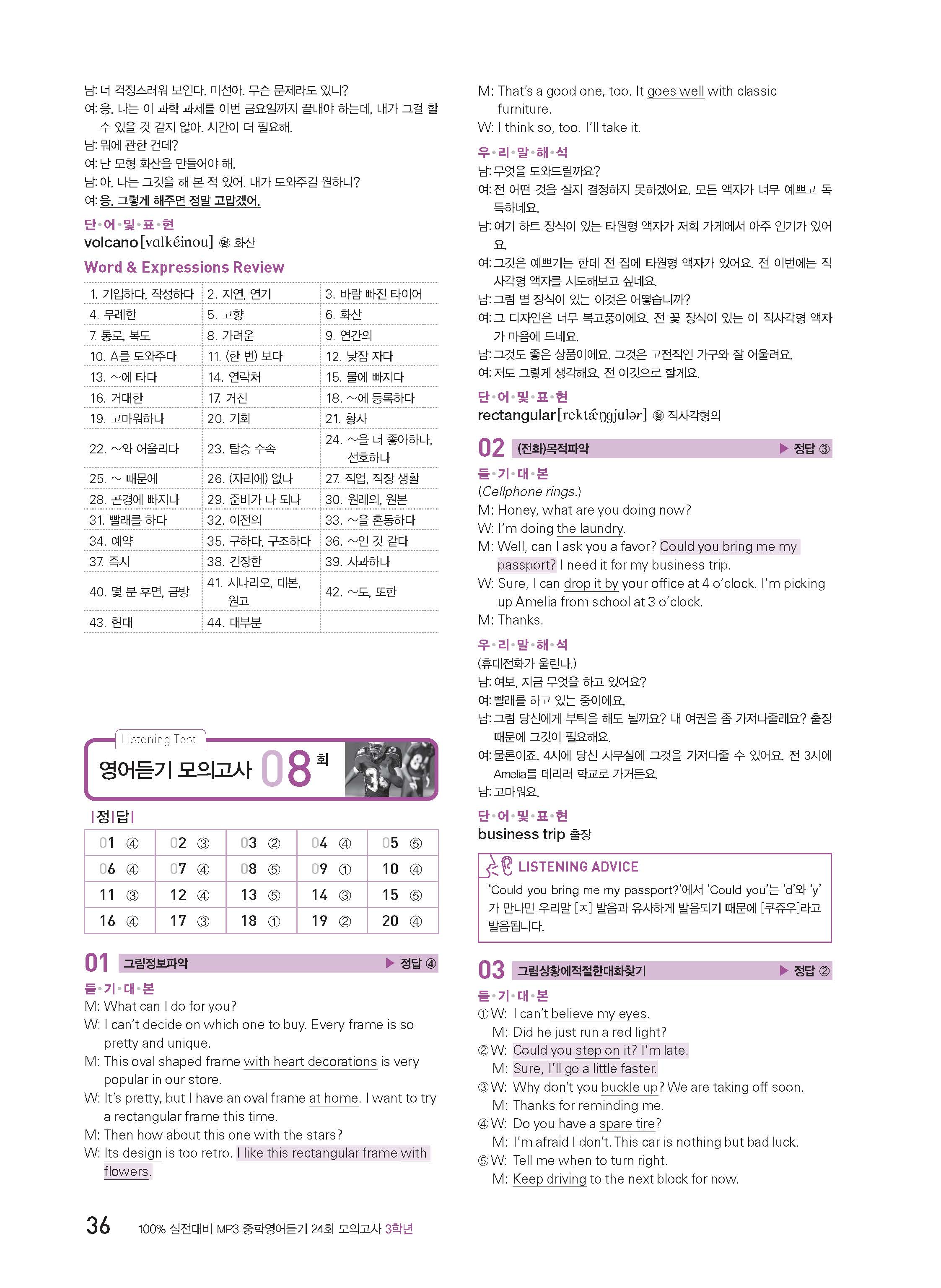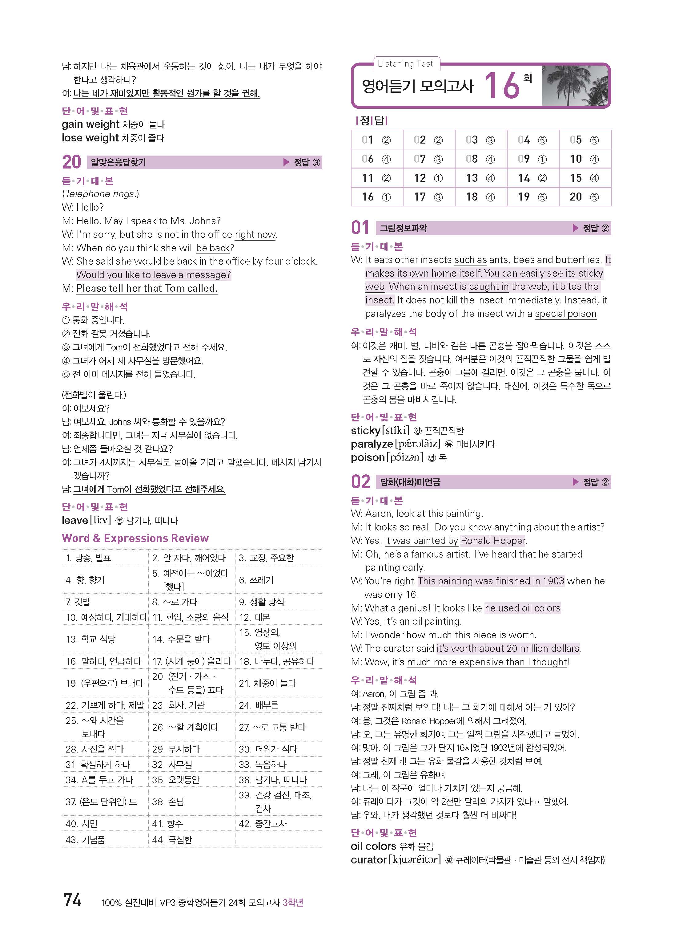 2021 100% 실전대비 MP3 중학영어듣기 24회 모의고사 3학년 답지 사진답지 빠른답지 모바일최적화