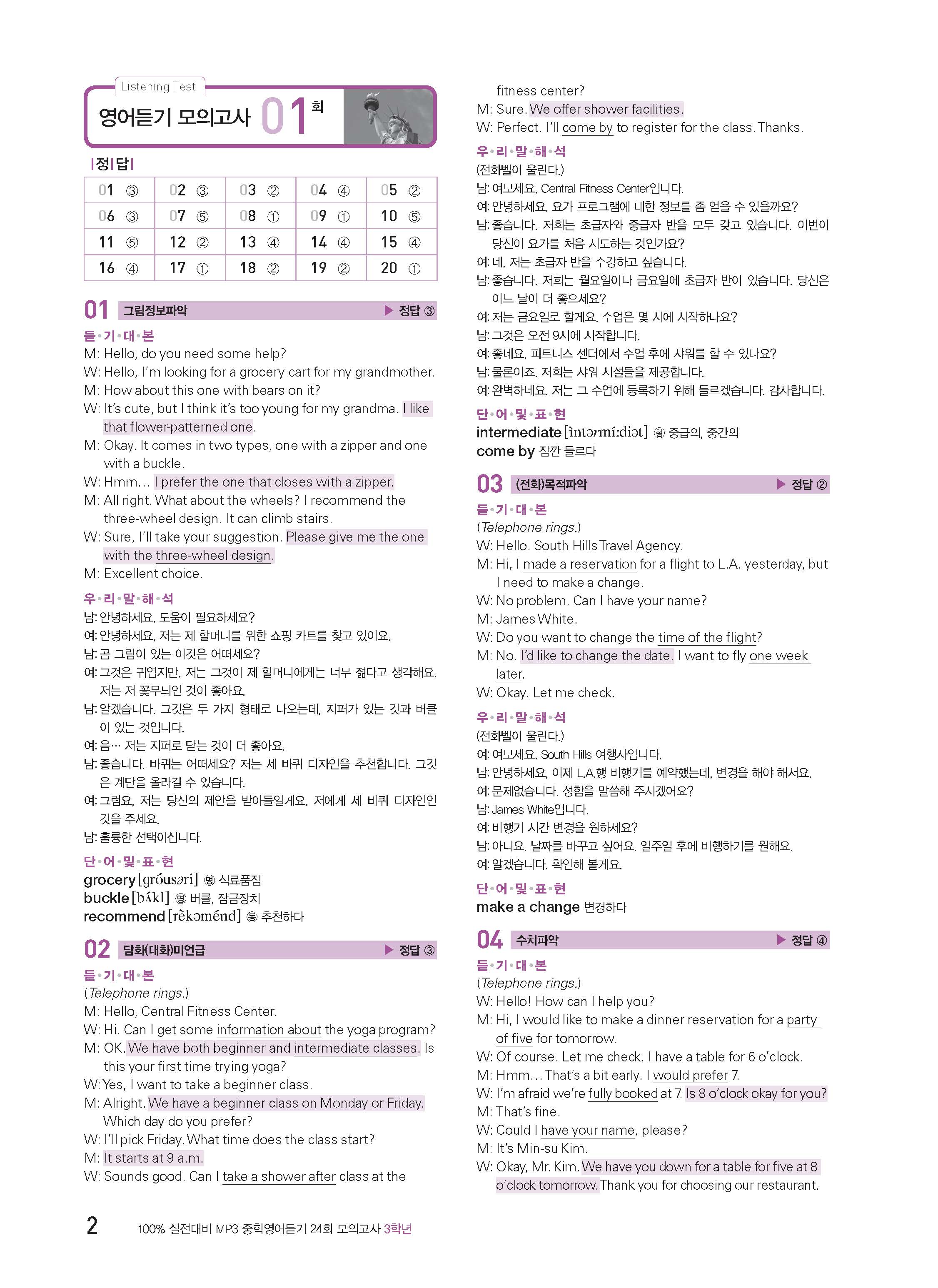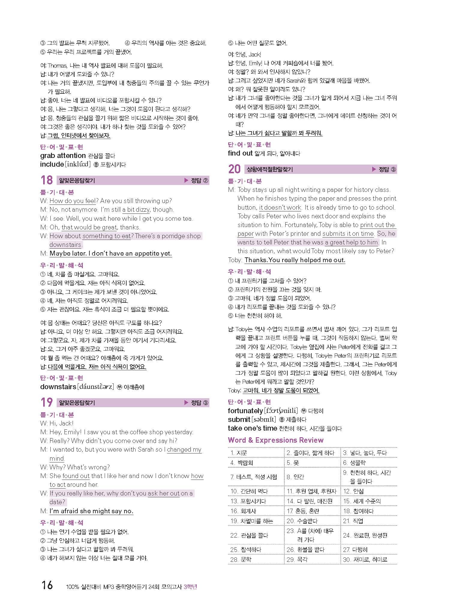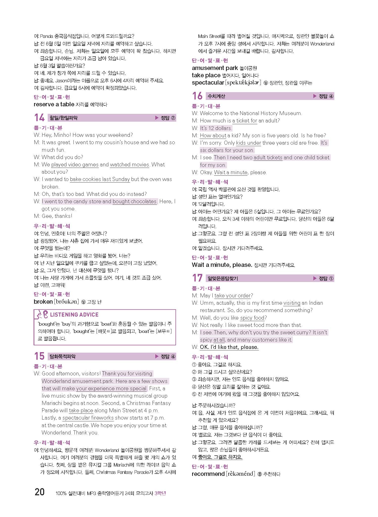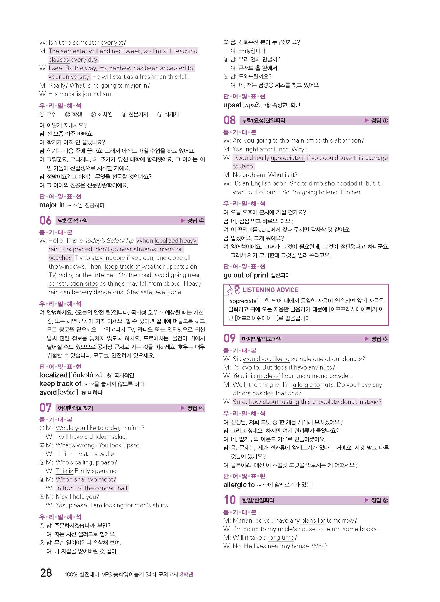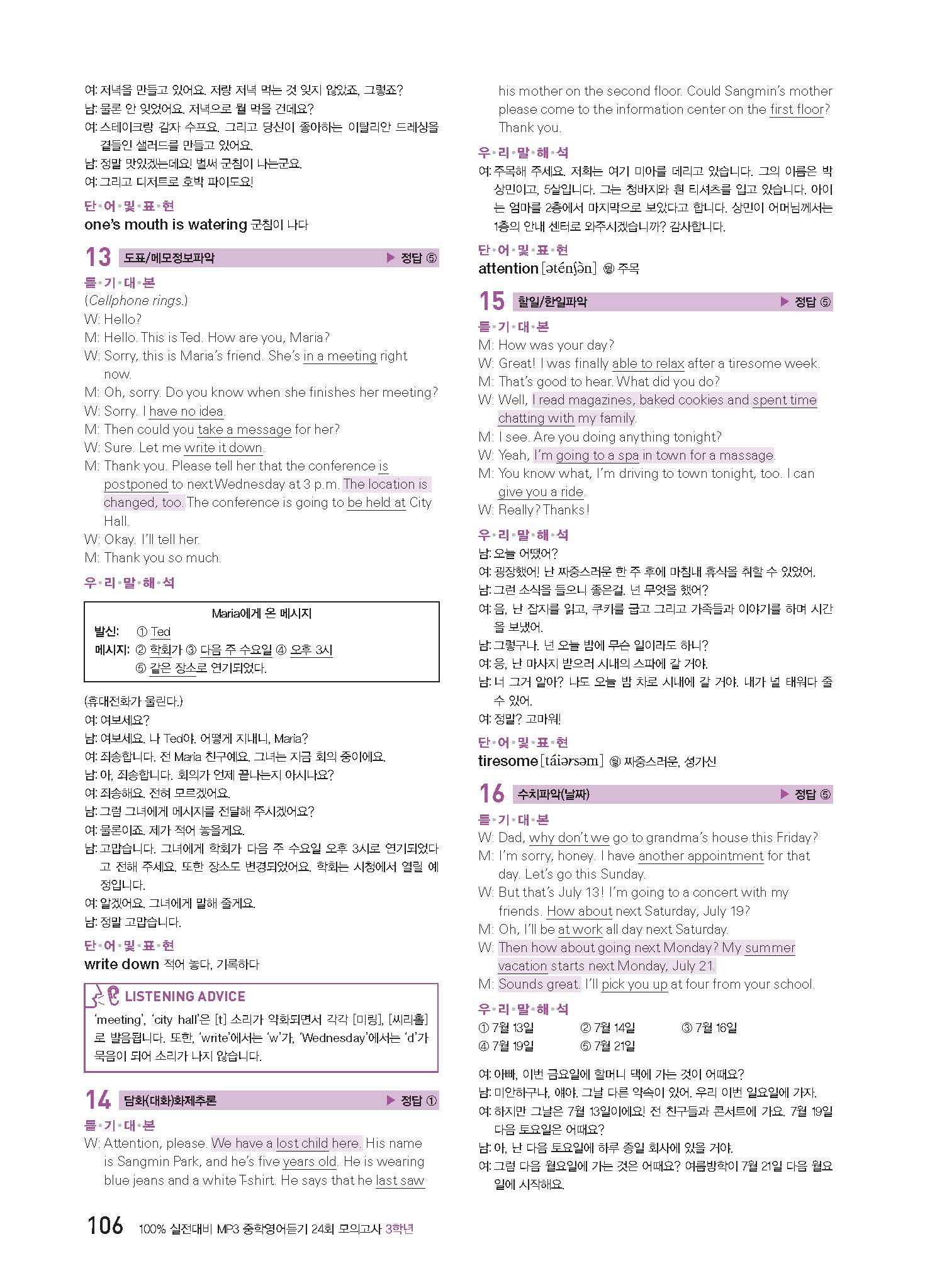 2021 100% 실전대비 MP3 중학영어듣기 24회 모의고사 3학년 답지 사진답지 빠른답지 모바일최적화