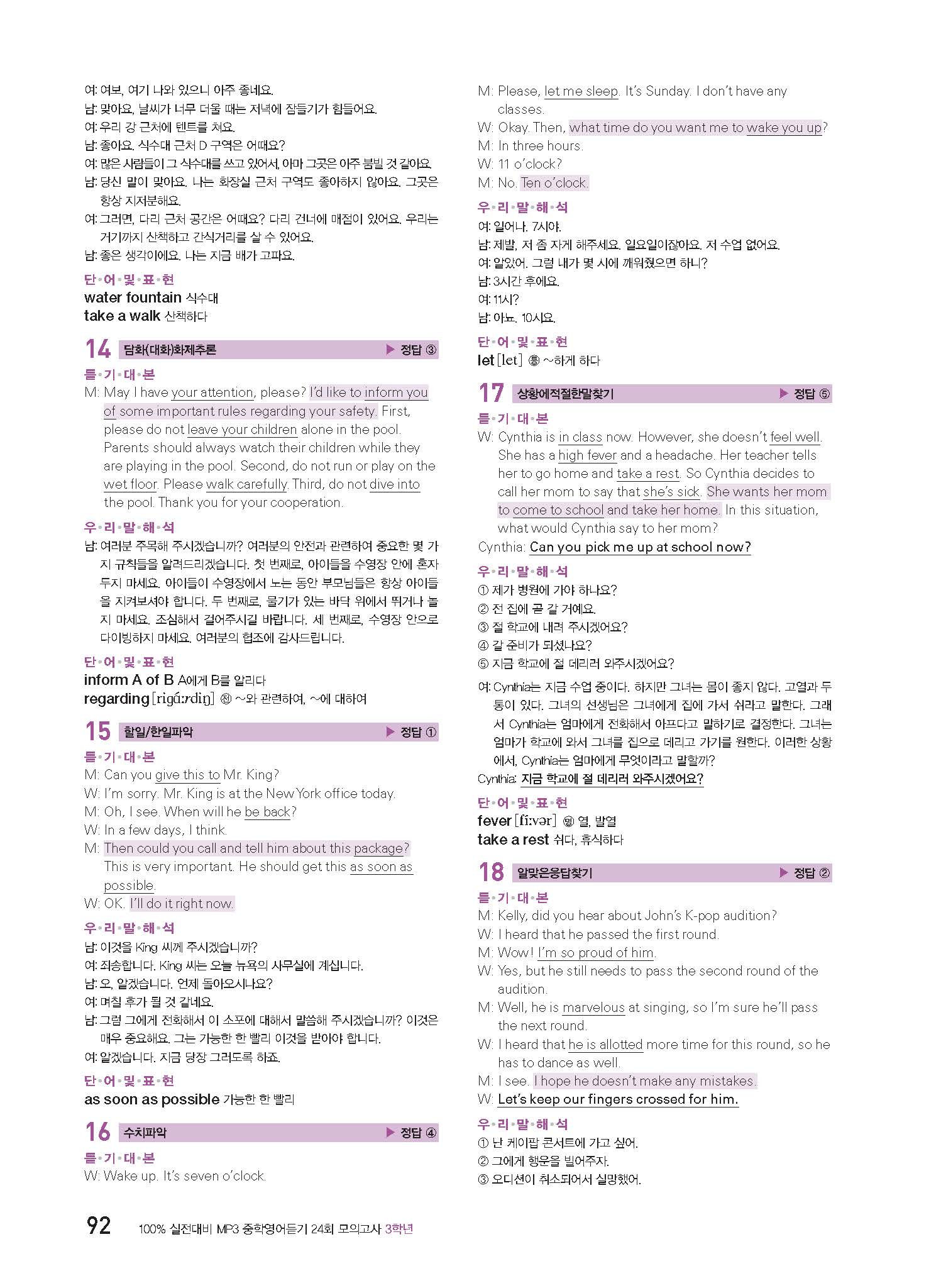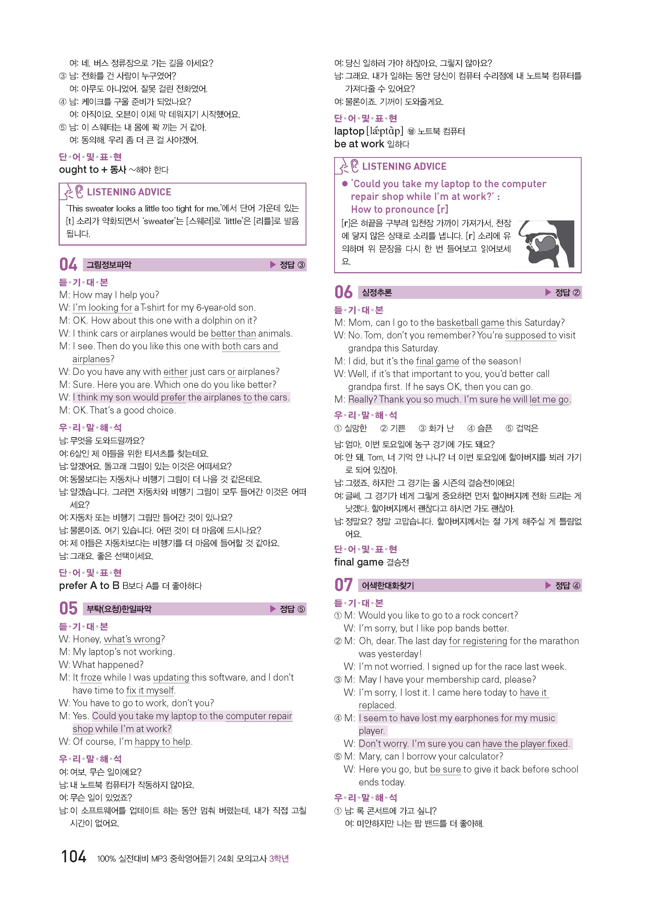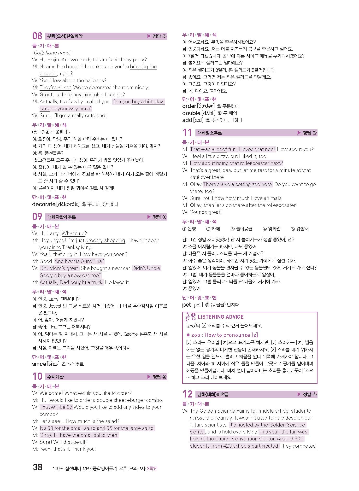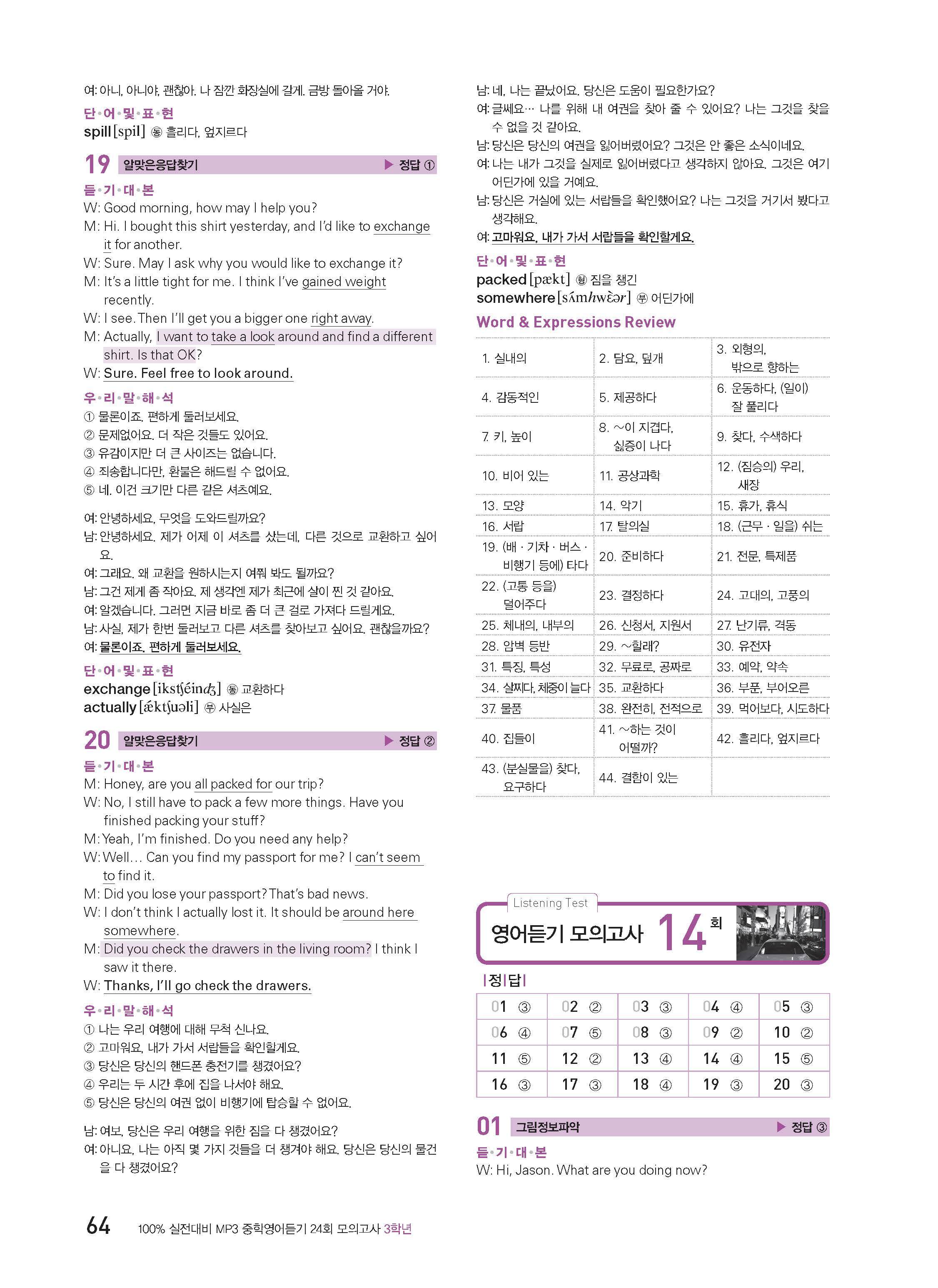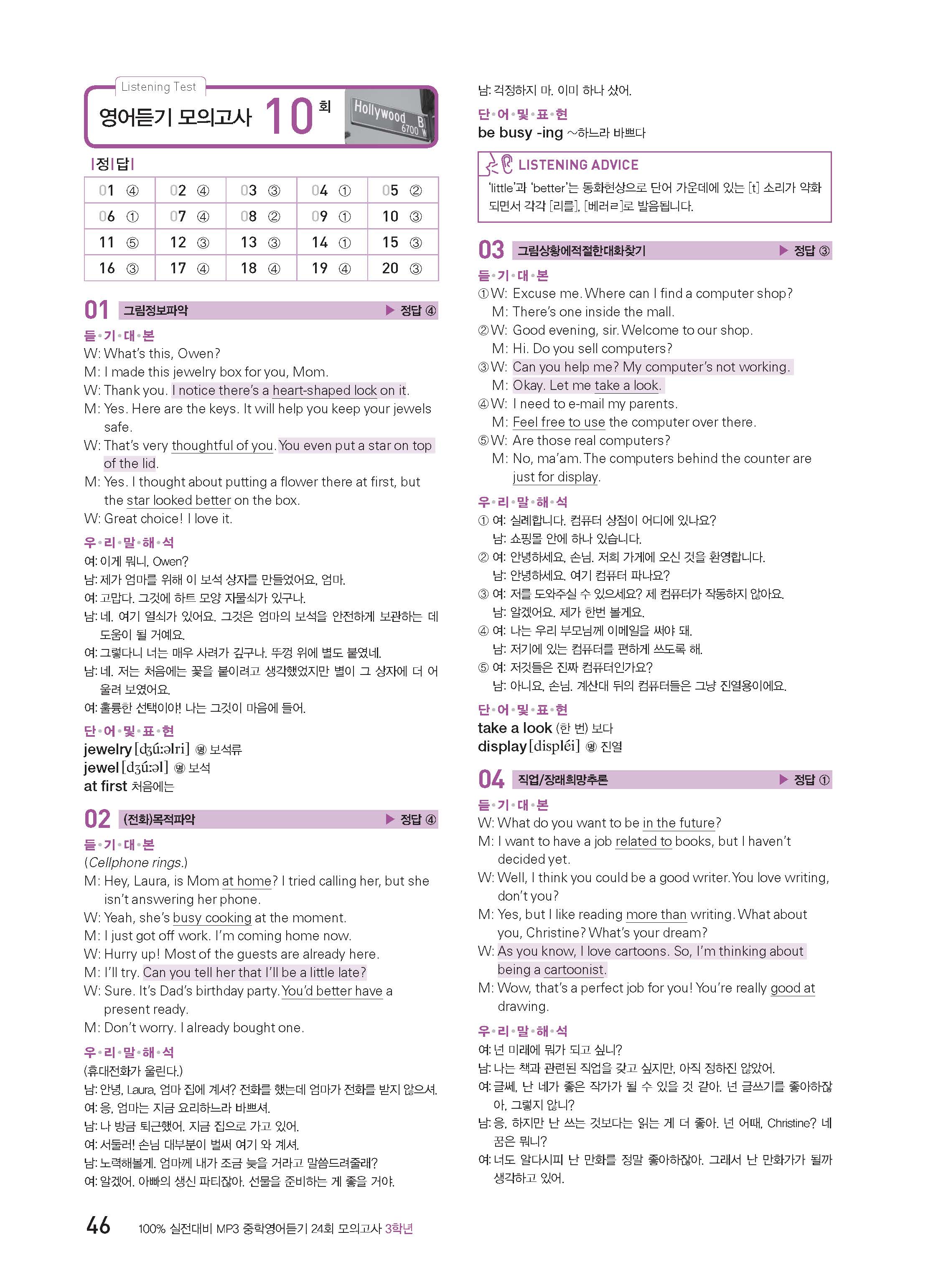 2021 100% 실전대비 MP3 중학영어듣기 24회 모의고사 3학년 답지 사진답지 빠른답지 모바일최적화