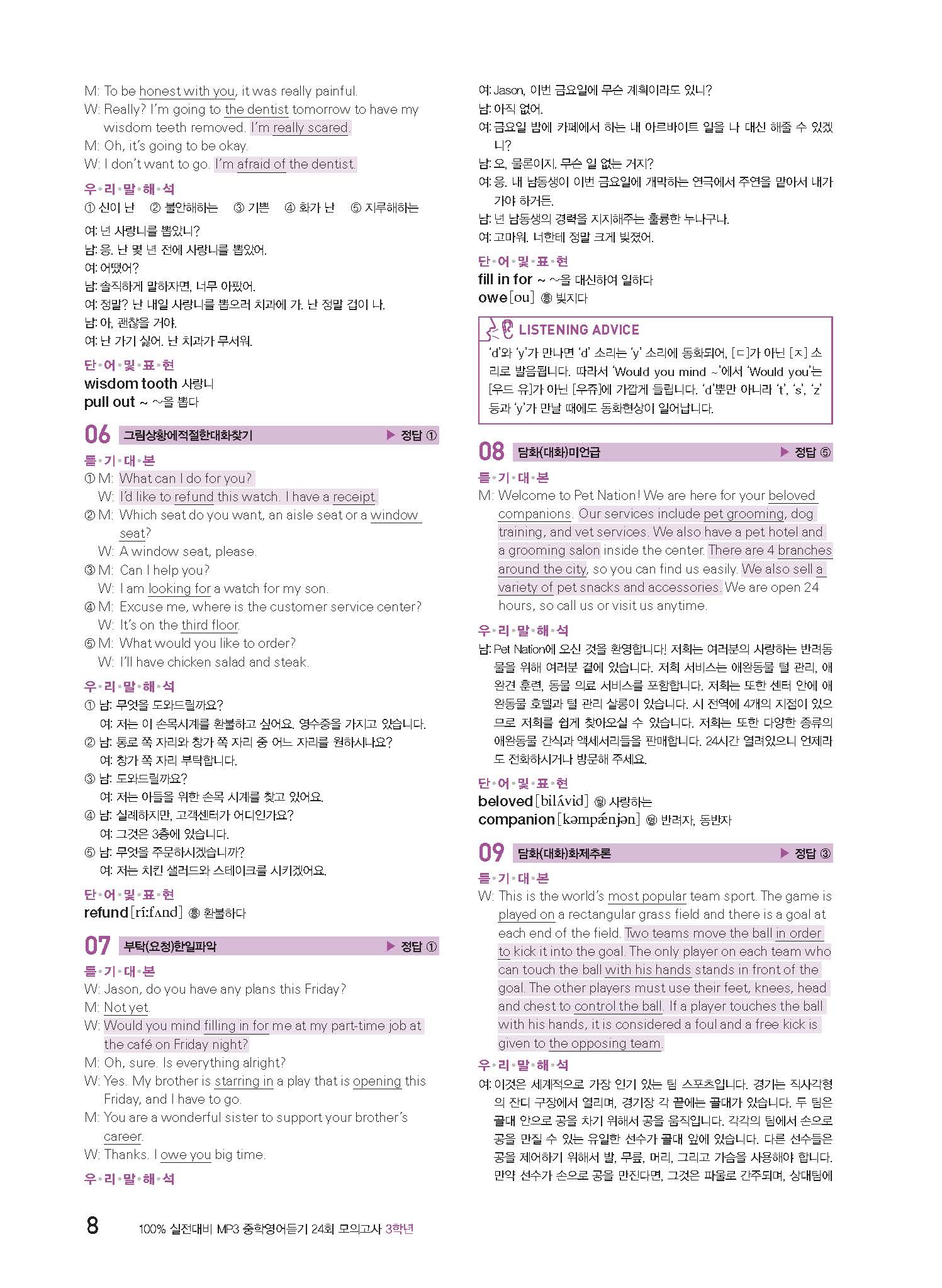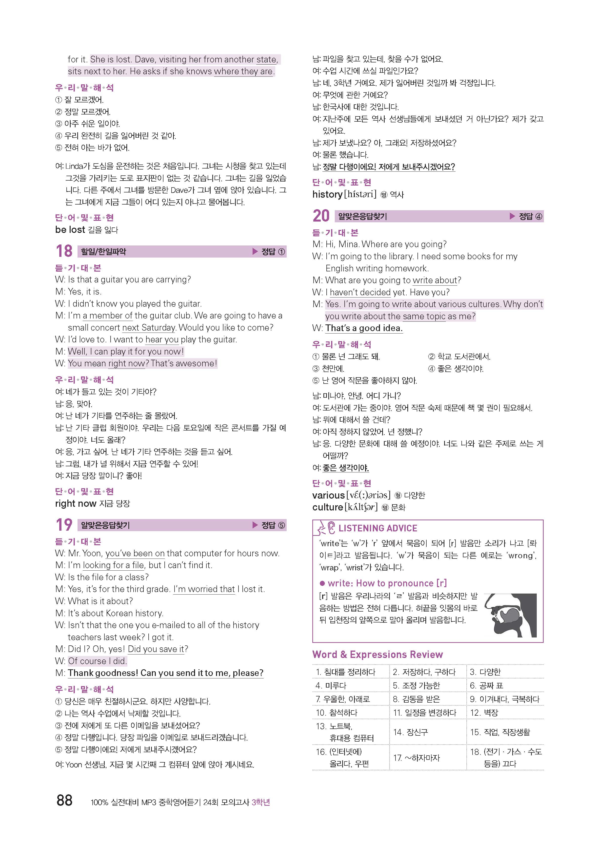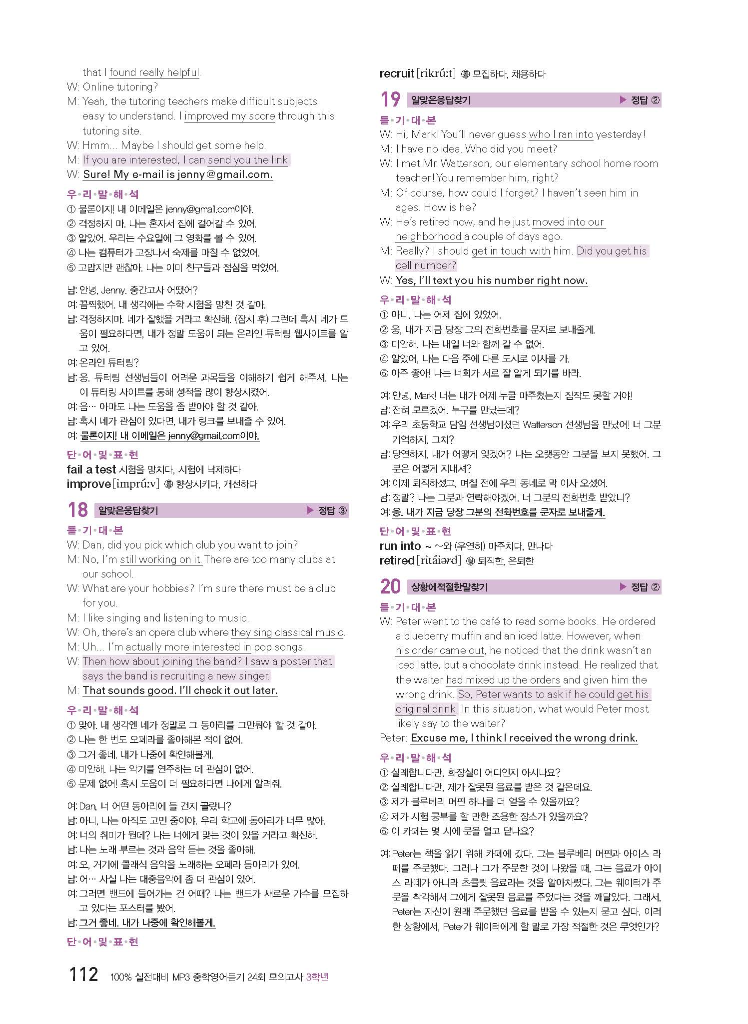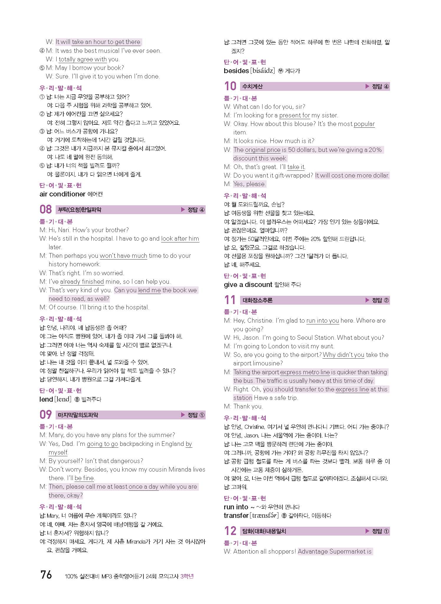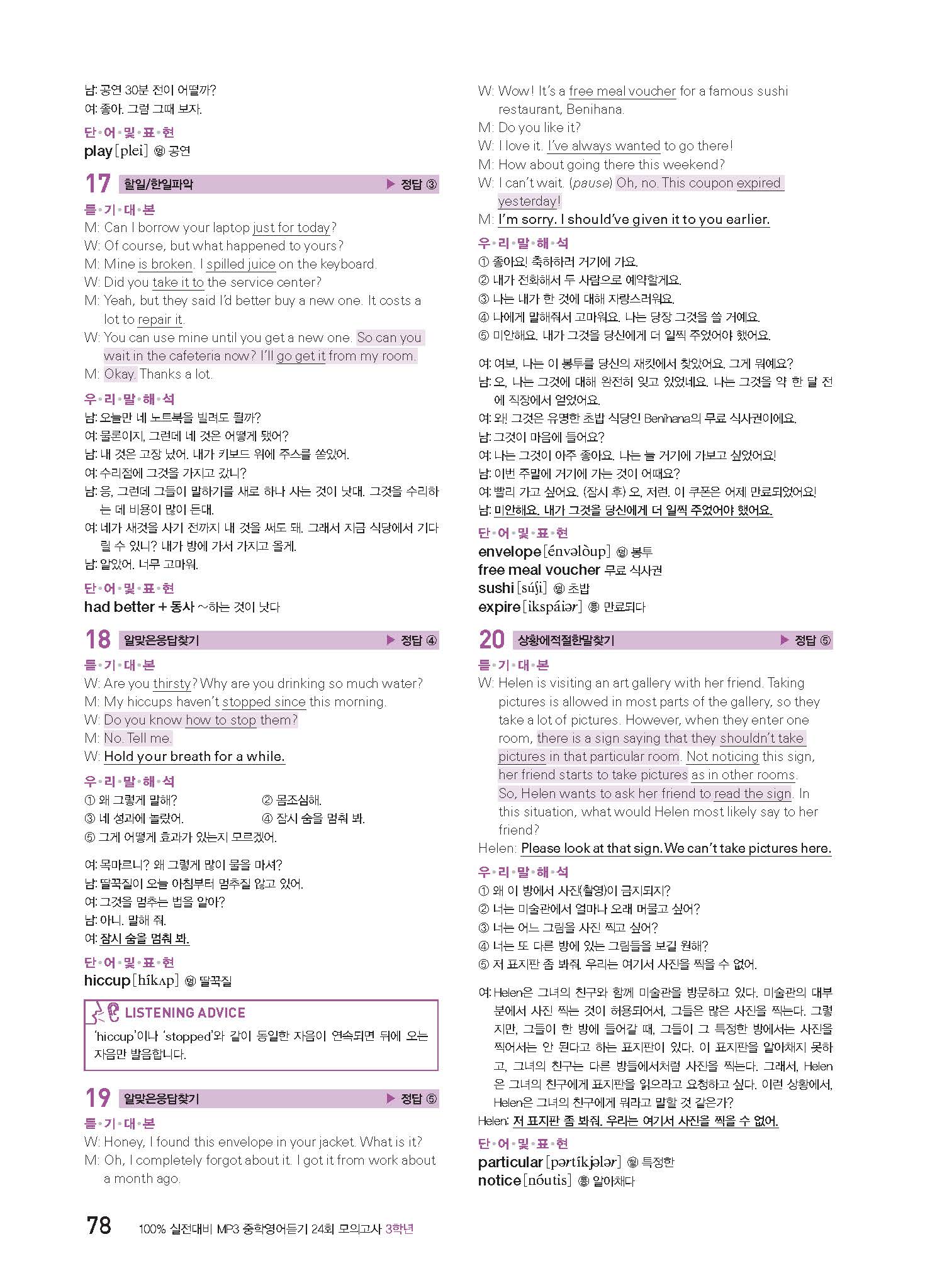 2021 100% 실전대비 MP3 중학영어듣기 24회 모의고사 3학년 답지 사진답지 빠른답지 모바일최적화