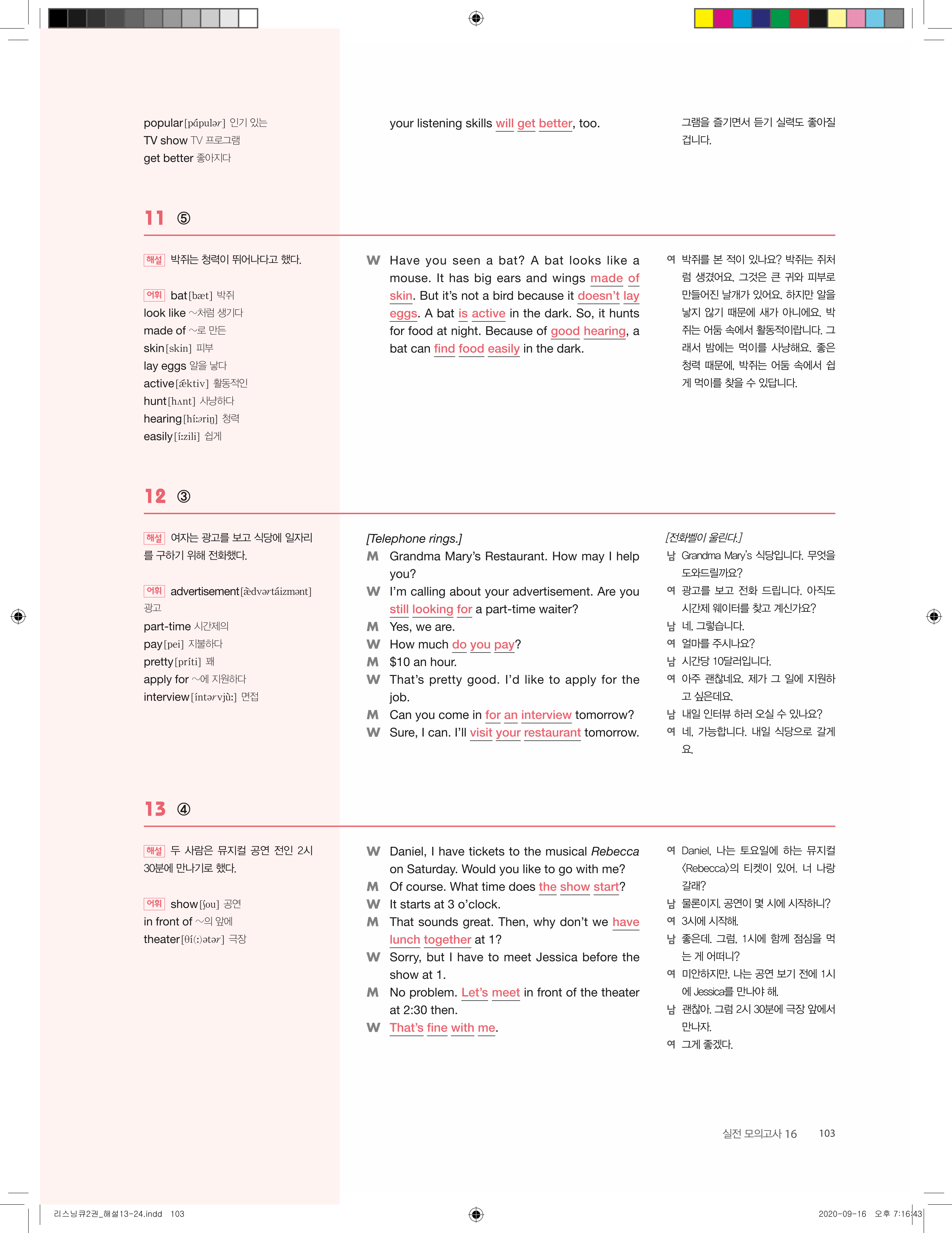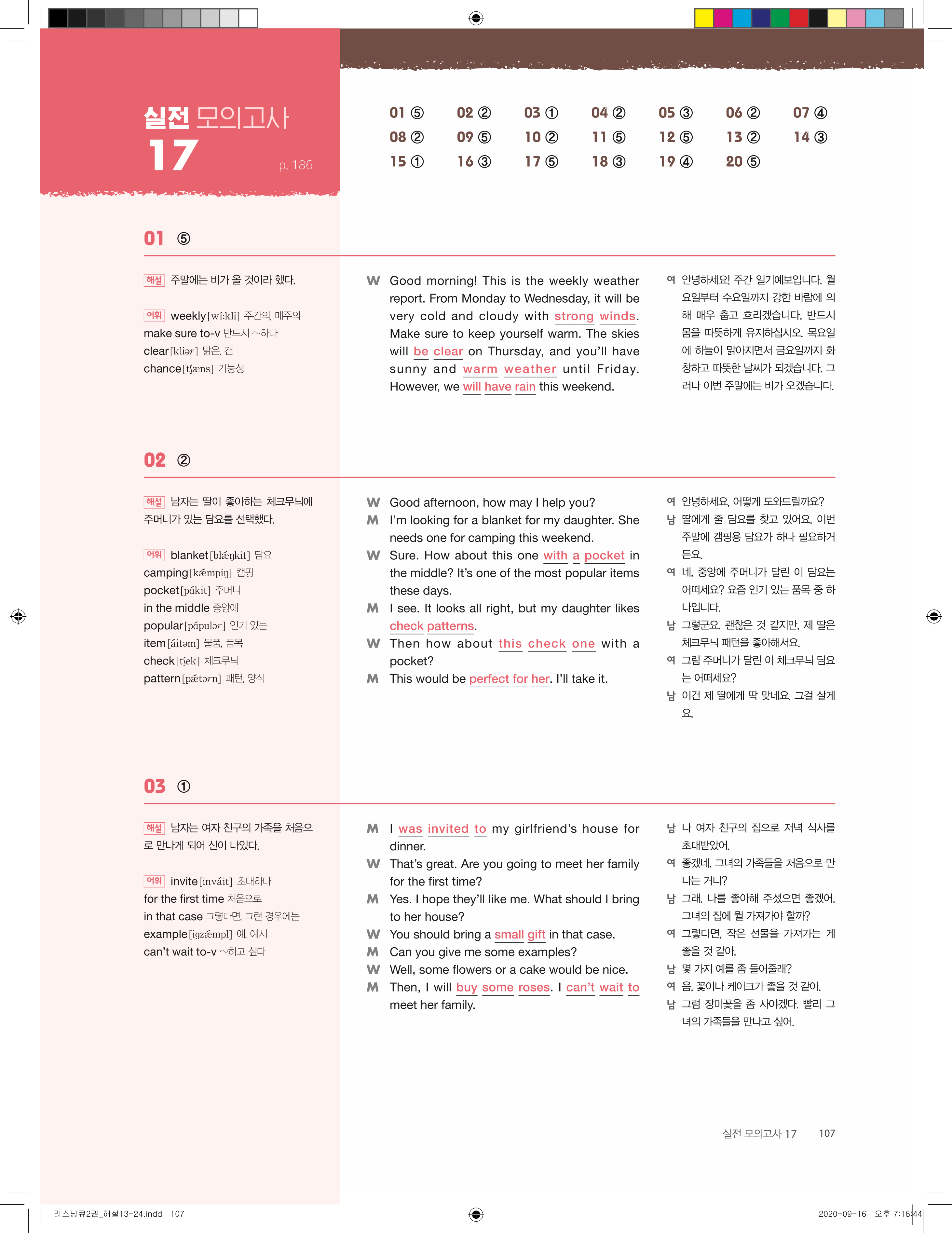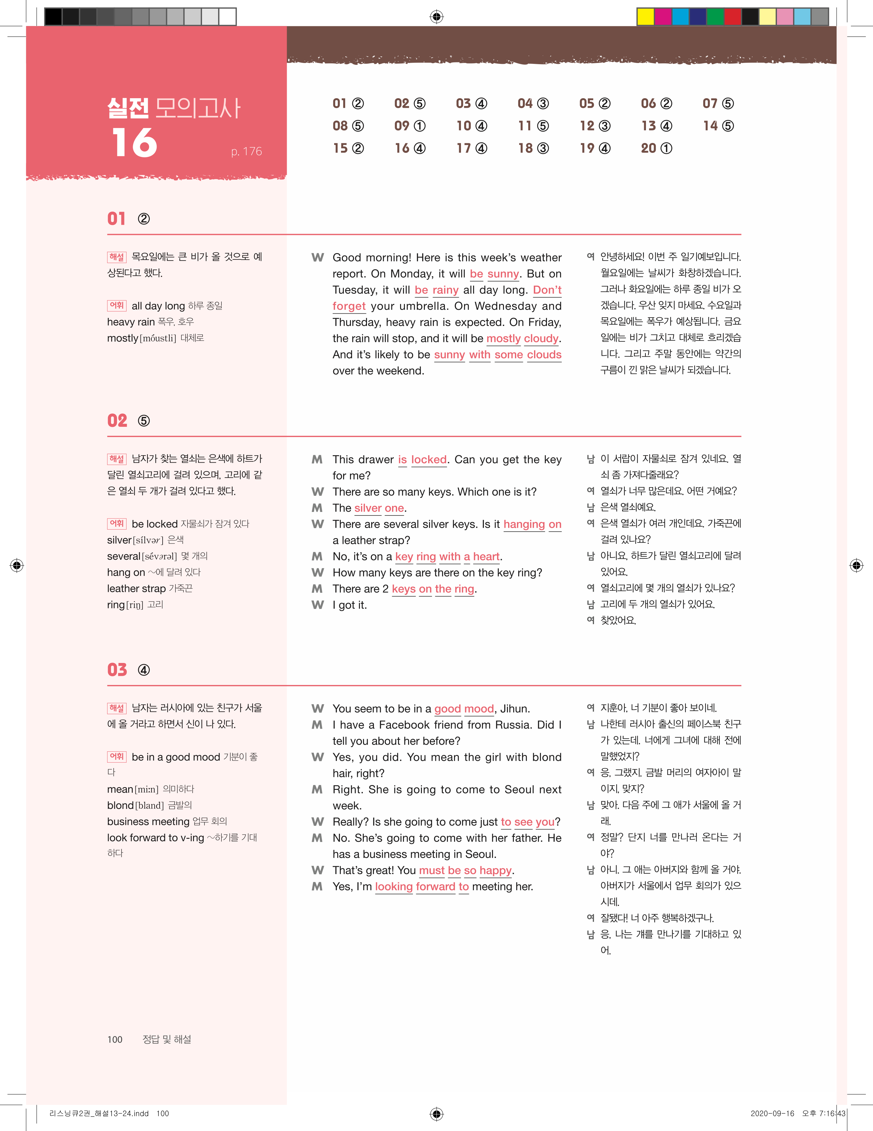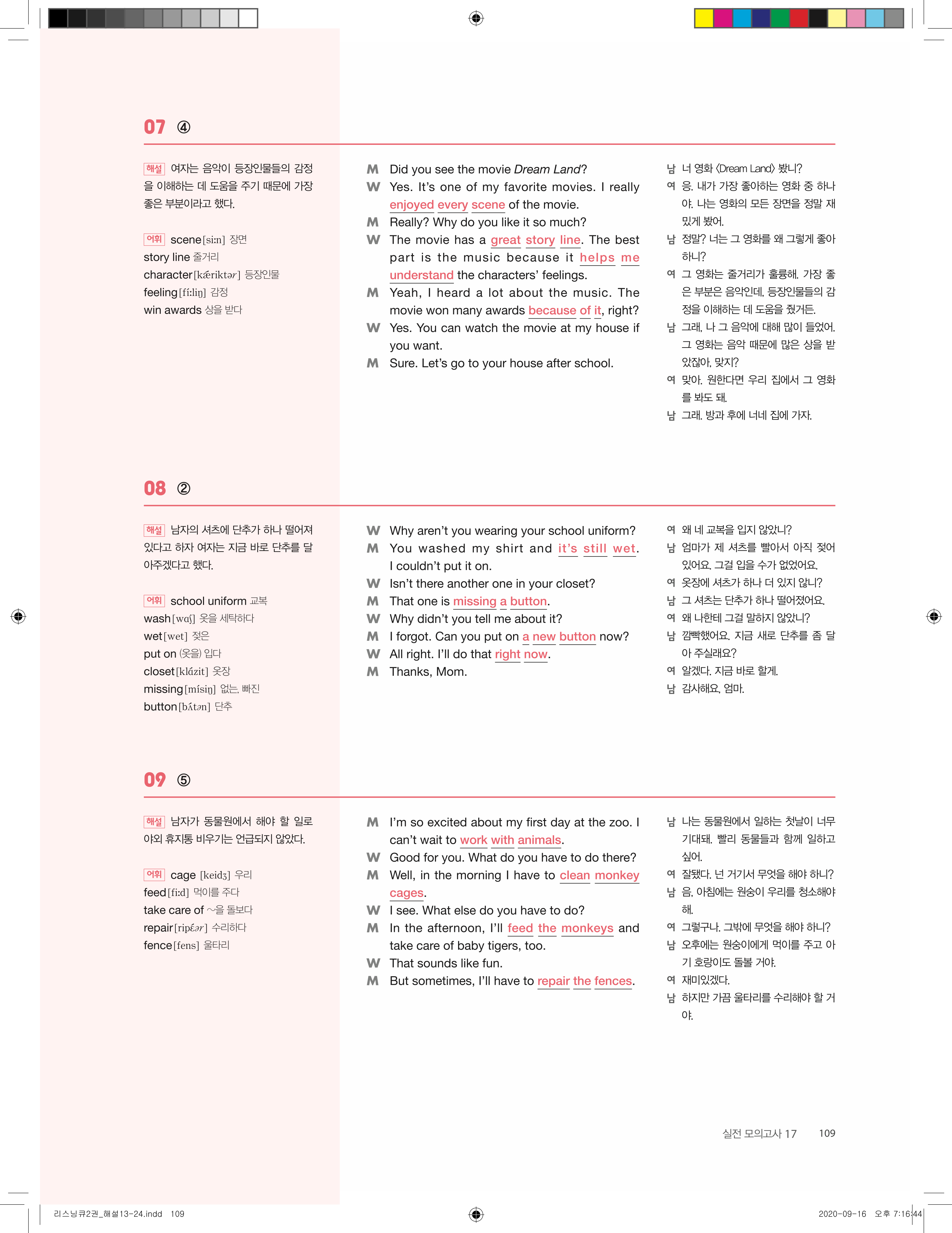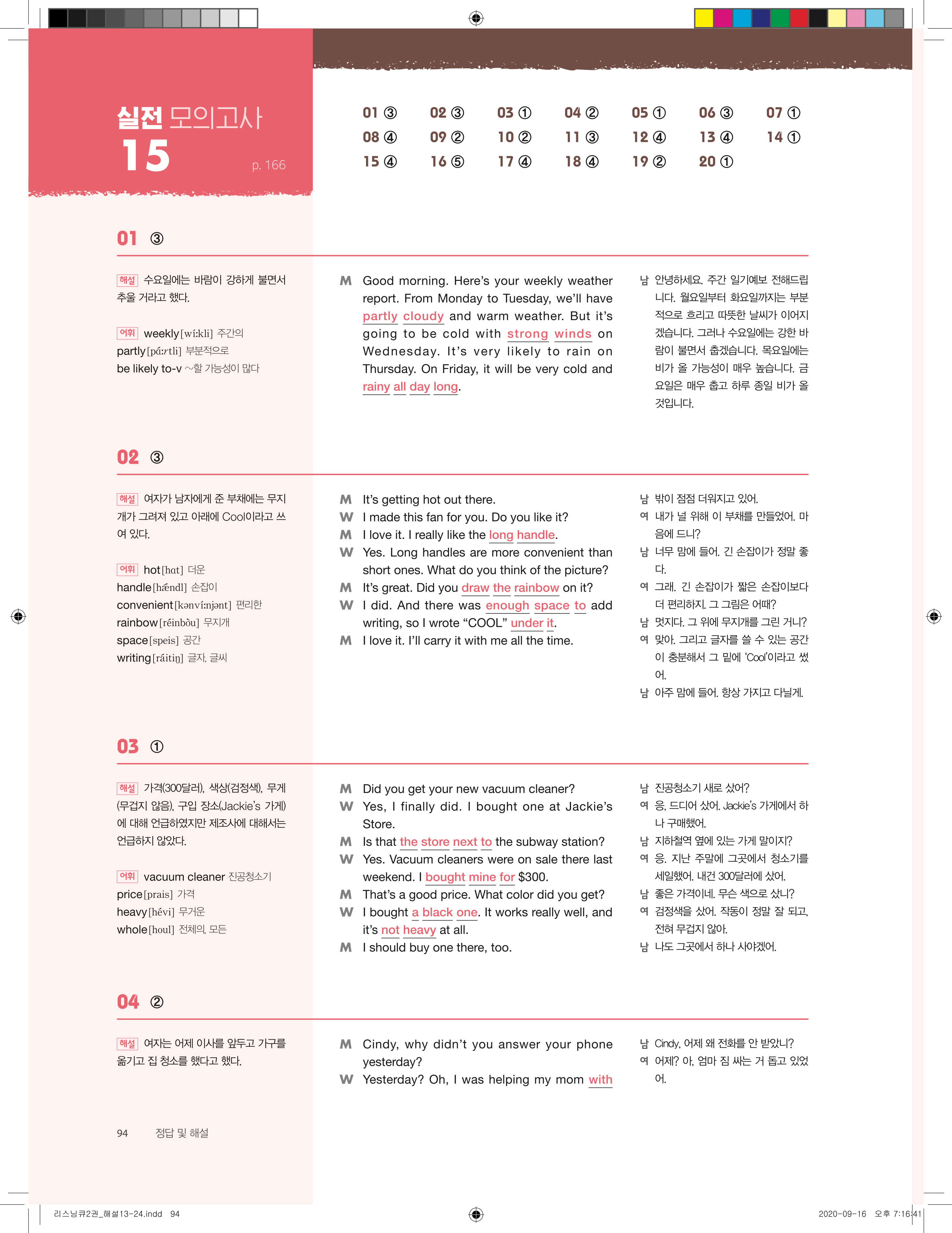 세듀 리스닝큐 중학영어듣기 모의고사24회 레벨2 답지 빠른답지 다운없이 바로보는 사진답지 모바일최적화