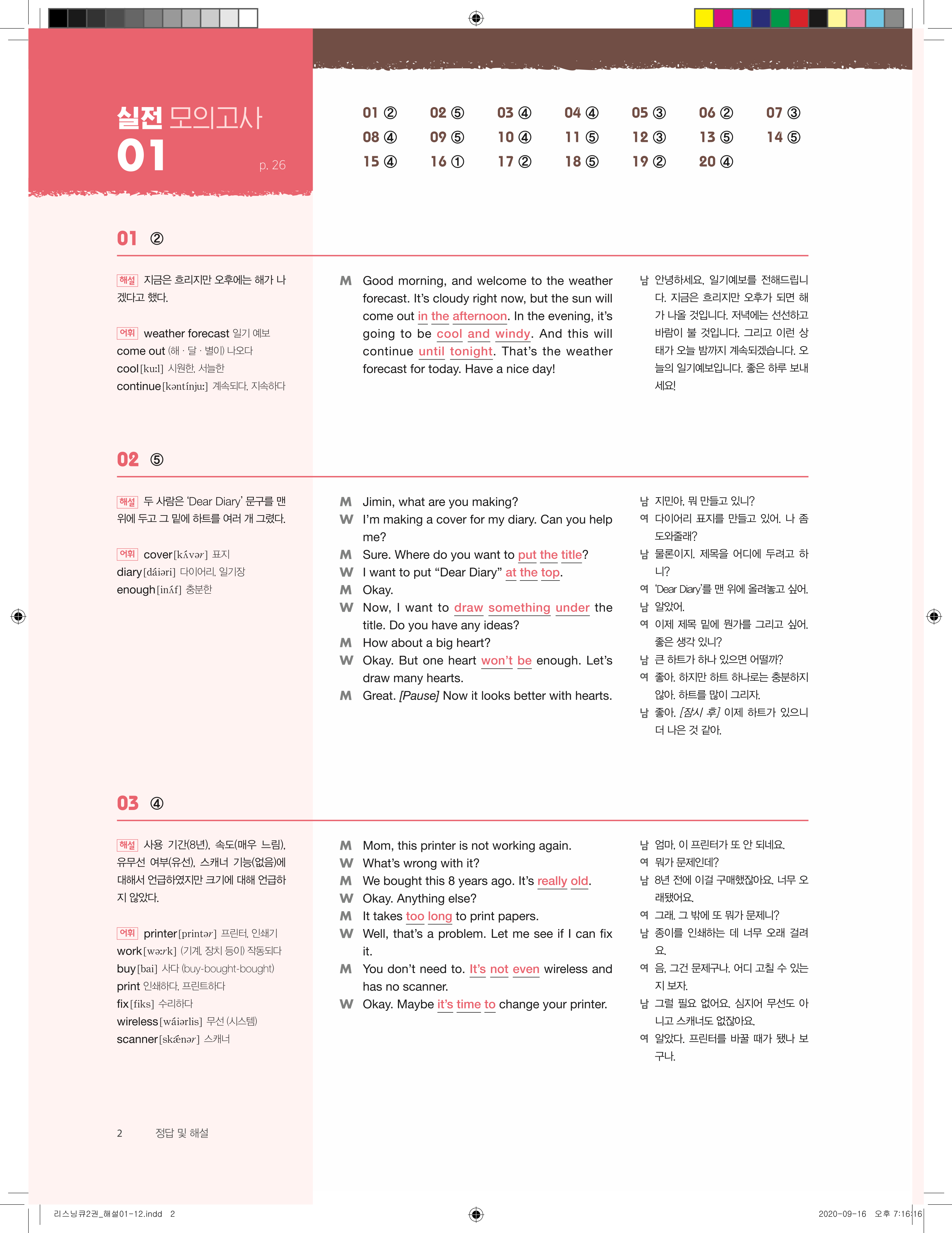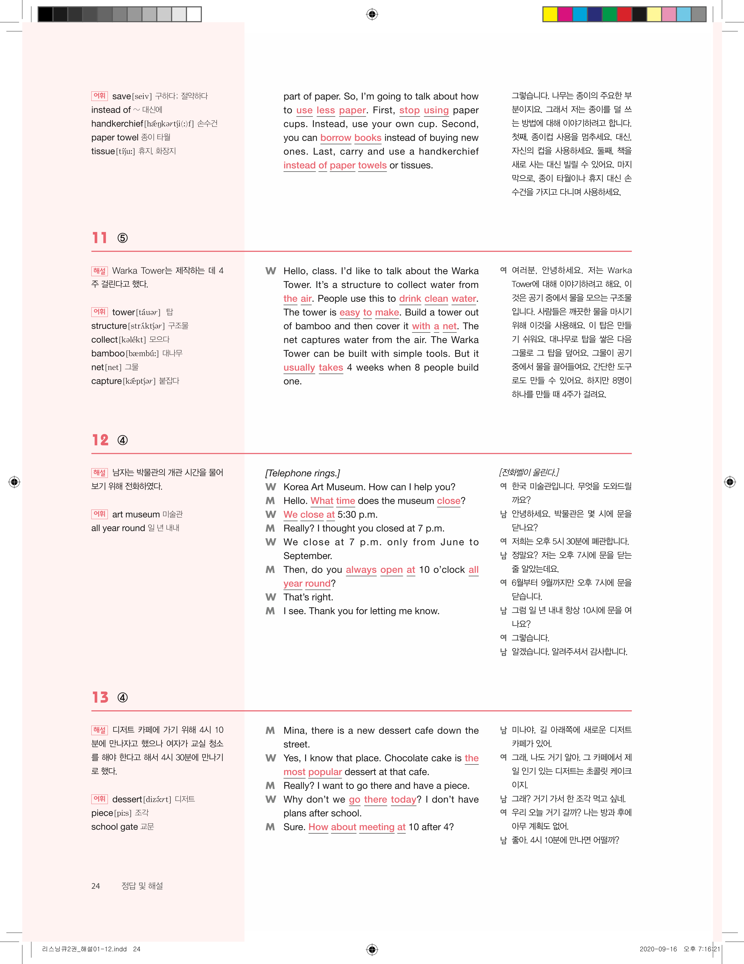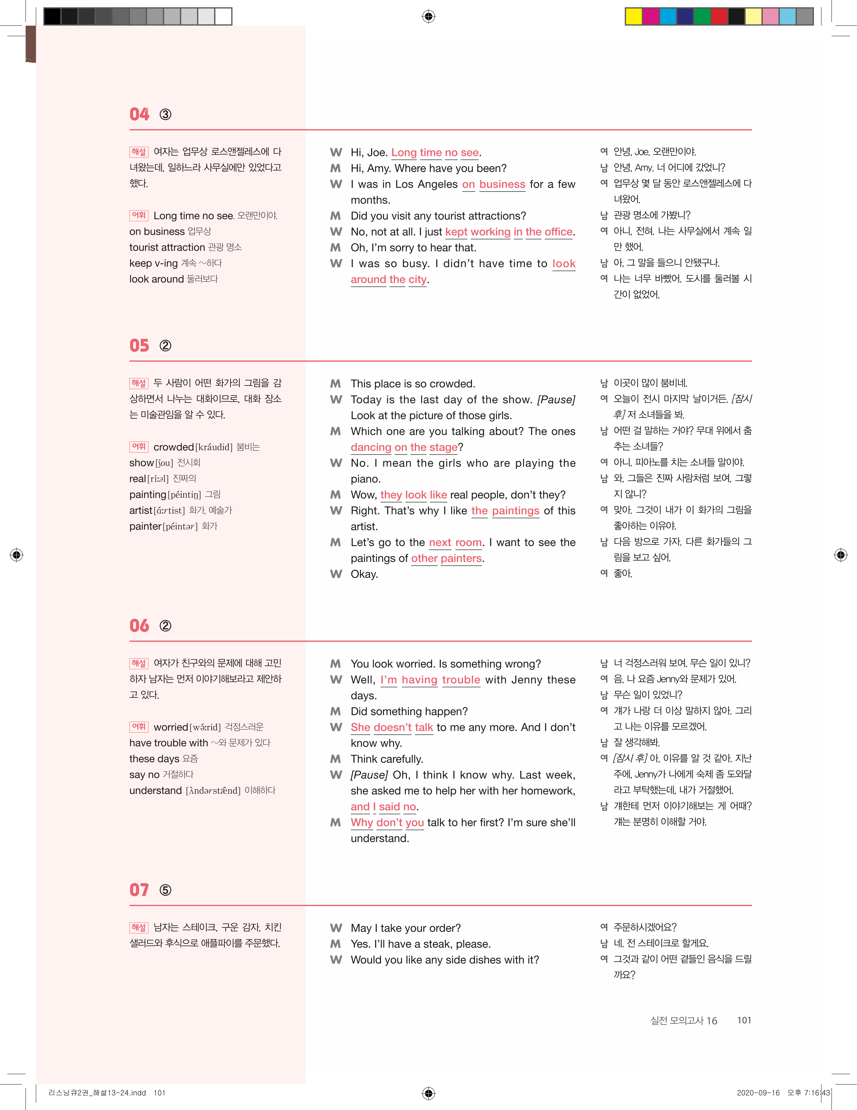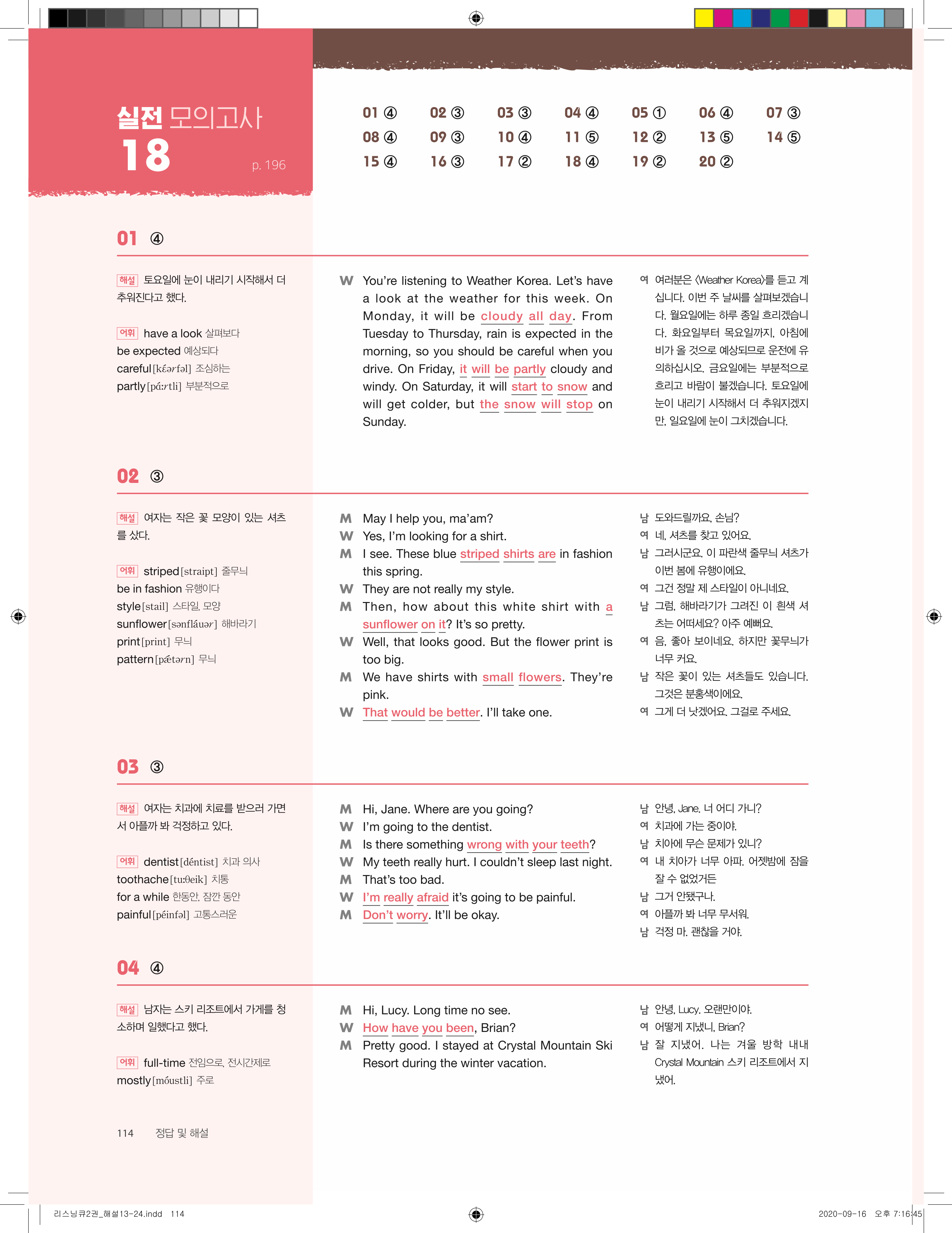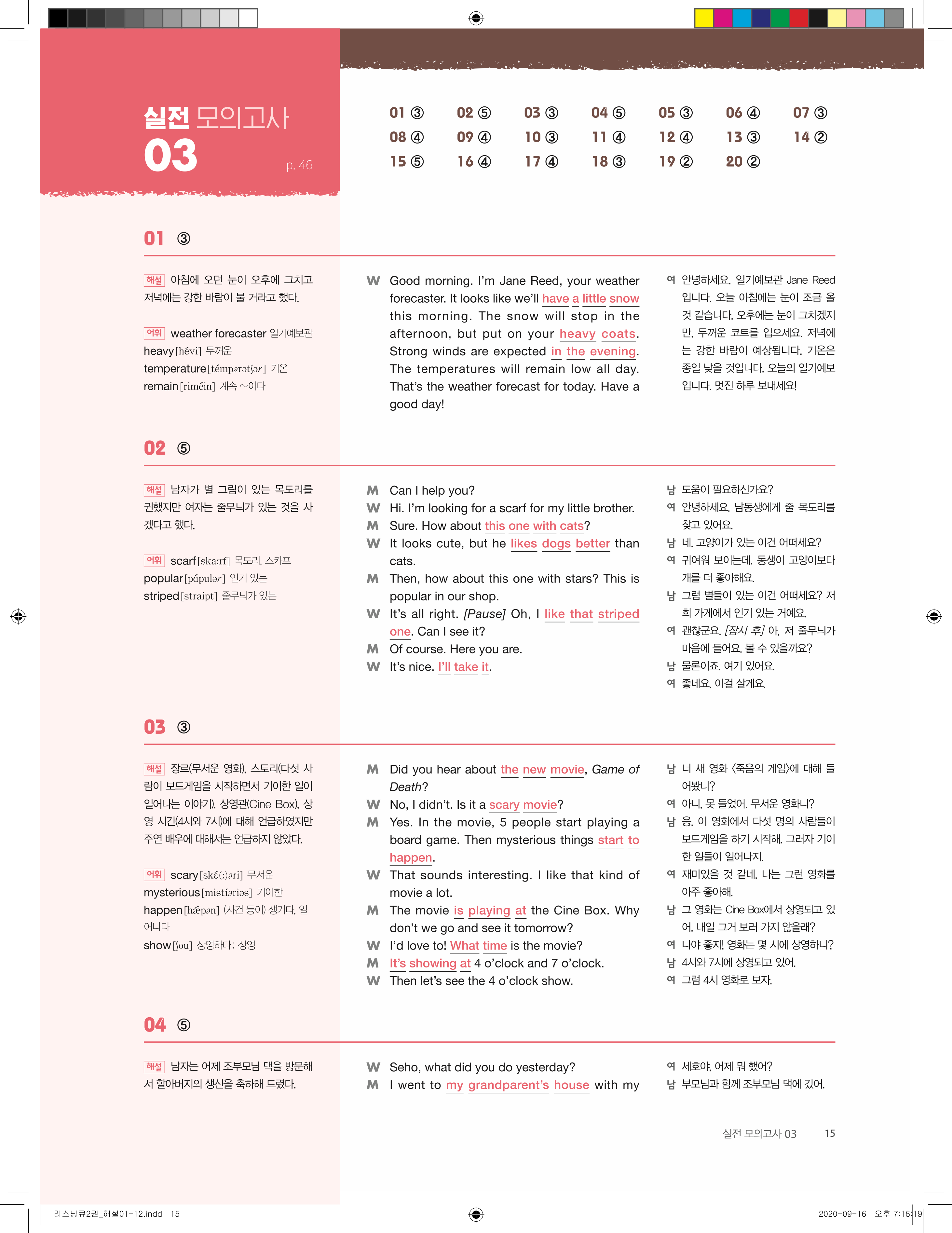 세듀 리스닝큐 중학영어듣기 모의고사24회 레벨2 답지 빠른답지 다운없이 바로보는 사진답지 모바일최적화