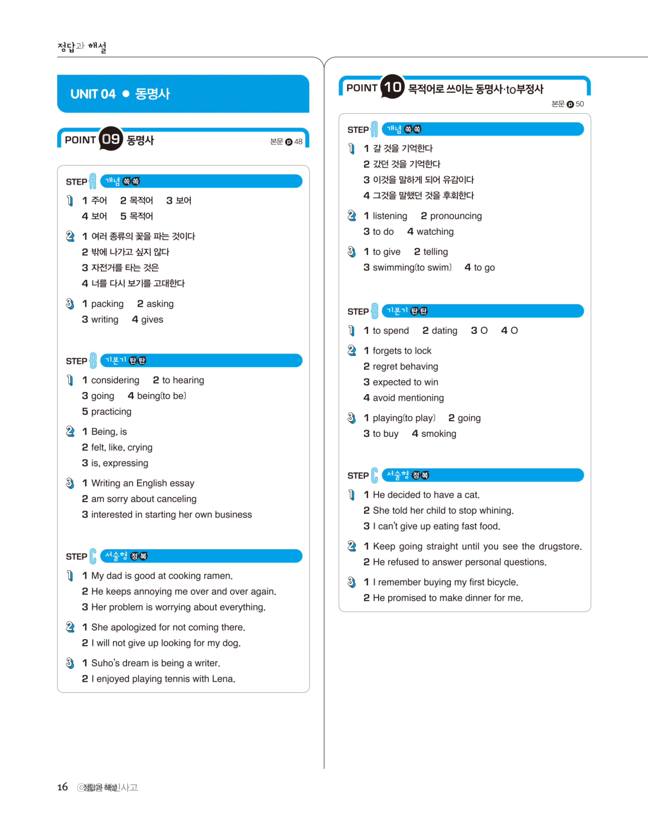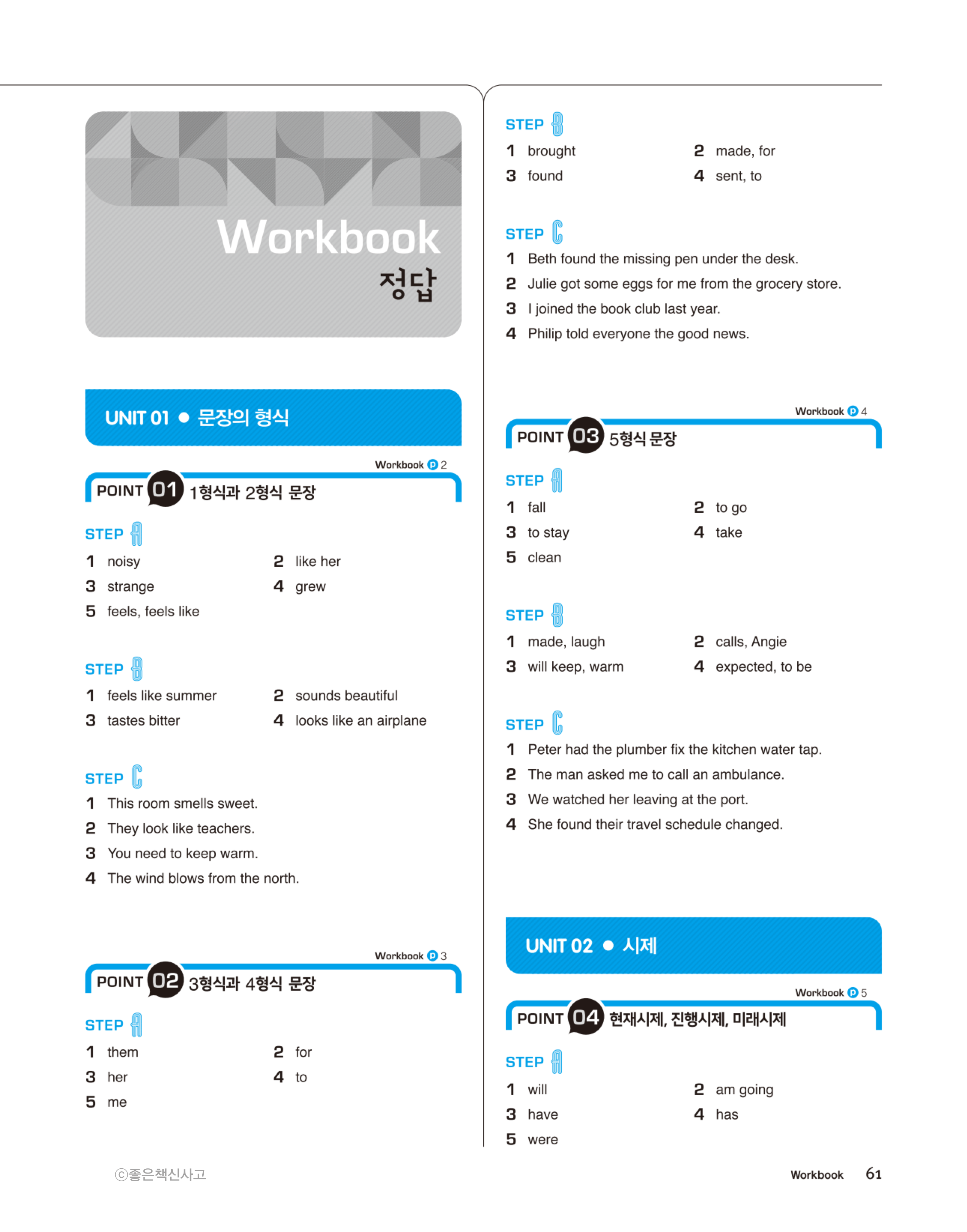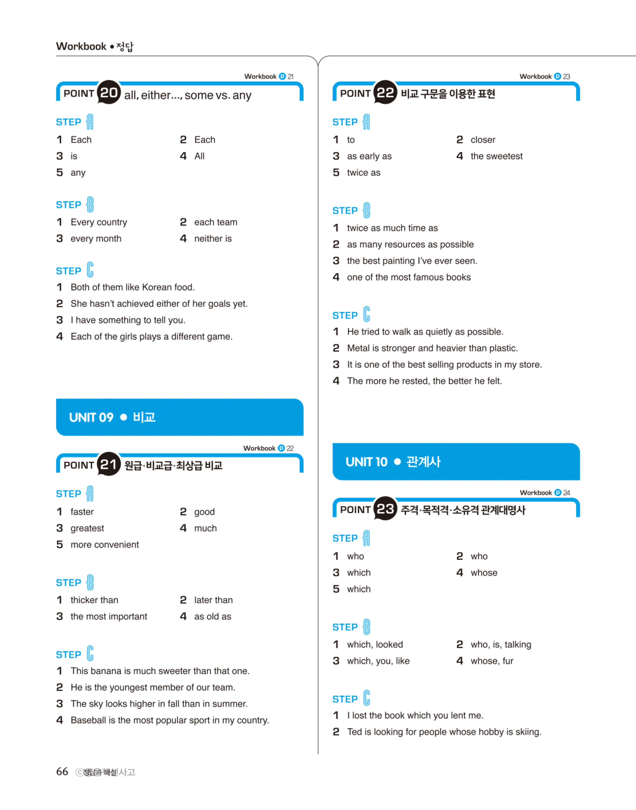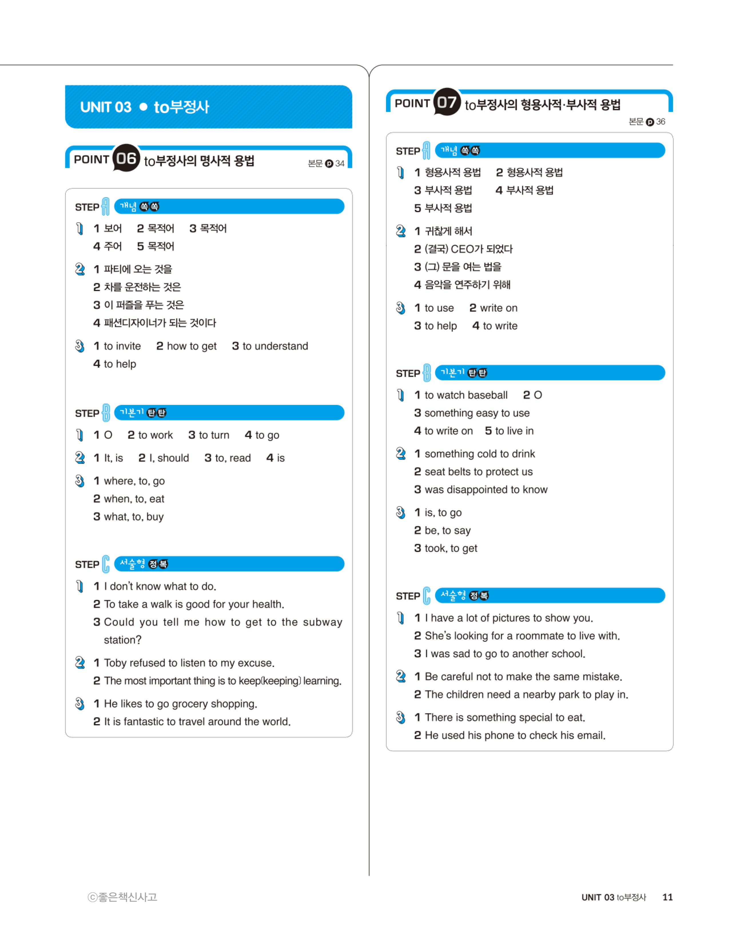 학습한 문법 POINT를 ( 단어 ) → ( 구 ) → ( 문장 ) 중심의 확인 문제를 통해 체계적으로 익힐 수 있도록 구성하였습니다. STEP A에서 개념을 익힌 후, STEP B에서 기본기를 탄탄히 쌓고, STEP C에서 최신 기출 유형을 반영한 서술형 문제를 풀어 볼 수 있습니다.