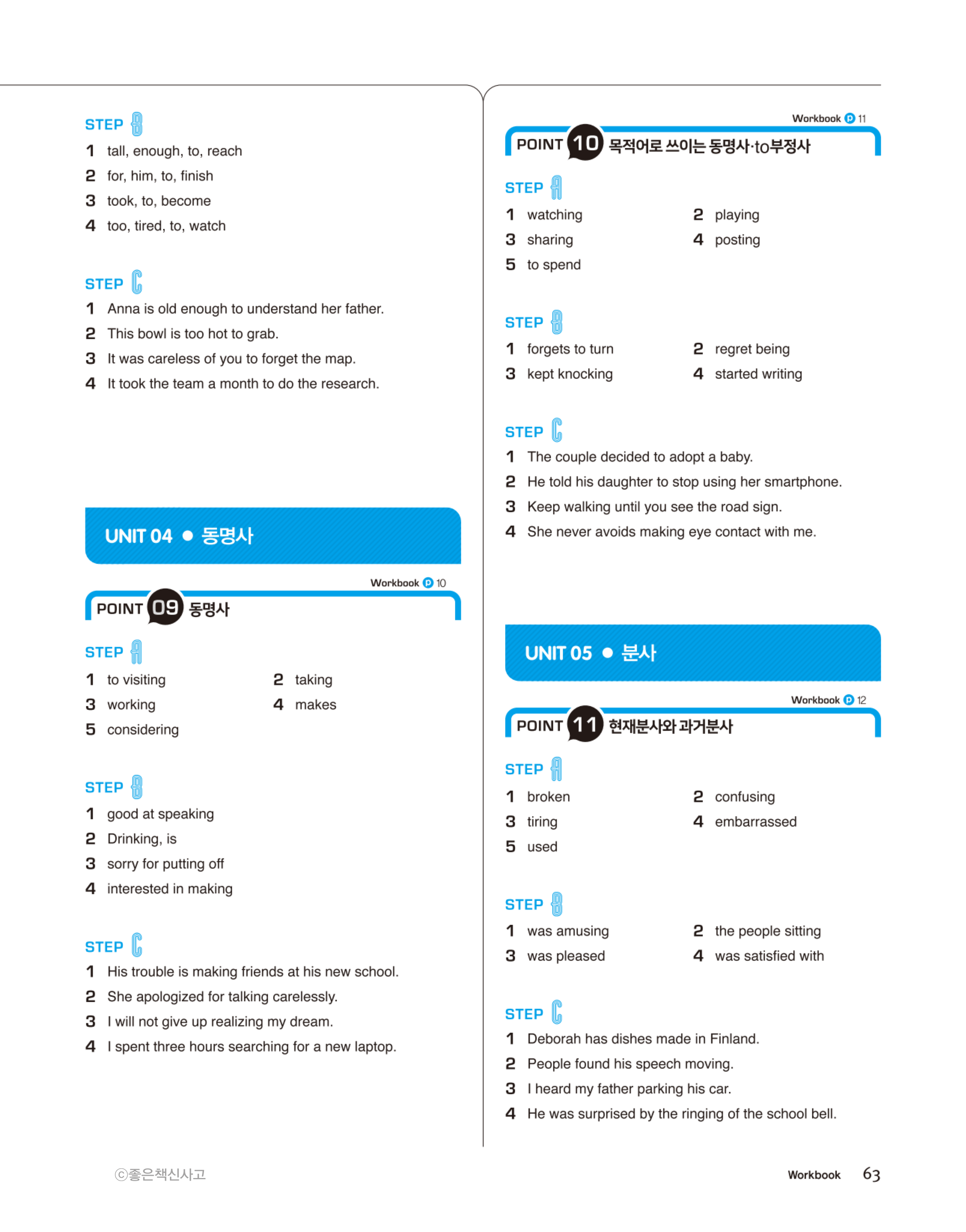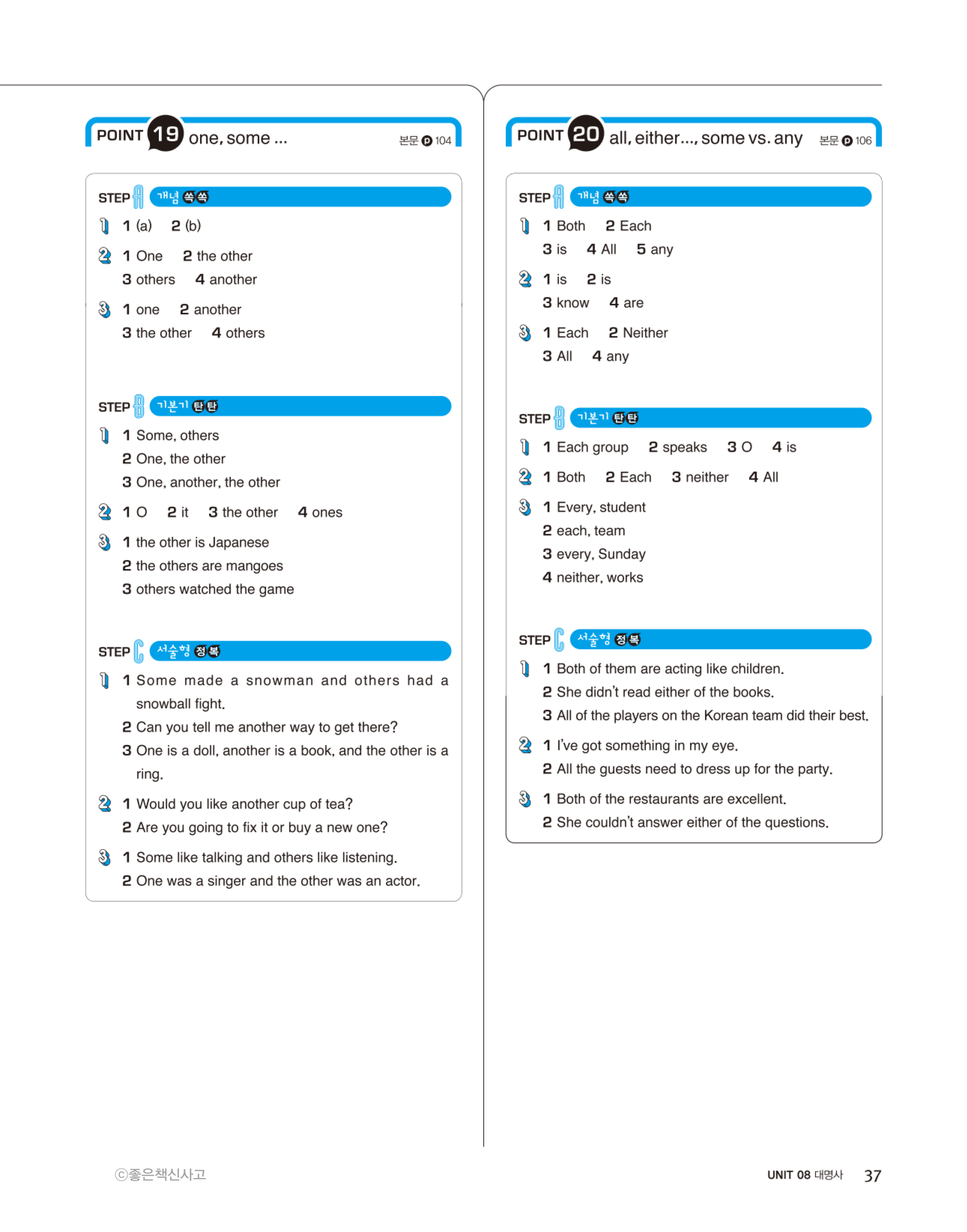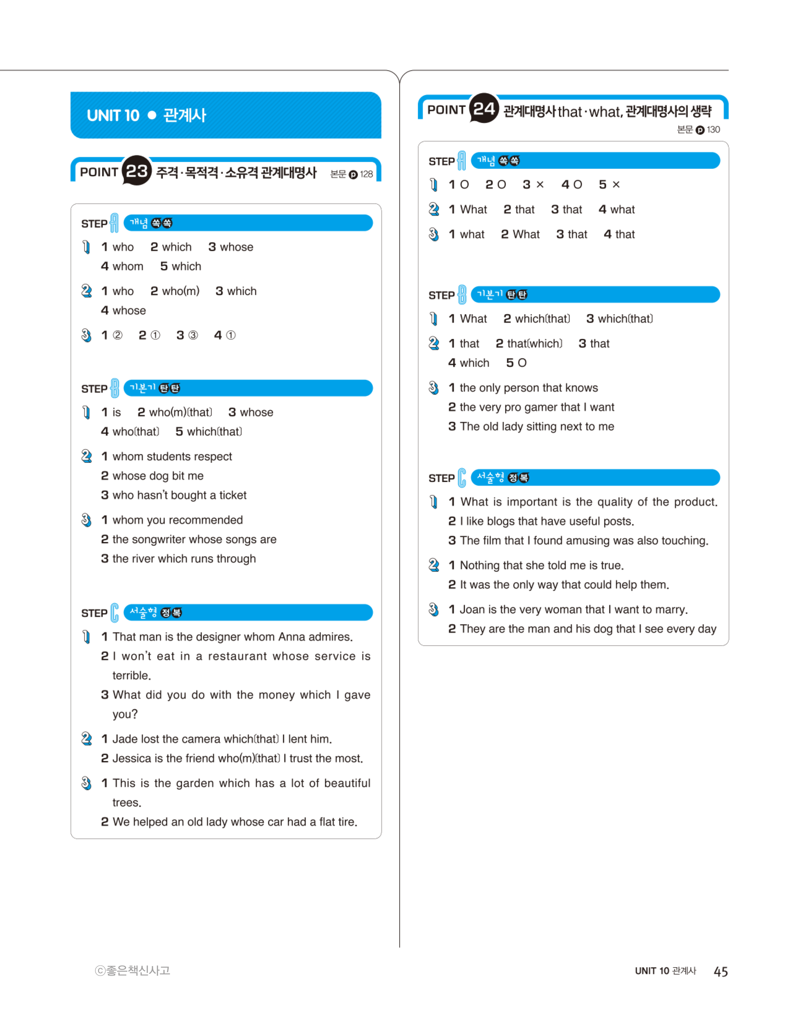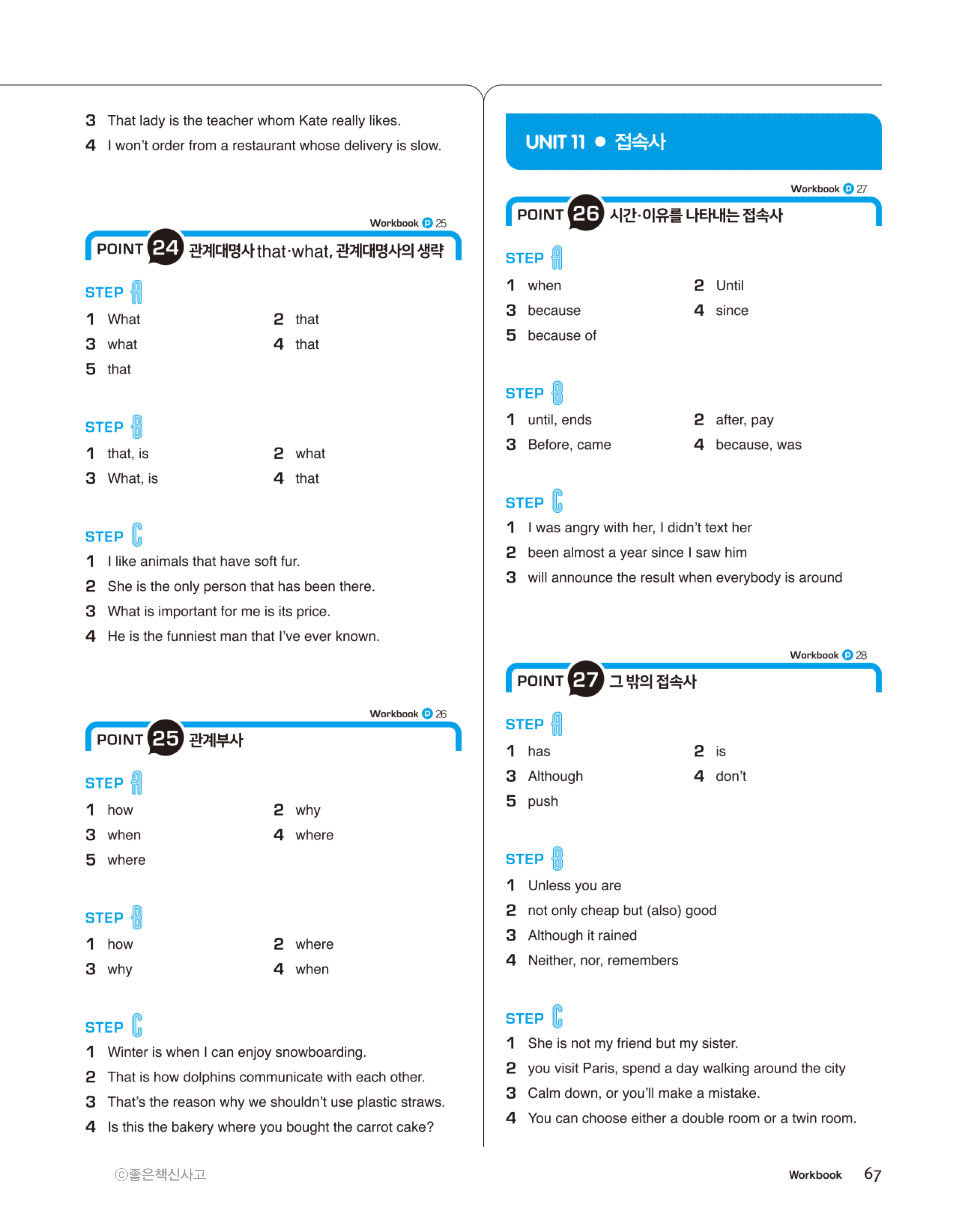 학습한 문법 POINT를 ( 단어 ) → ( 구 ) → ( 문장 ) 중심의 확인 문제를 통해 체계적으로 익힐 수 있도록 구성하였습니다. STEP A에서 개념을 익힌 후, STEP B에서 기본기를 탄탄히 쌓고, STEP C에서 최신 기출 유형을 반영한 서술형 문제를 풀어 볼 수 있습니다.