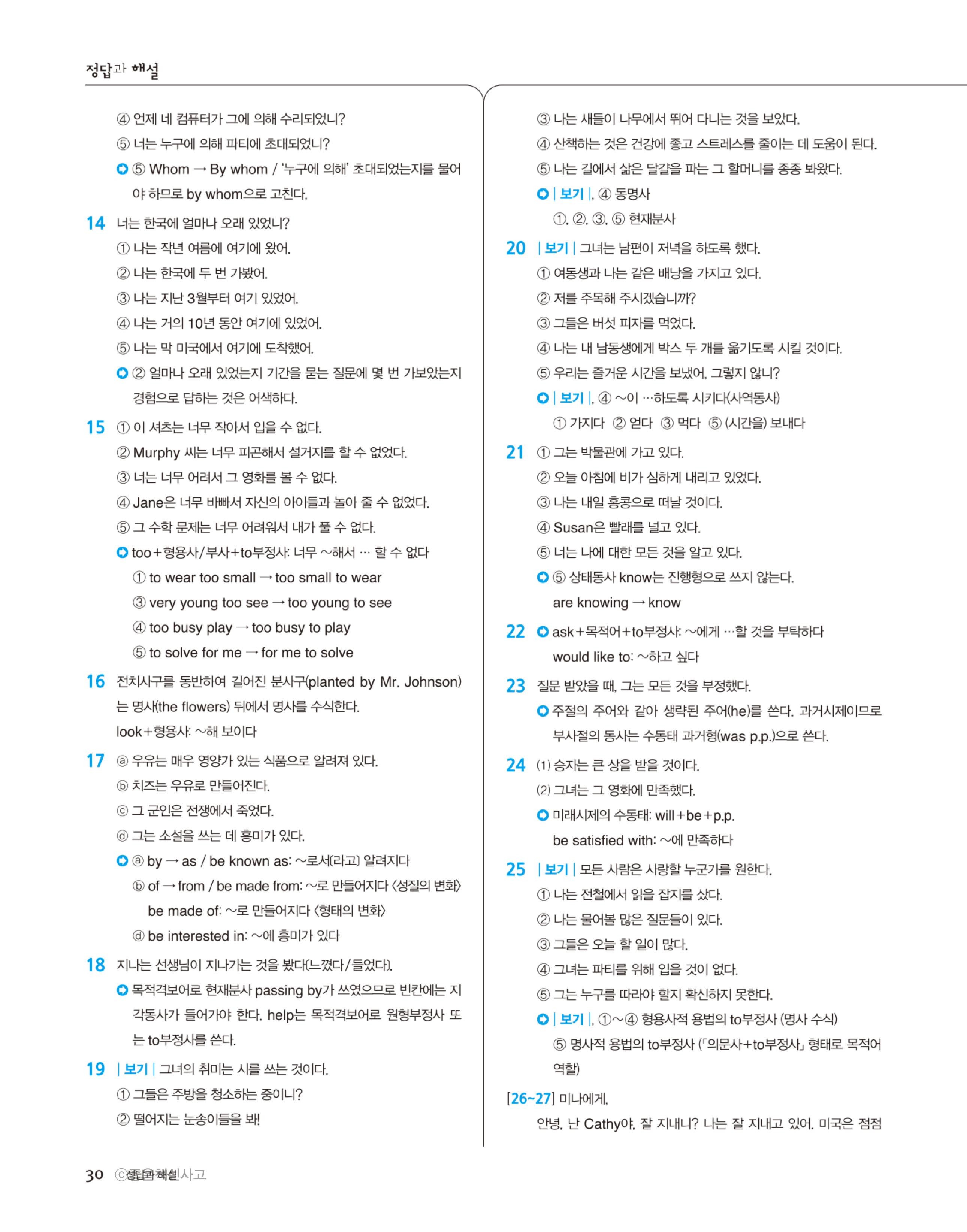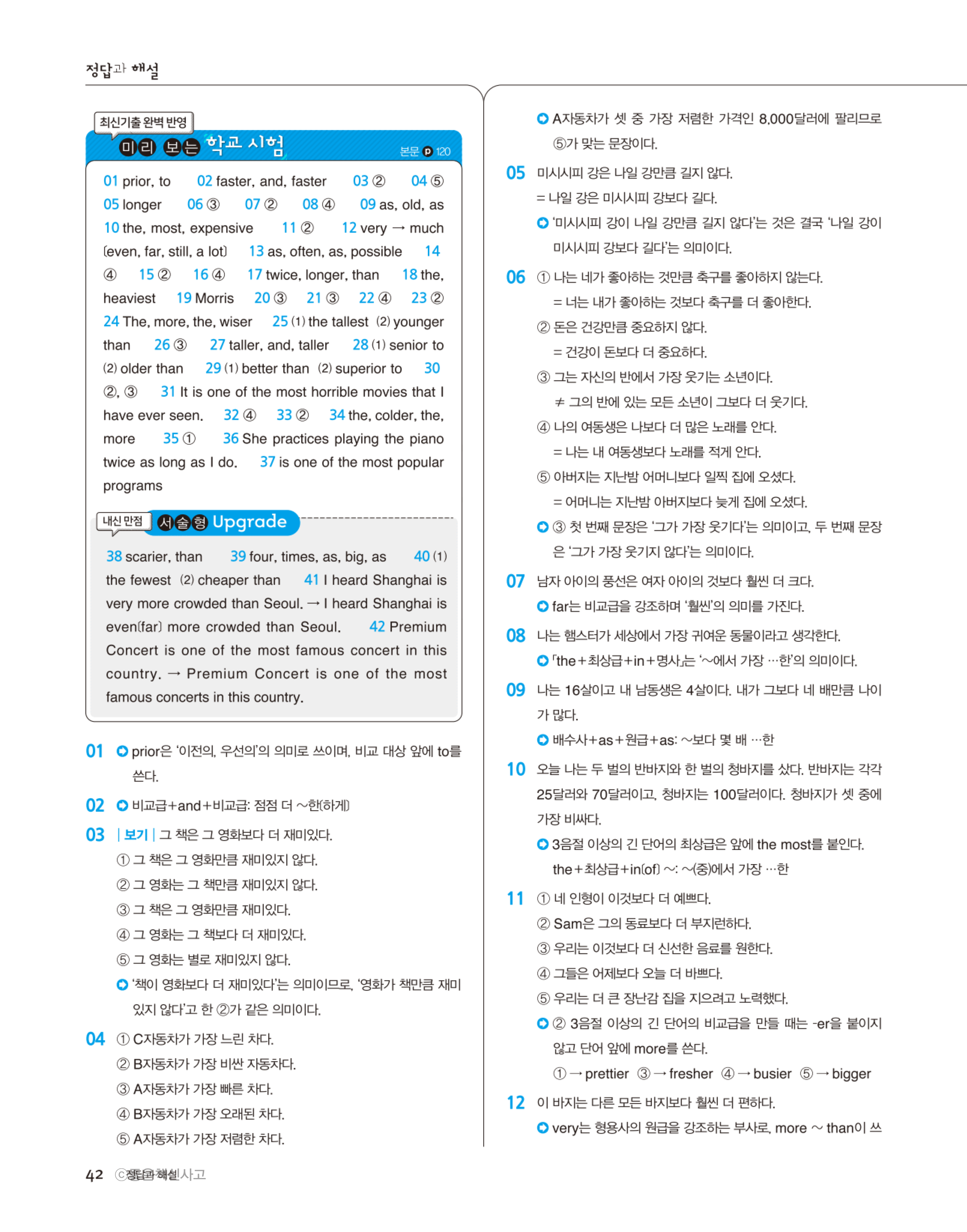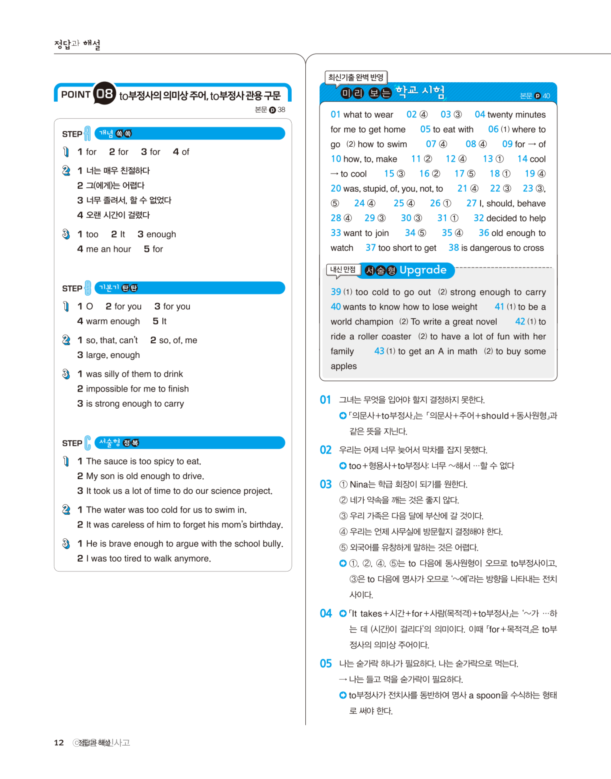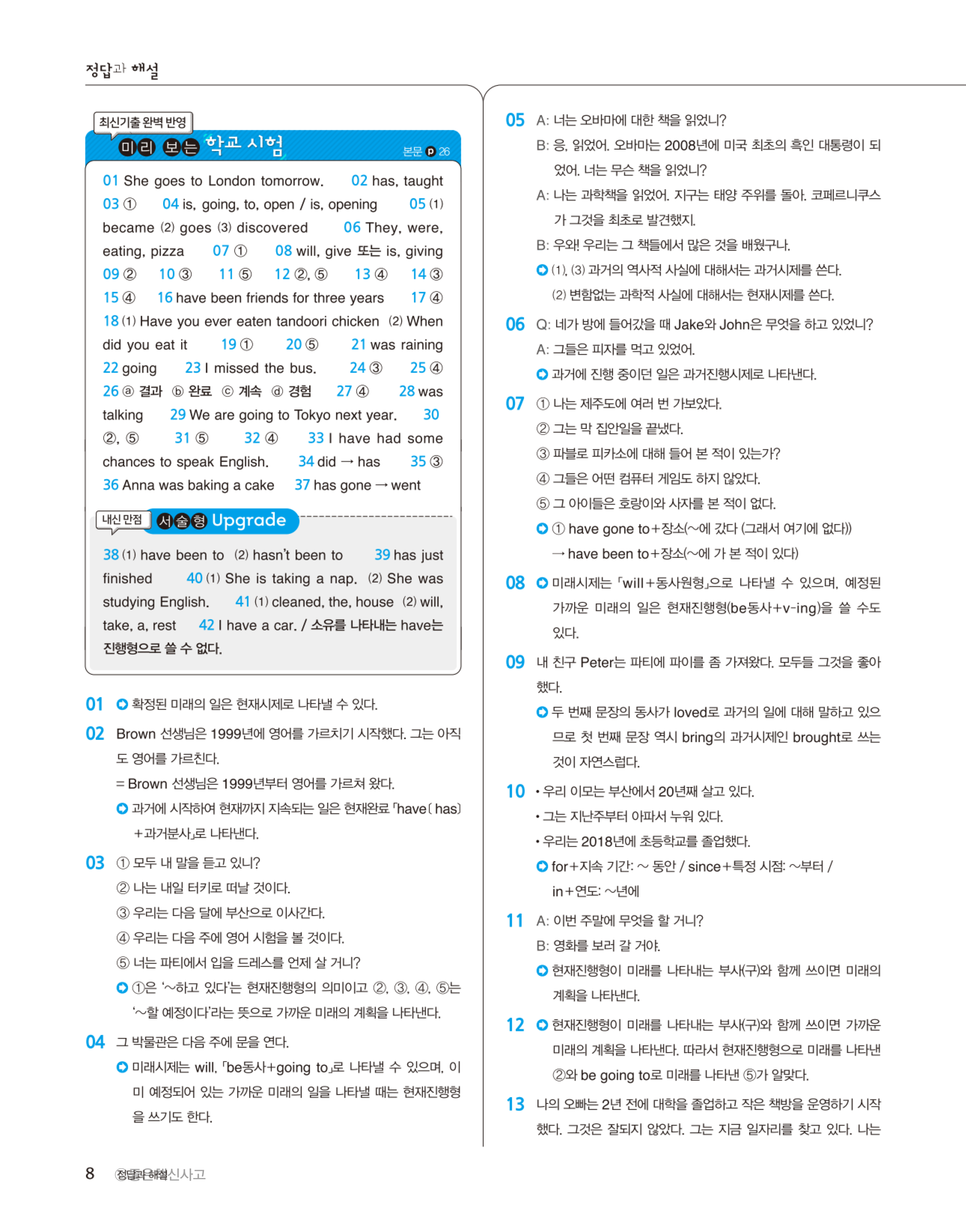 학교 시험에 자주 출제되는 문제 유형과 최신 기출 유형을 분석하여 동일 유형의 문제들로 구성하였습니다. 실제 학교 시험에 출제되는 유형의 문제를 통해 학습한 문법 사항이 실제로는 어떻게 출제되는지 파악할 수 있습니다.