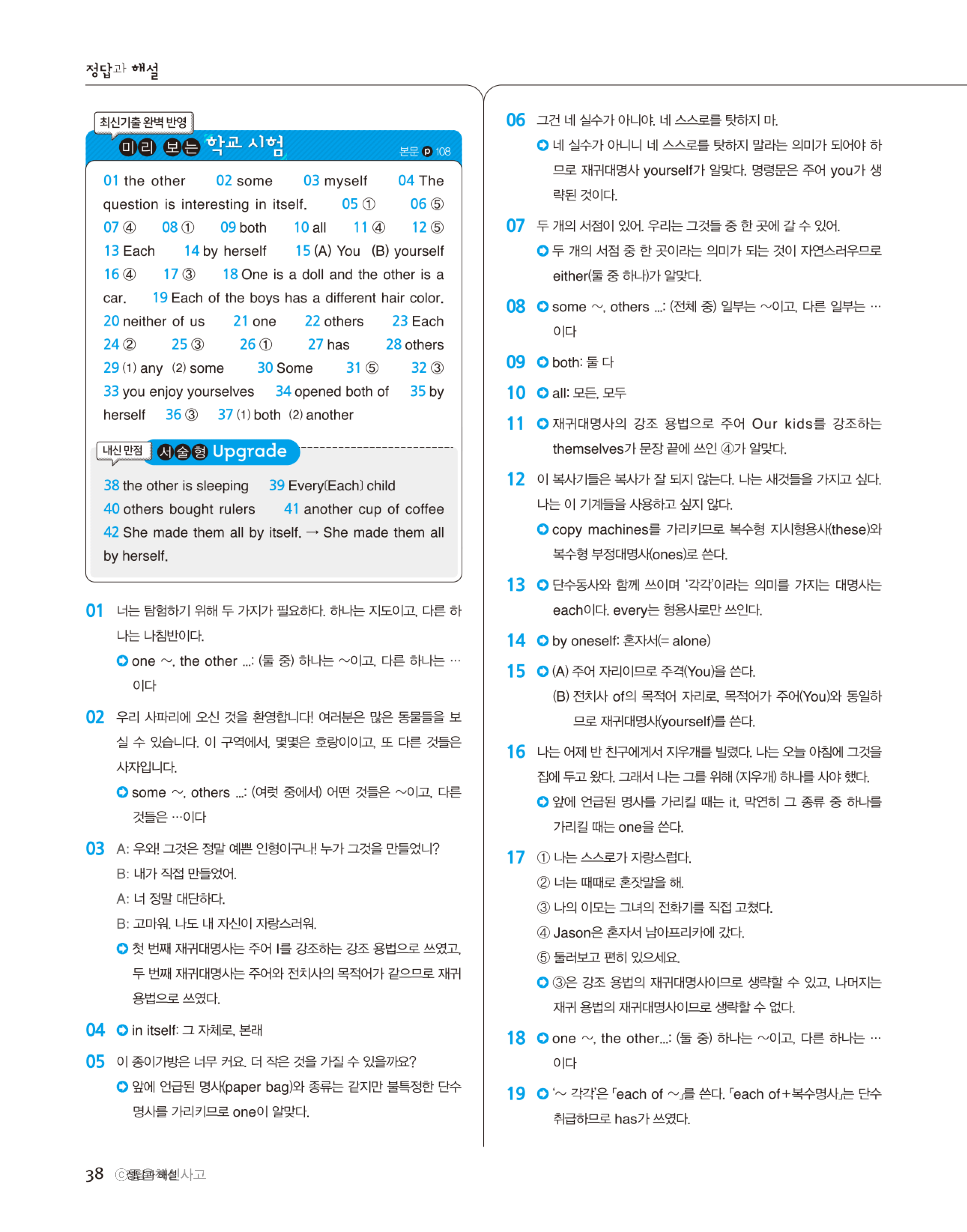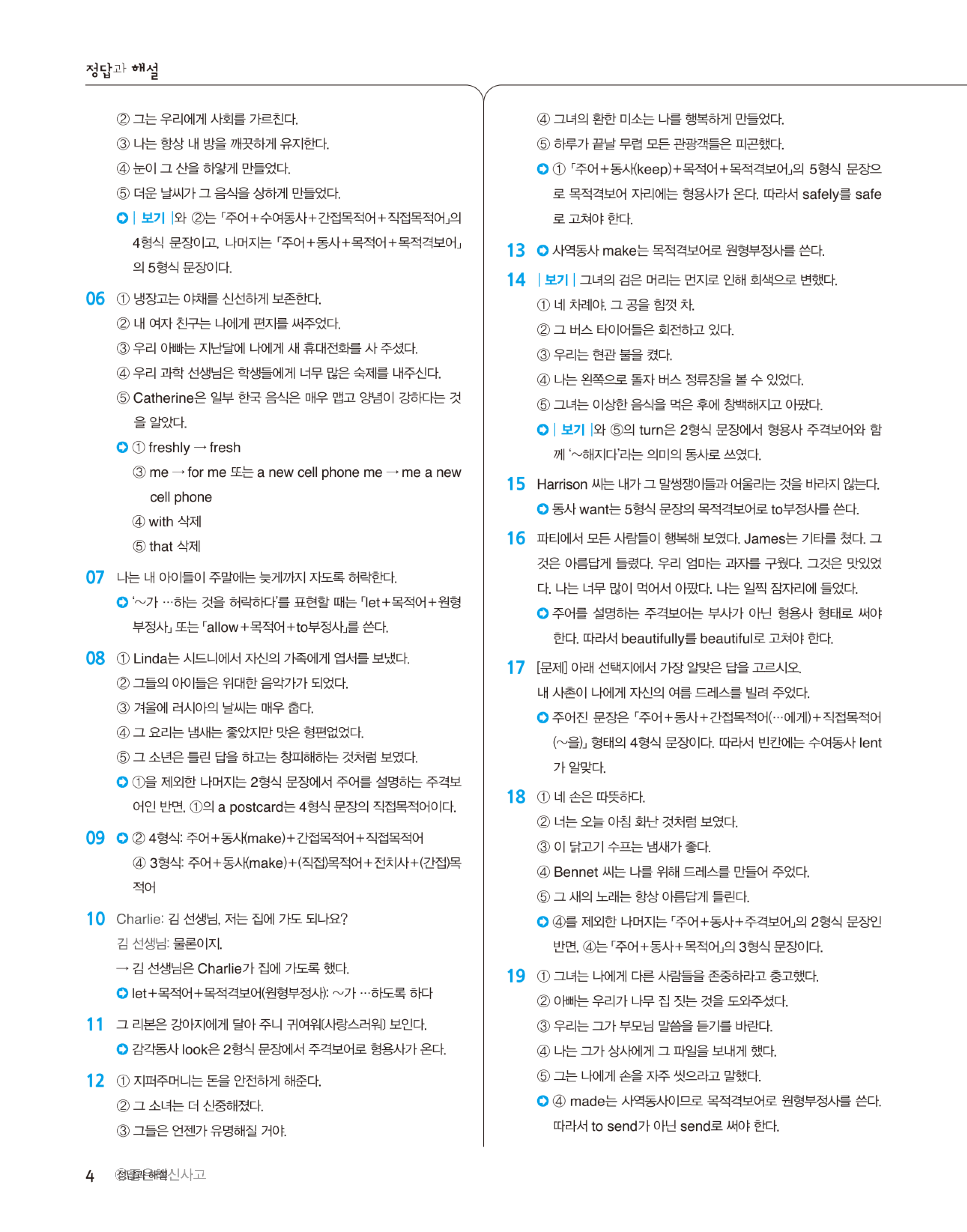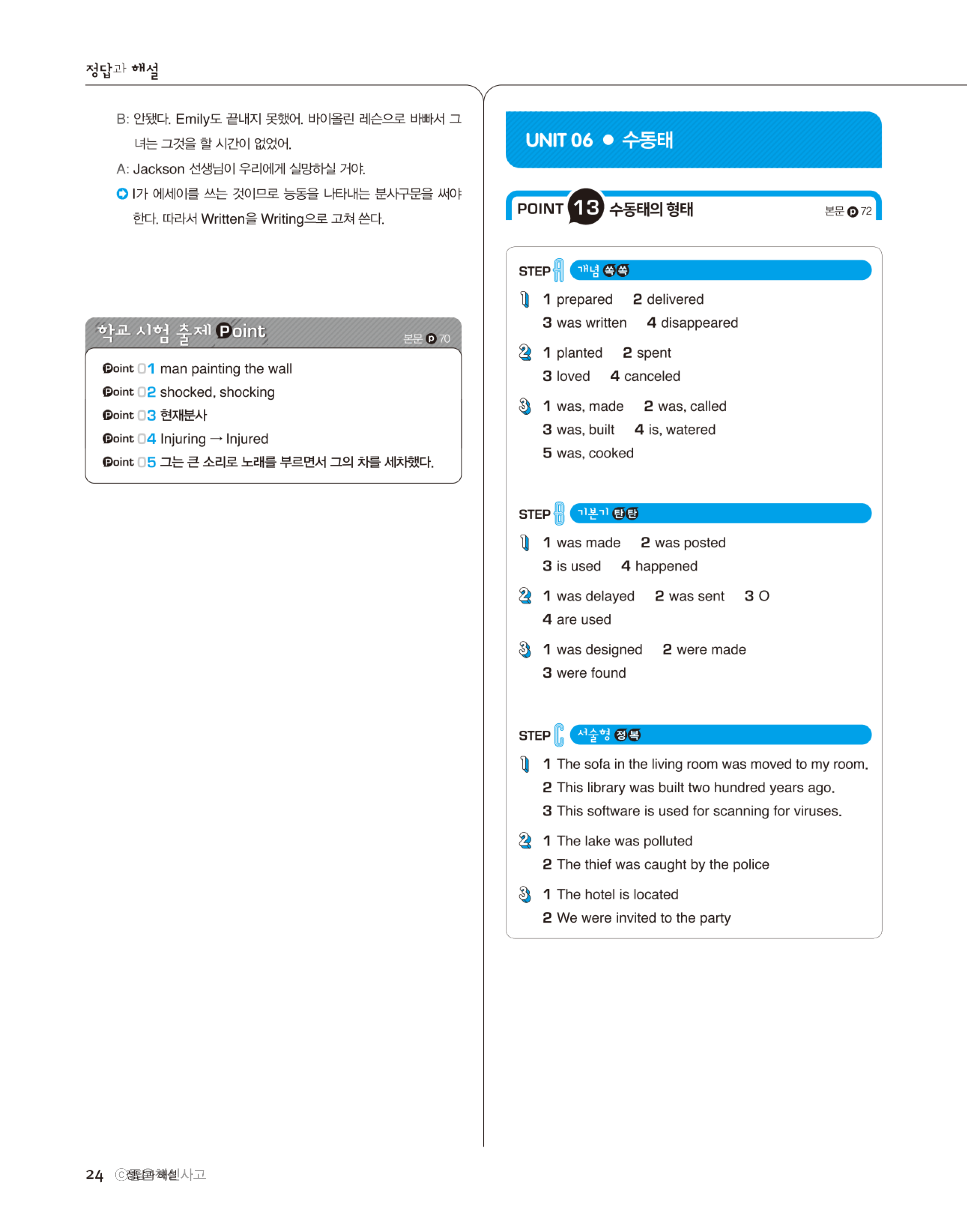 학교 시험에 자주 출제되는 문제 유형과 최신 기출 유형을 분석하여 동일 유형의 문제들로 구성하였습니다. 실제 학교 시험에 출제되는 유형의 문제를 통해 학습한 문법 사항이 실제로는 어떻게 출제되는지 파악할 수 있습니다.