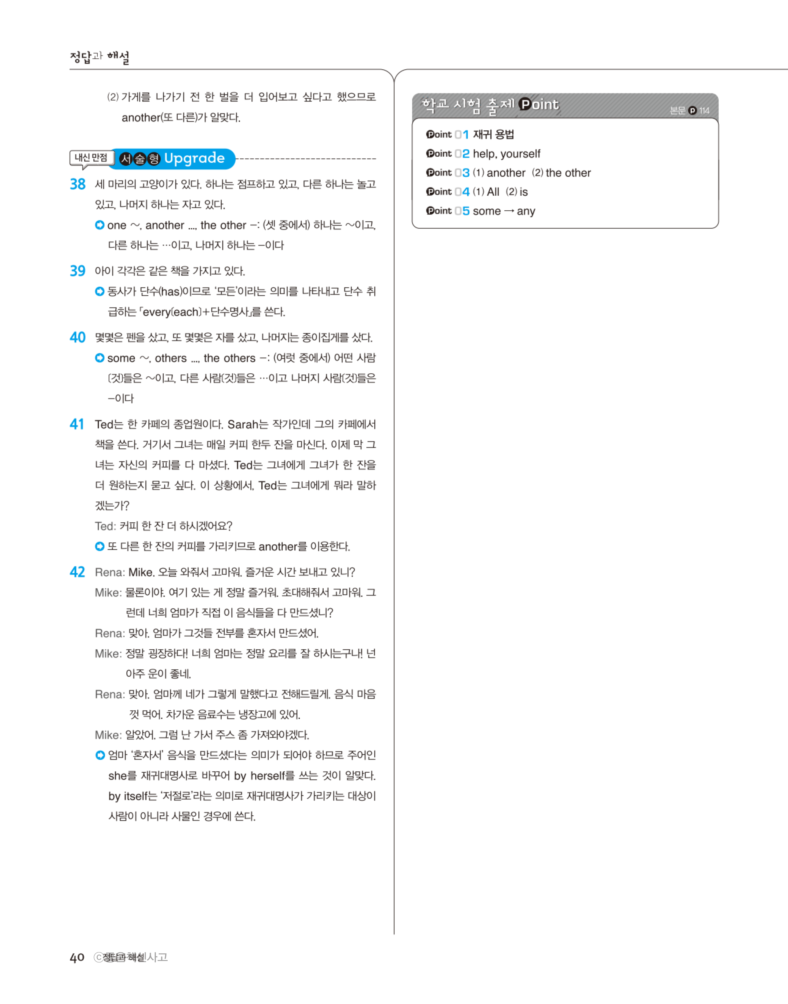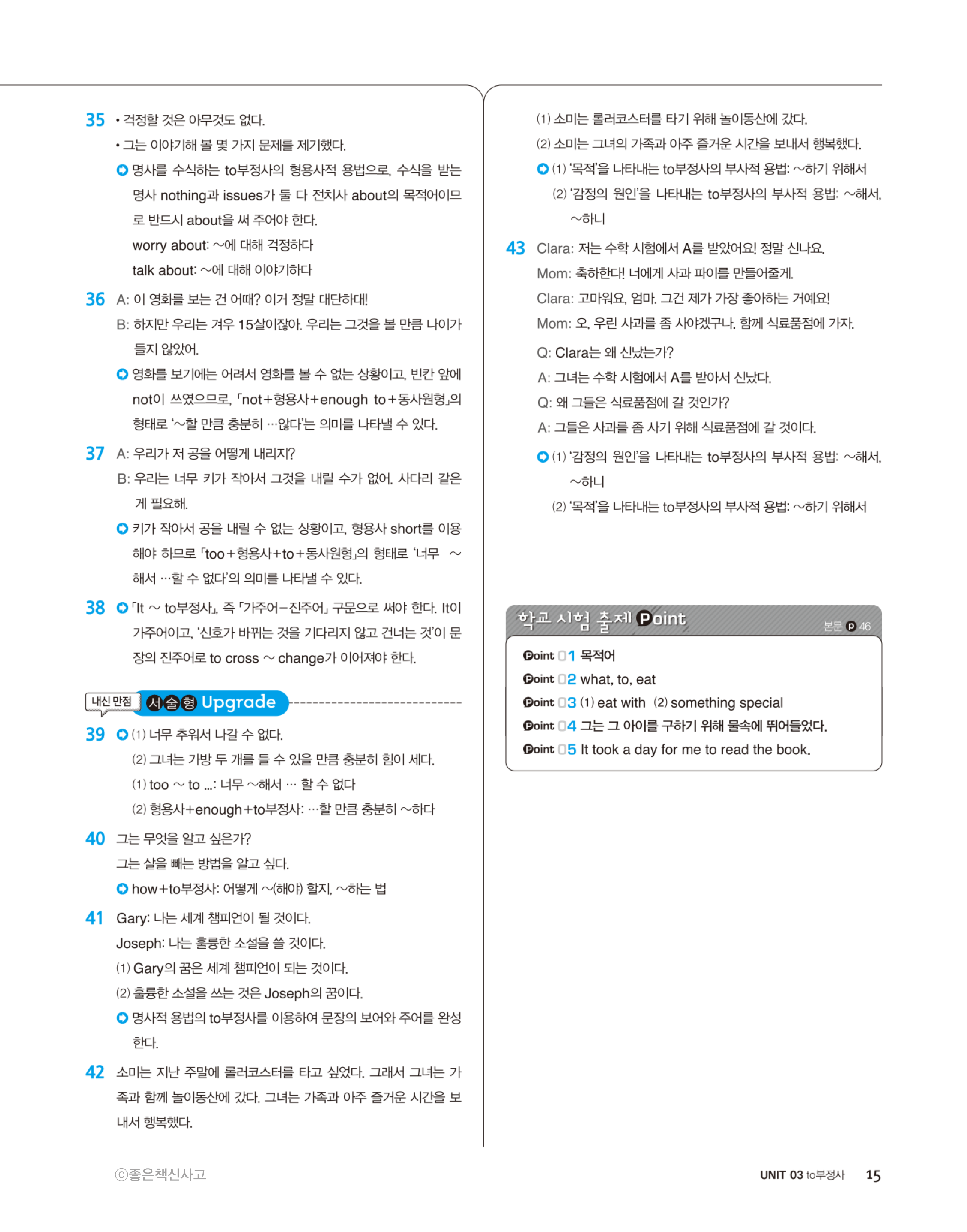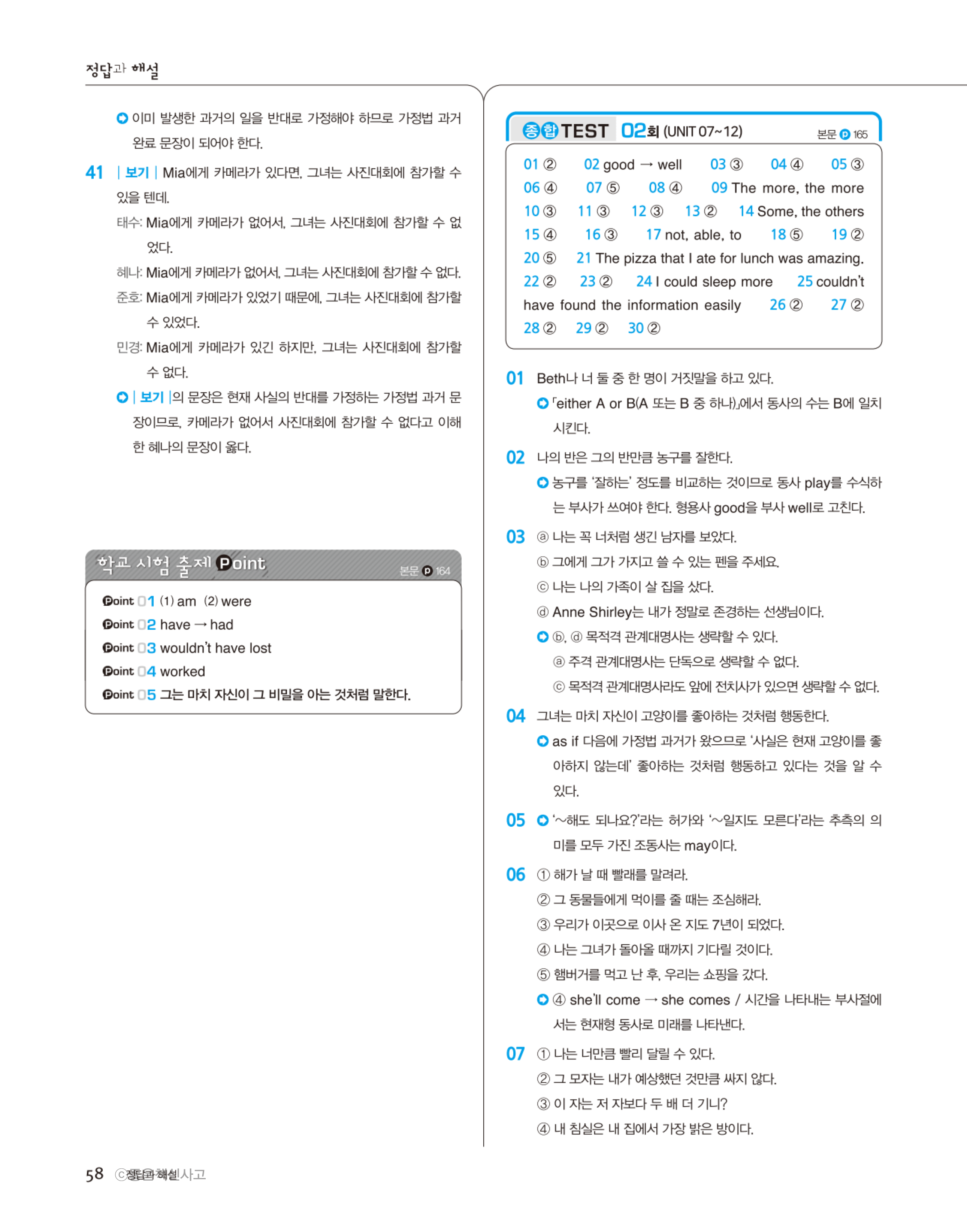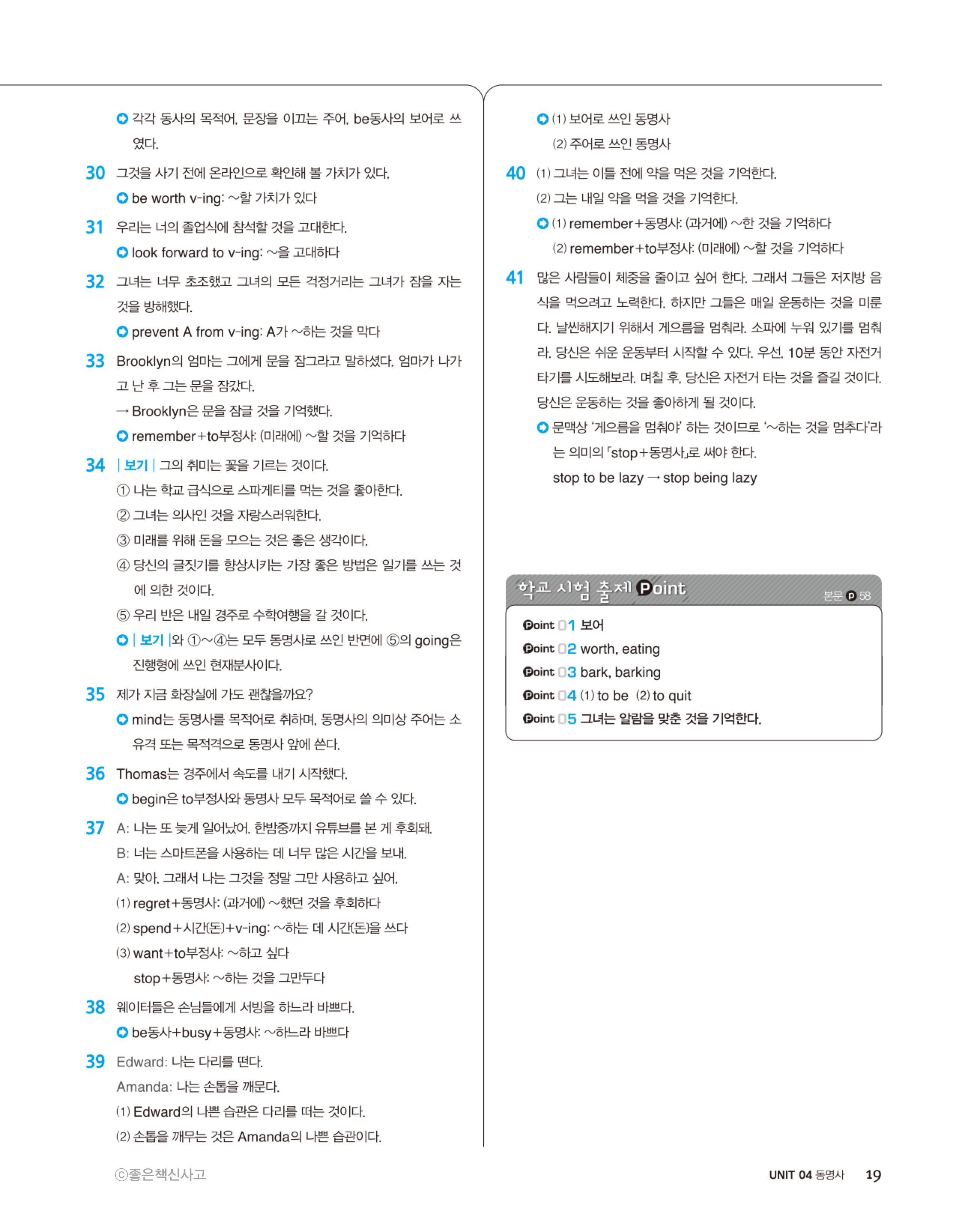각 UNIT 마무리 페이지에 학교 시험에 반드시 출제되는 POINT만을 선별하여 정리하였습니다. 시험 직전에 빠르게 훑어보며 주요 문법 사항을 정리할 수 있습니다.