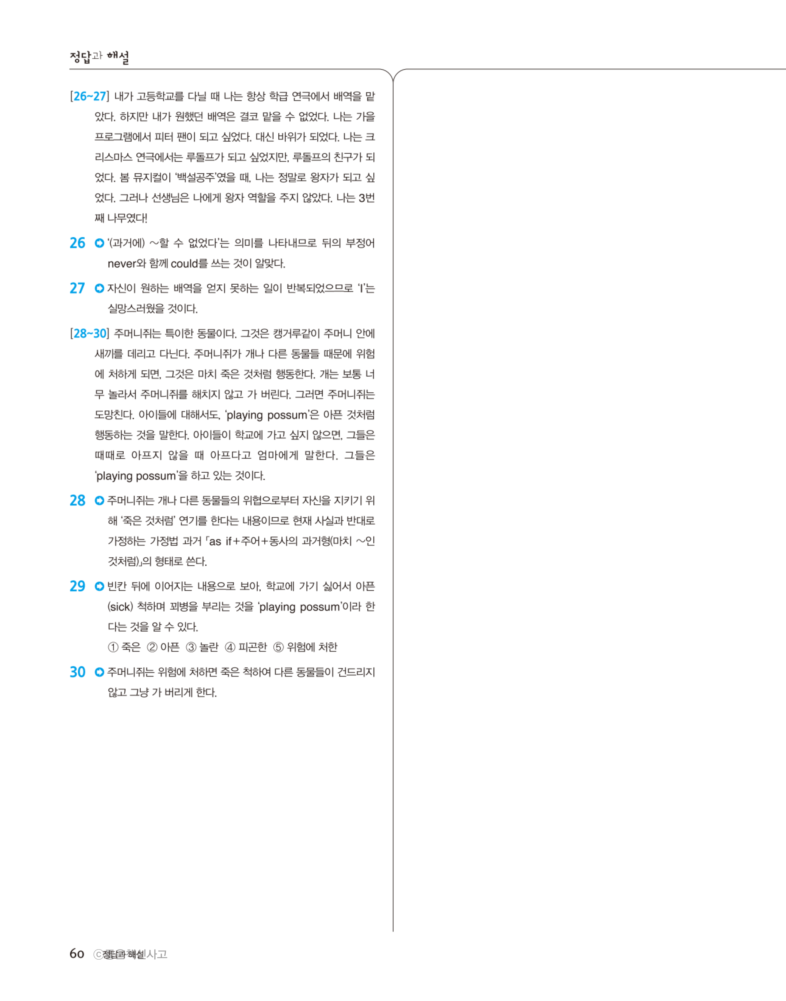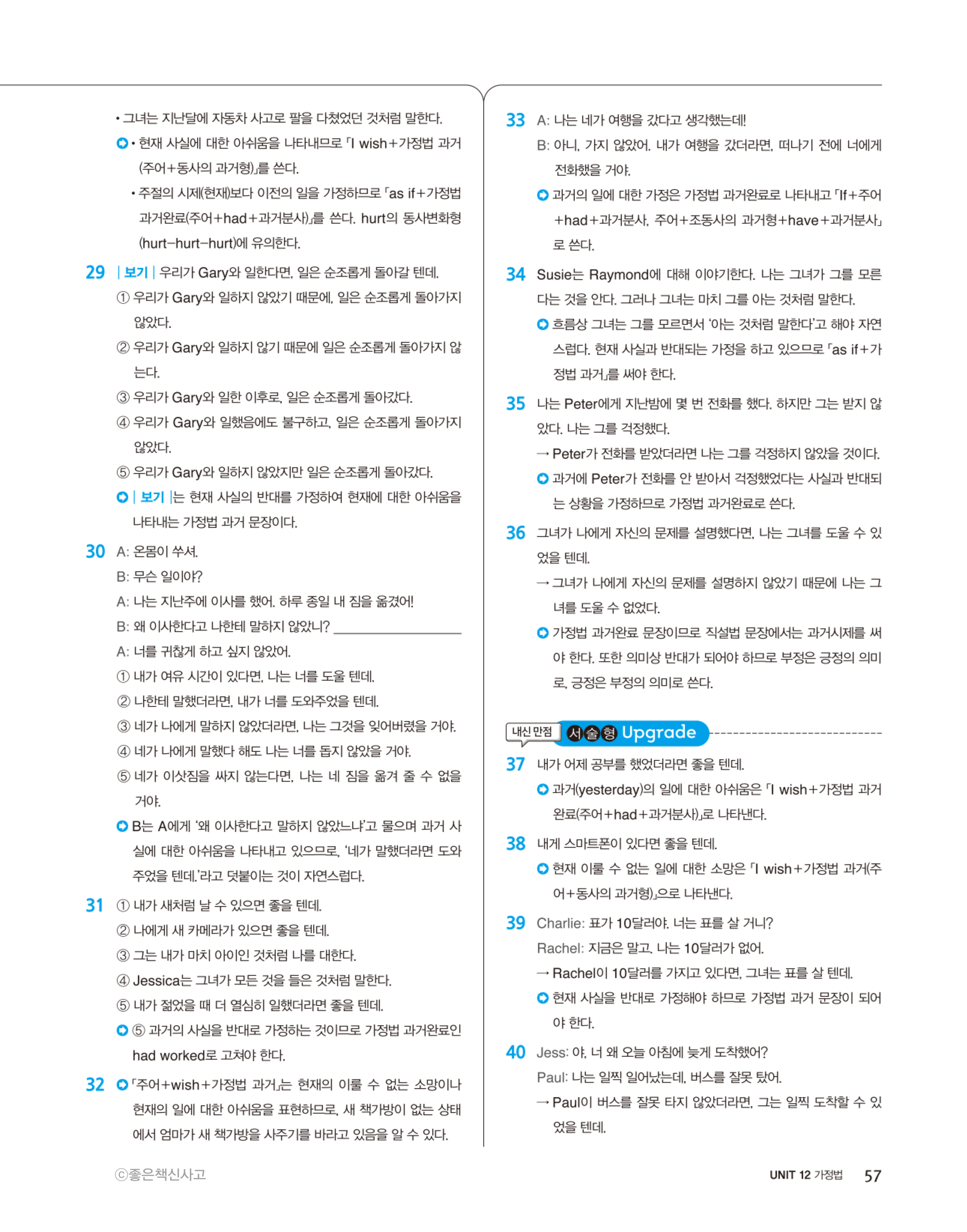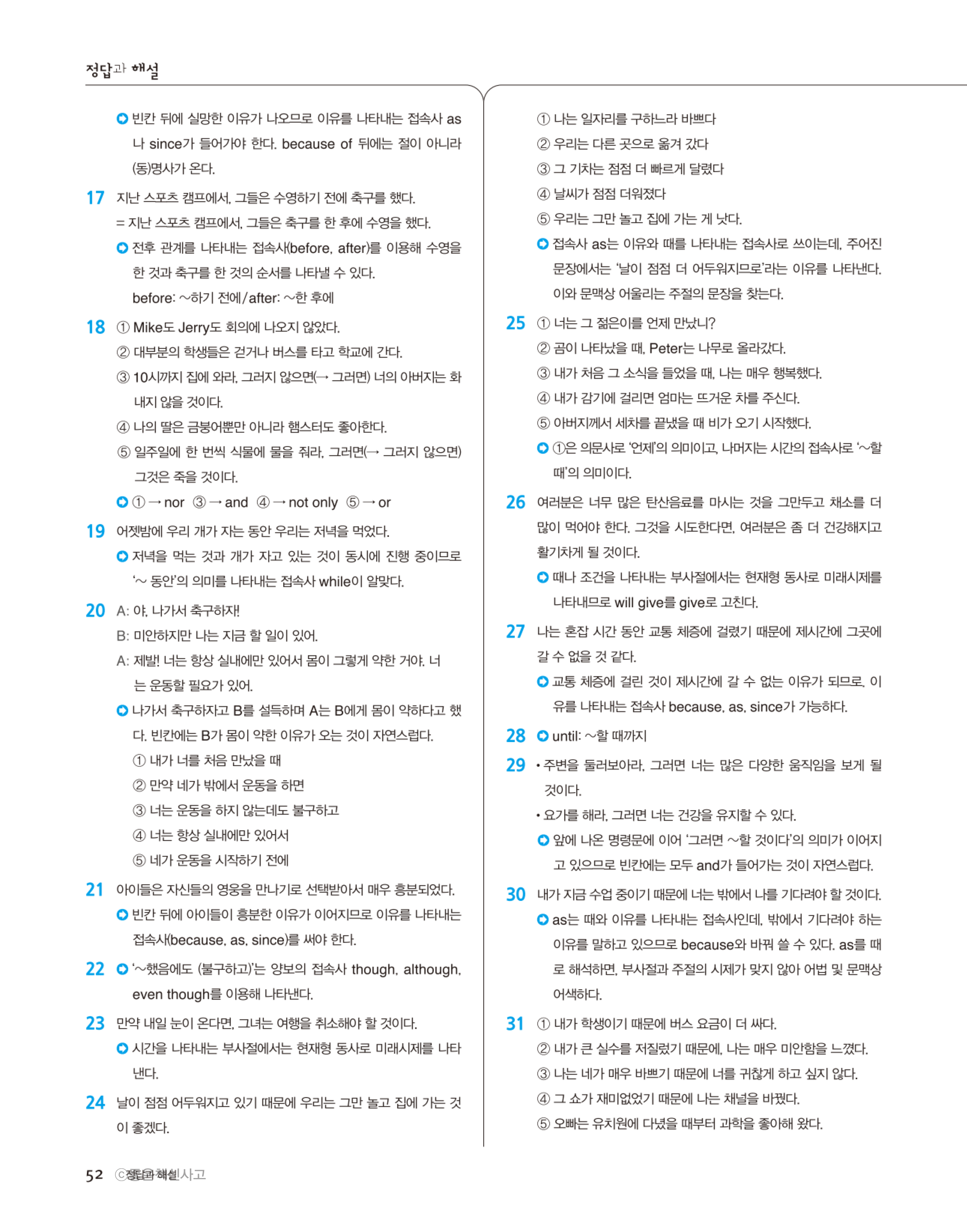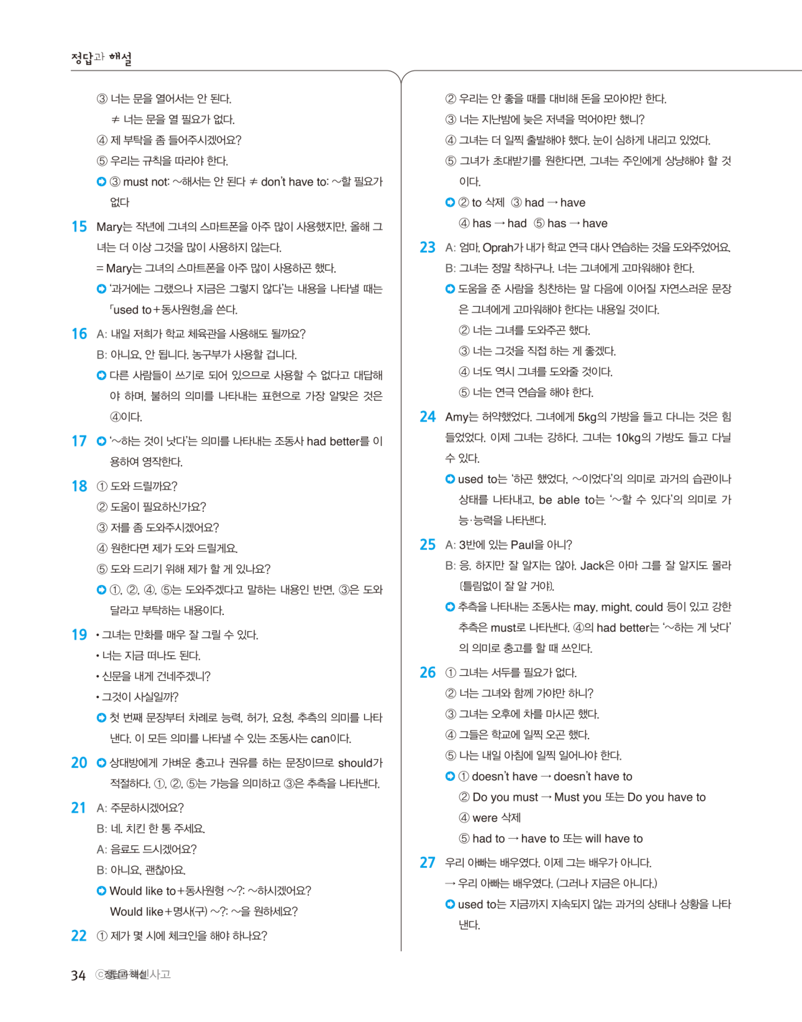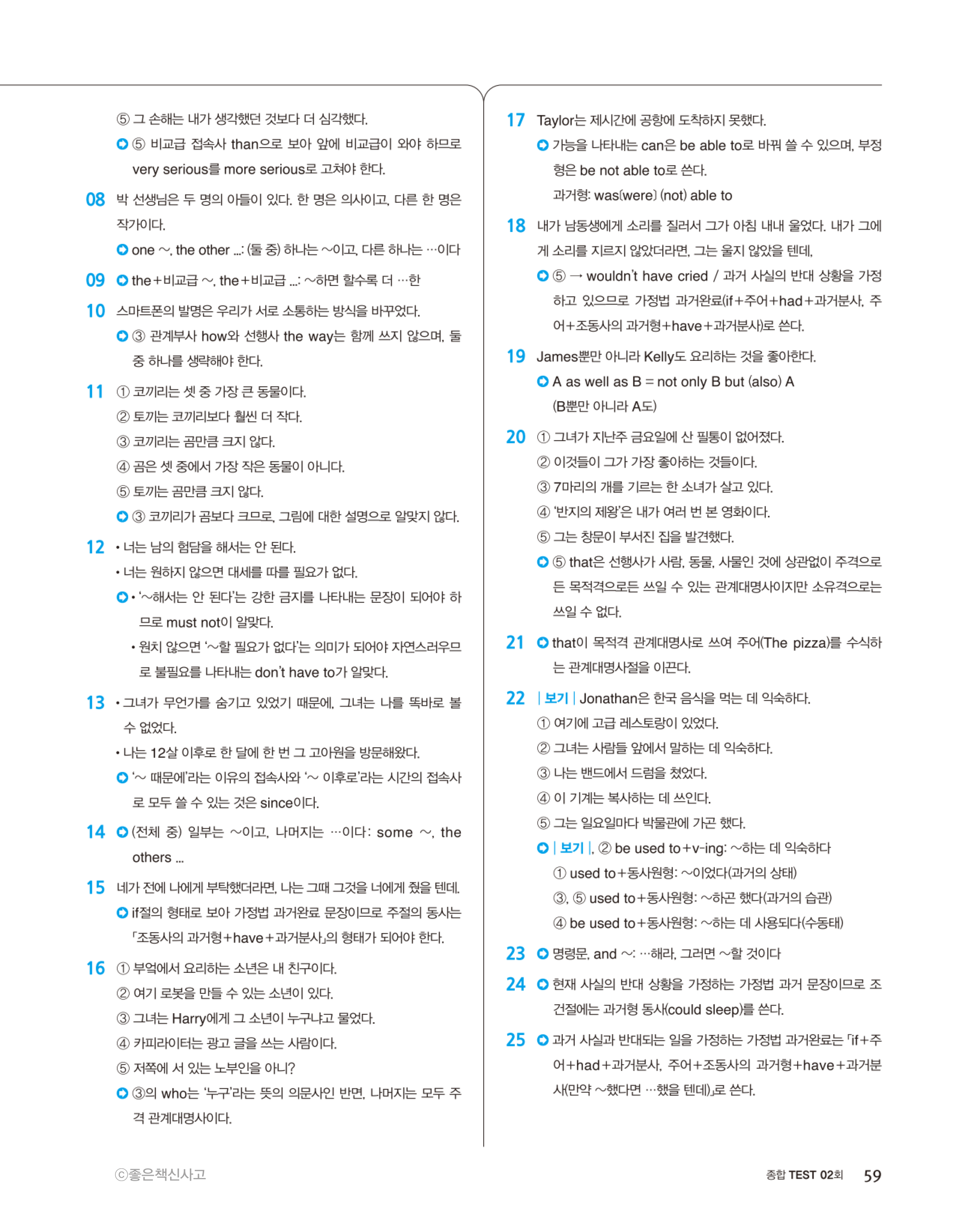 앞서 학습한 여러 가지 문법 사항들을 종합적으로 평가해 볼 수 있도록 앞부분의 문법 항목과 뒷부분의 문법 항목들을 모아 총 2회분으로 구성하였습니다. 실제 시험지와 동일한 형태로 구성하여 중간 / 기말고사 직전에 자신의 실력을 최종 점검해 볼 수 있습니다.