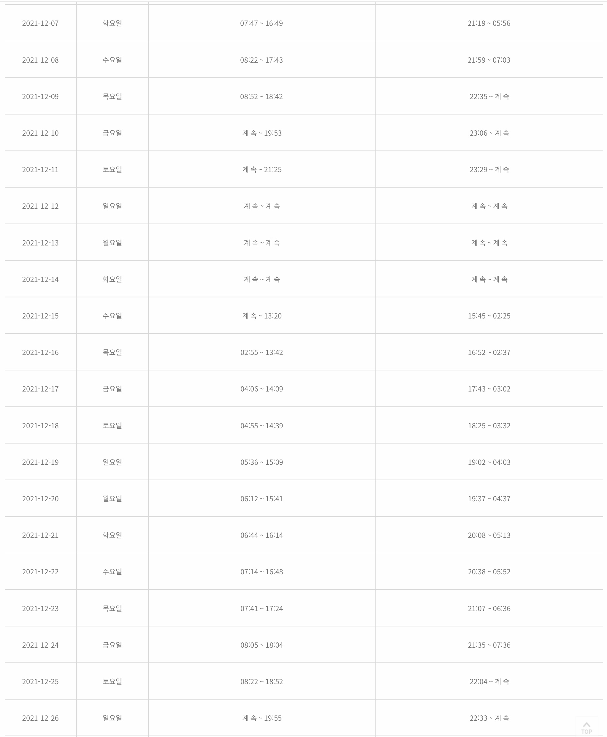 사리와 조금 상황에 따라 하루종일 물길이 열리는 날도 있더라구요 물때표에 "계속"으로 나오는 경우가 바로 그것입니다