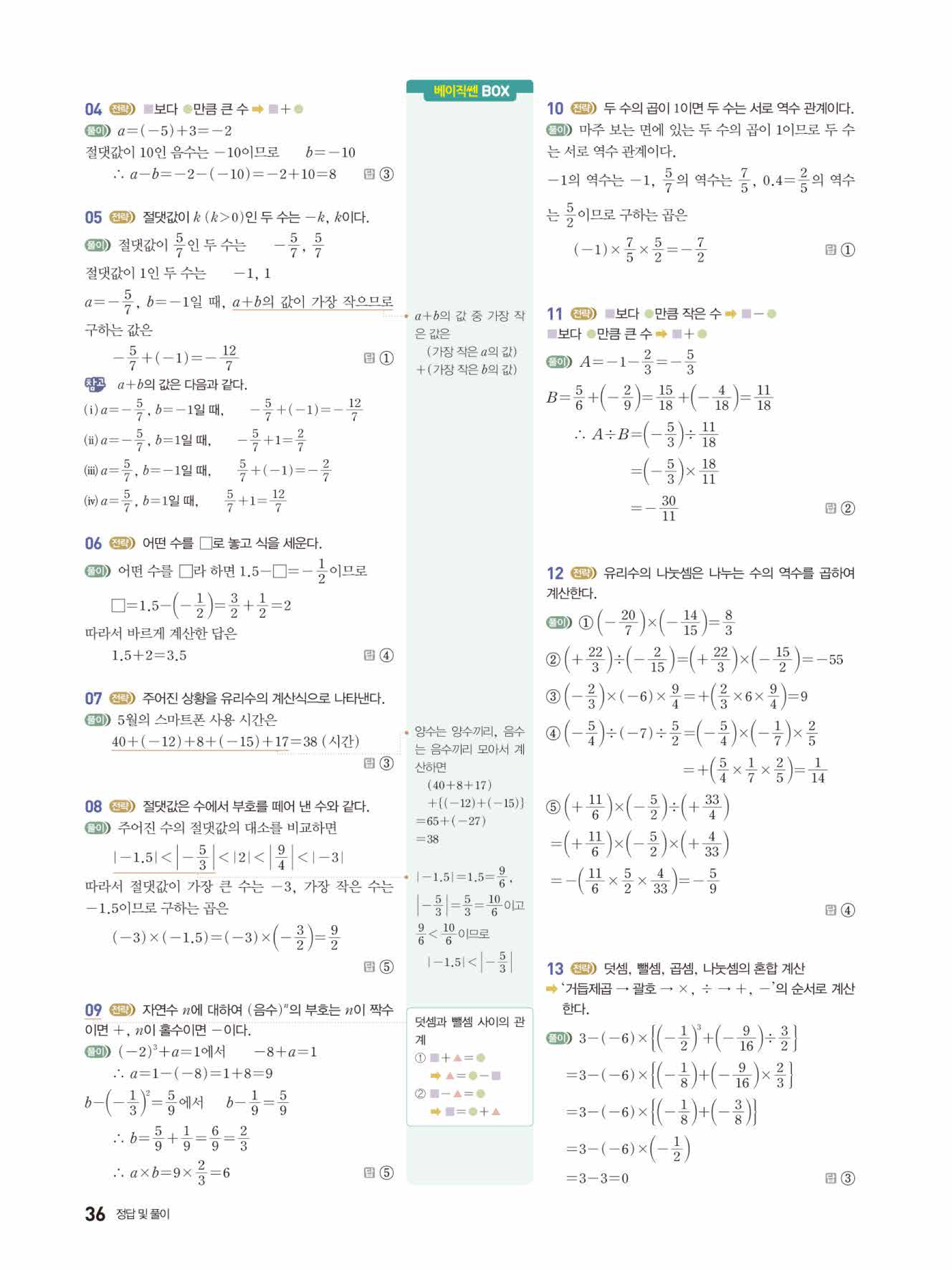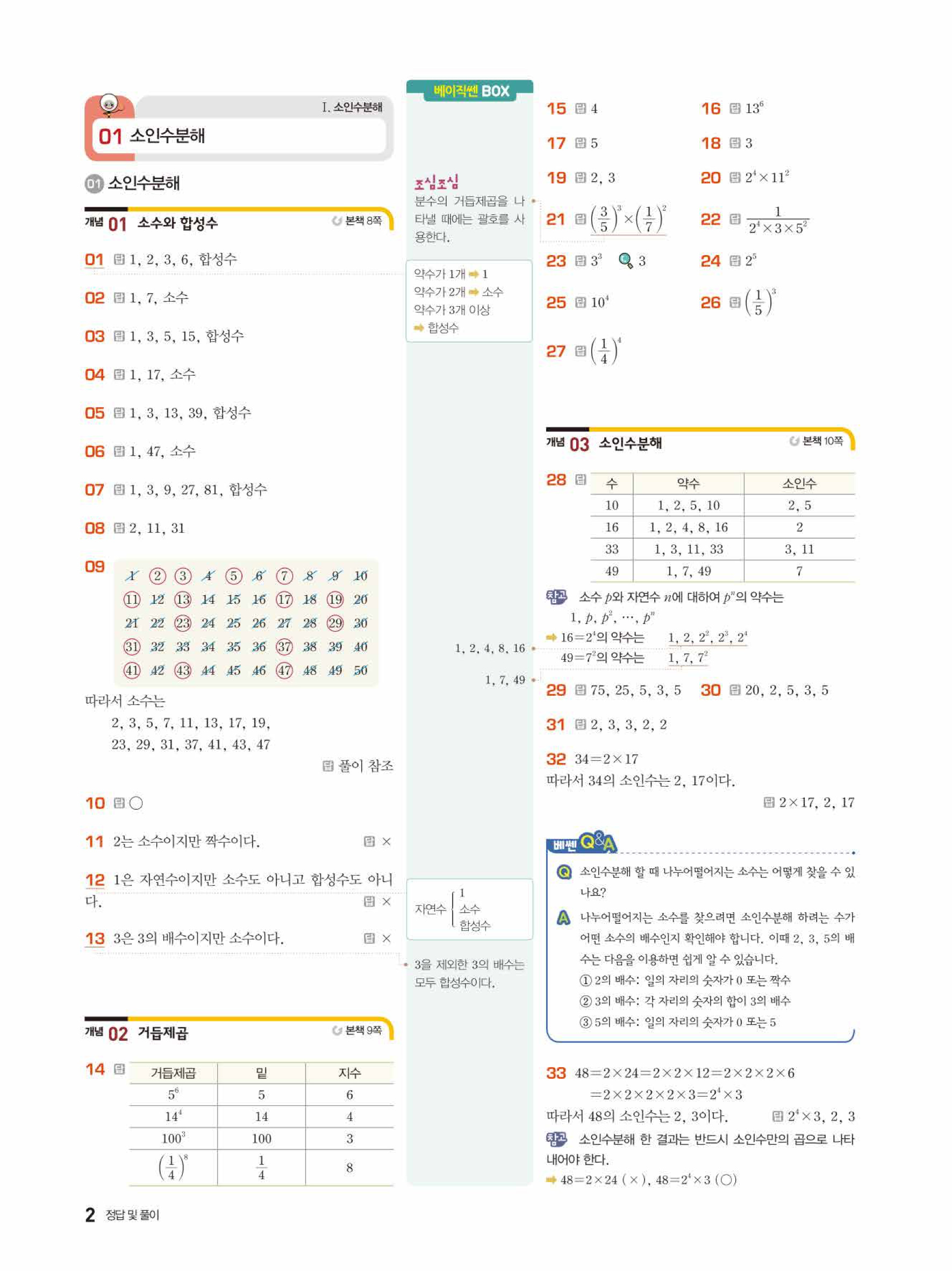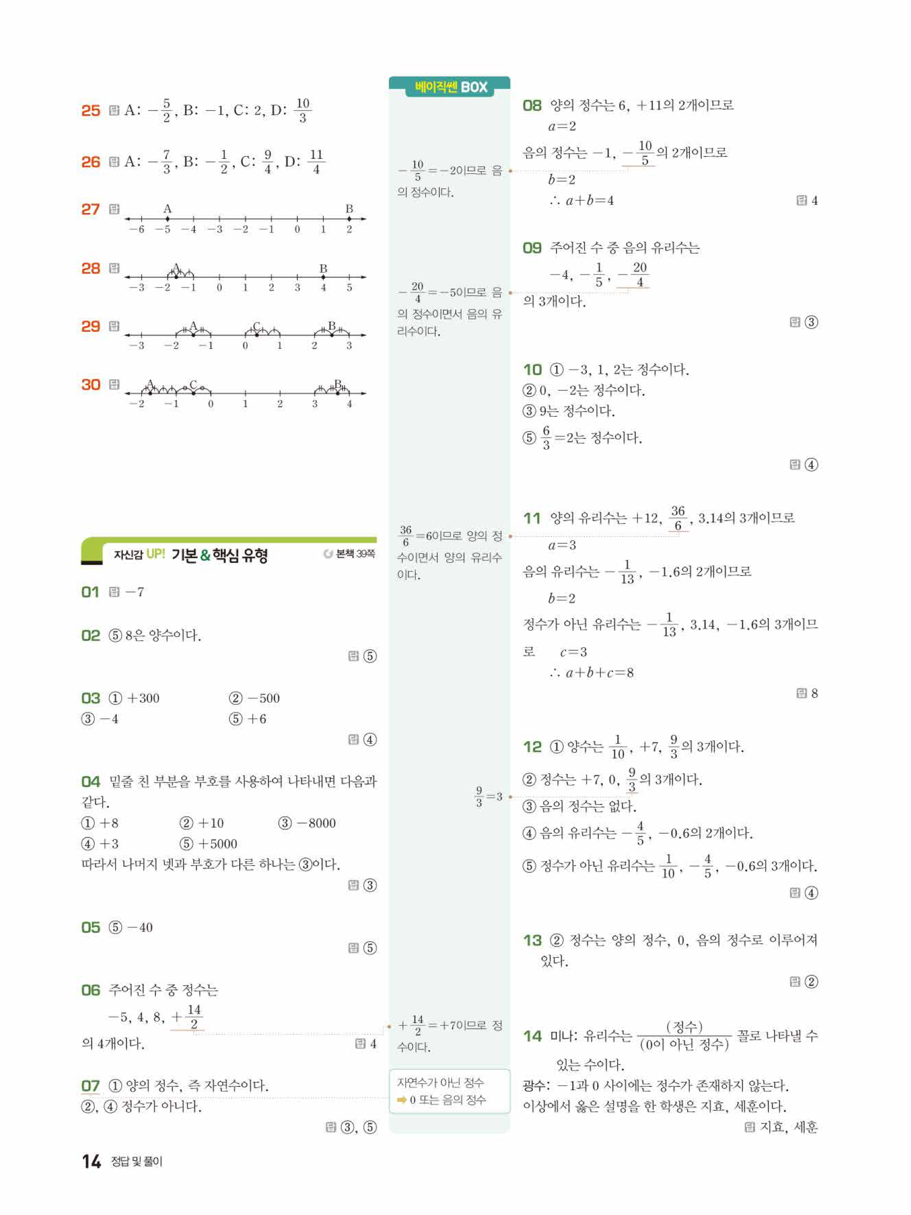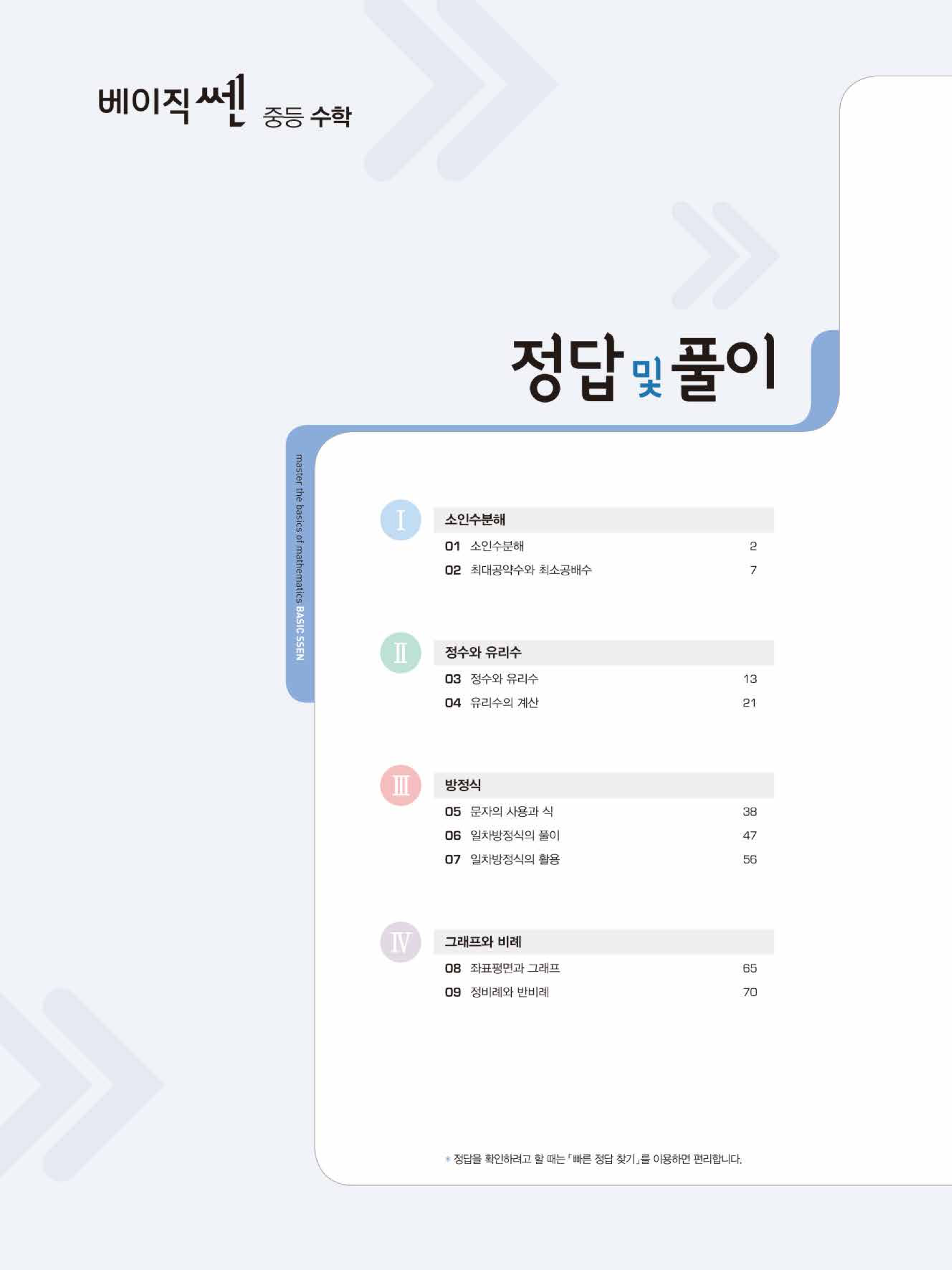 2. 베이직쎈 중등 1학년 1학기(1-1) 답지와 해설 자료