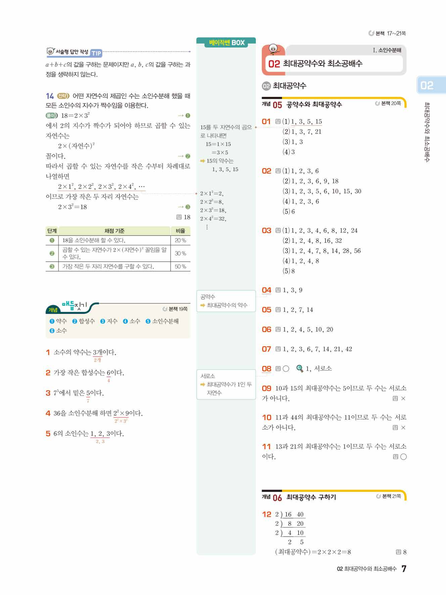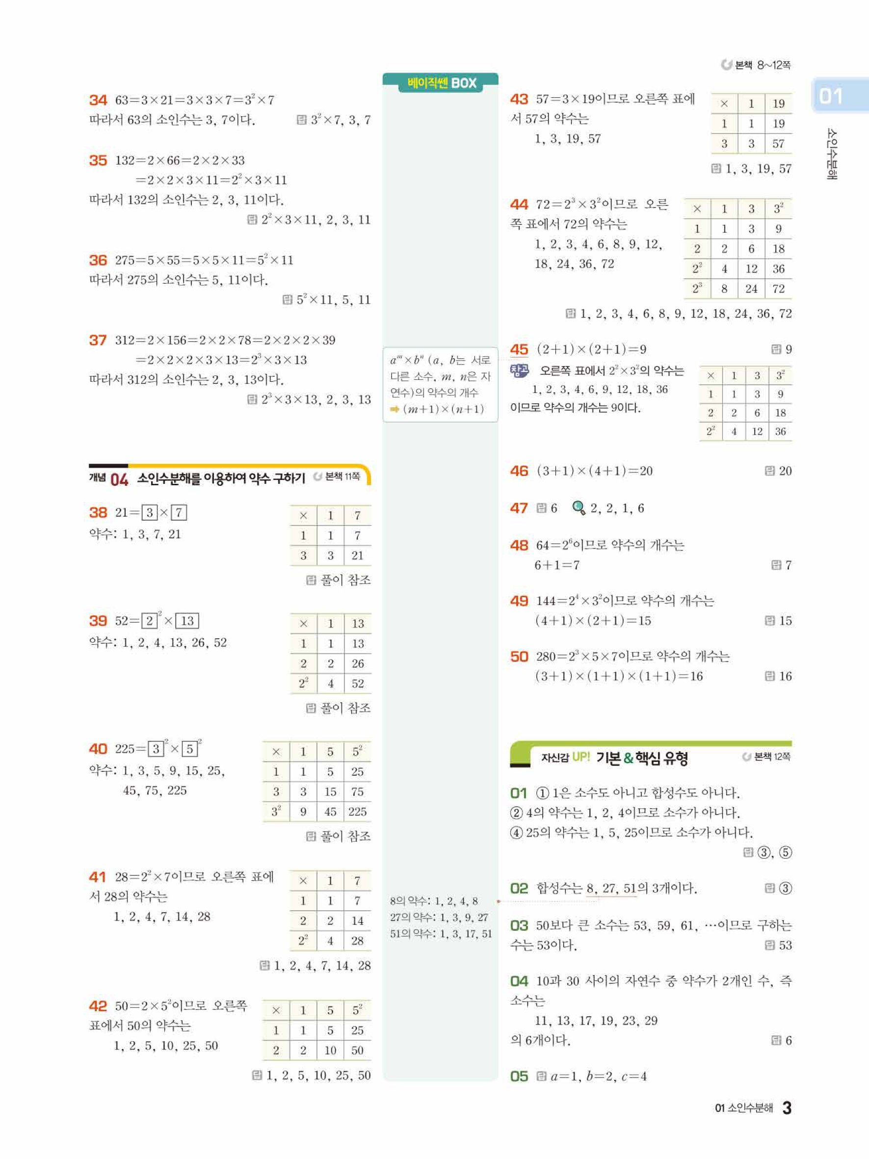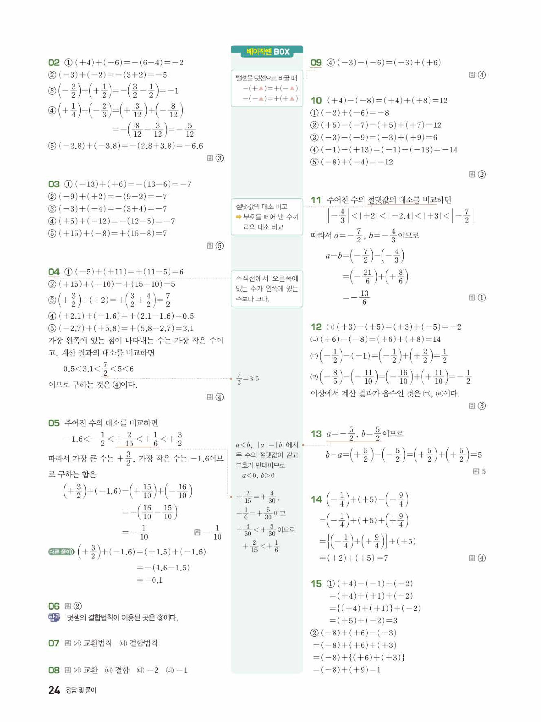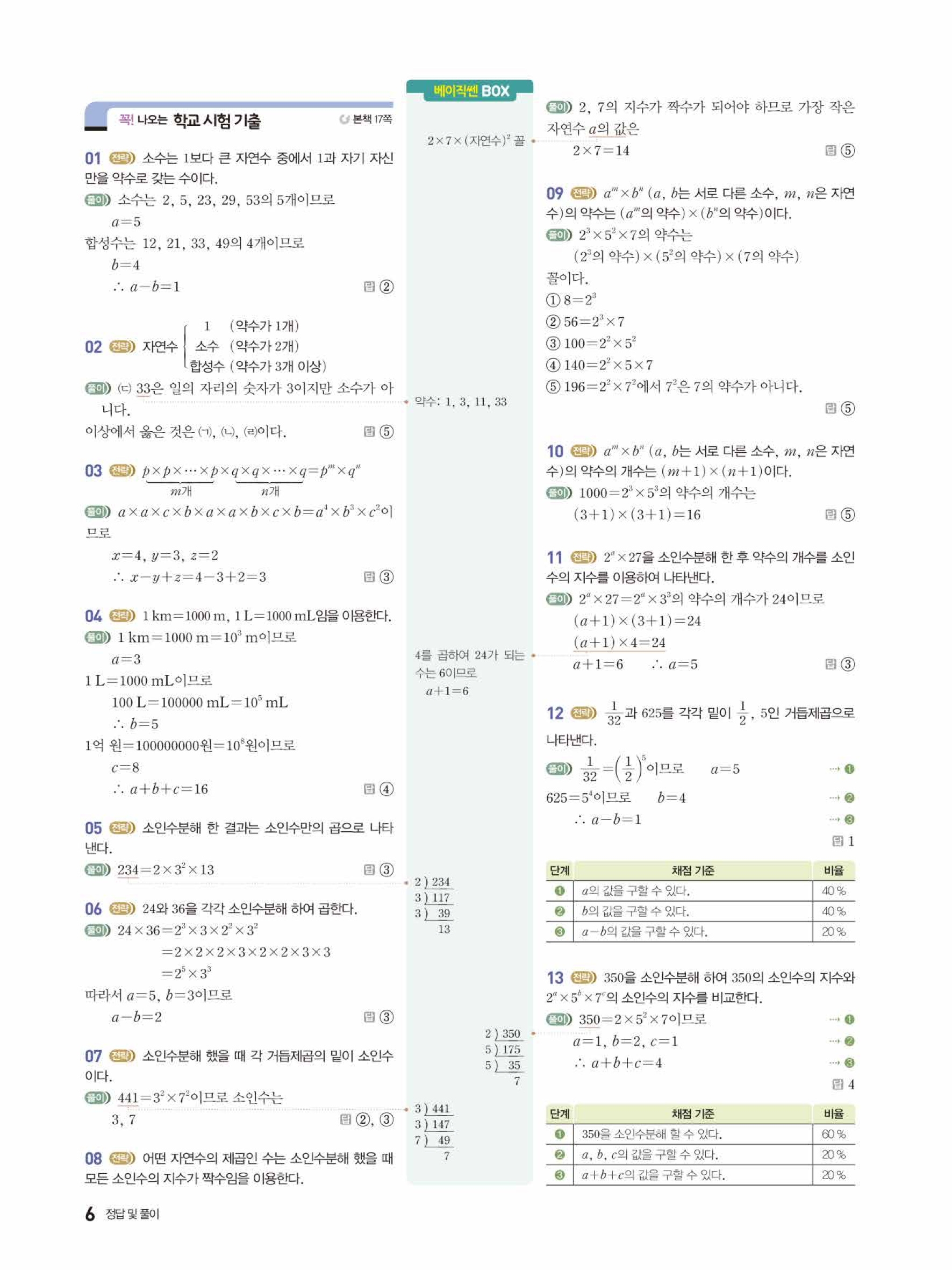 2. 베이직쎈 중등 1학년 1학기(1-1) 답지와 해설 자료