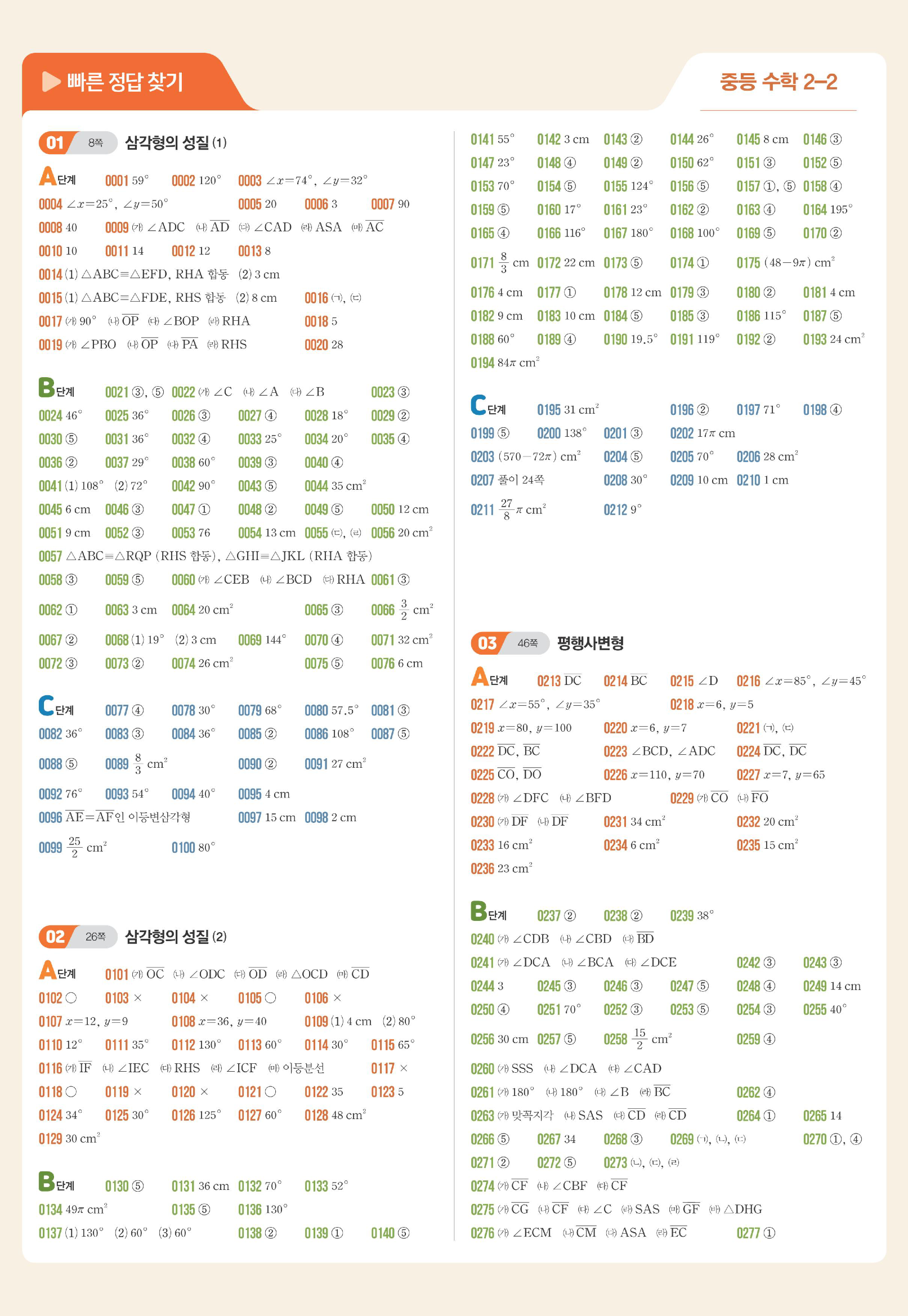 쎈 중2-2 답지 활용 가이드 안녕하세요! 중학 수학의 정석, 쎈 중등 수학 2-2 답지입니다. 2학년 2학기 과정은 삼각형과 사각형의 성질부터 도형의 닮음, 피타고라스 정리, 확률까지 기하와 통계의