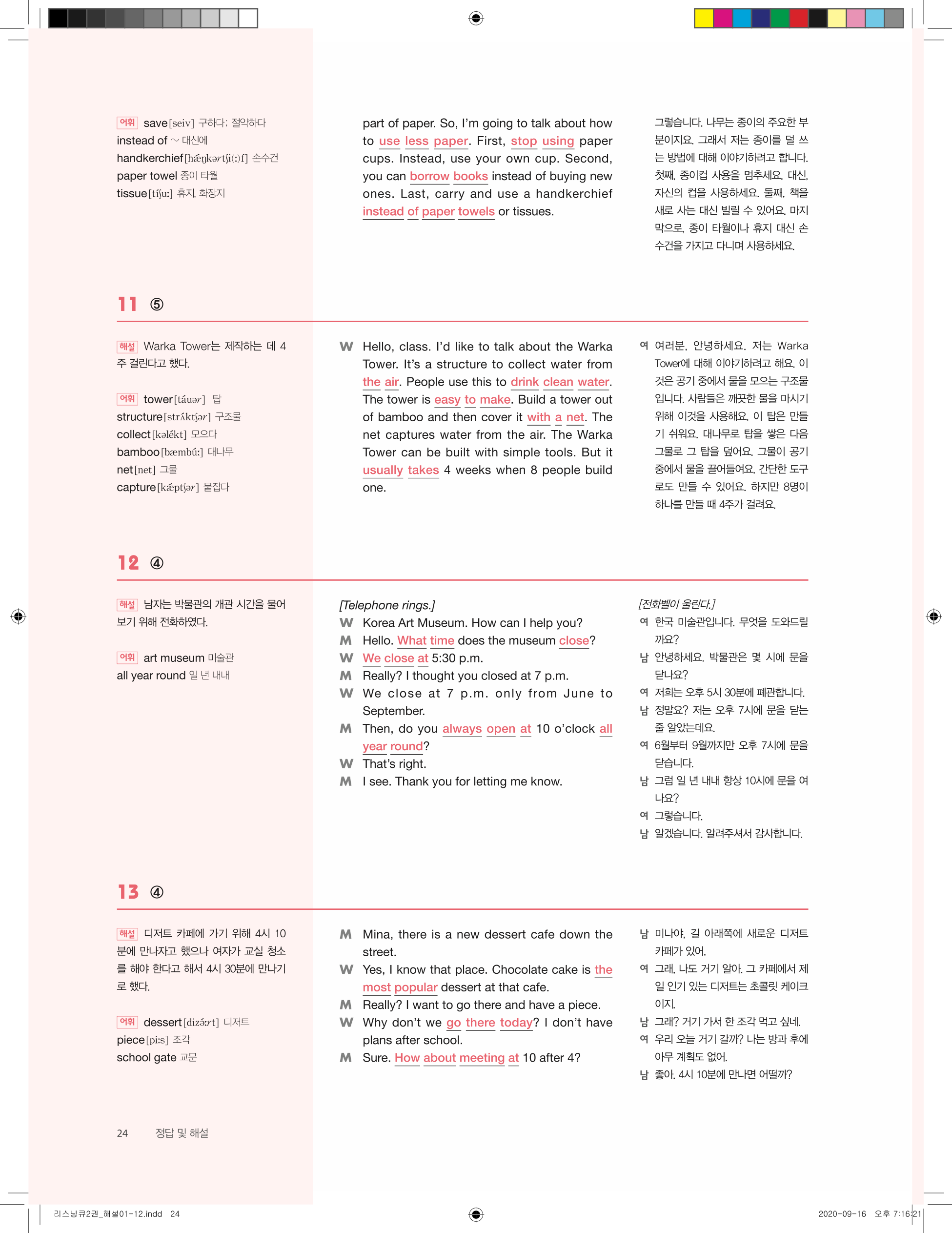 📢 세듀 리스닝큐2 중학영어듣기 모의고사 24회 답지 해설 풀이 빠른답지 PDF 다운로드