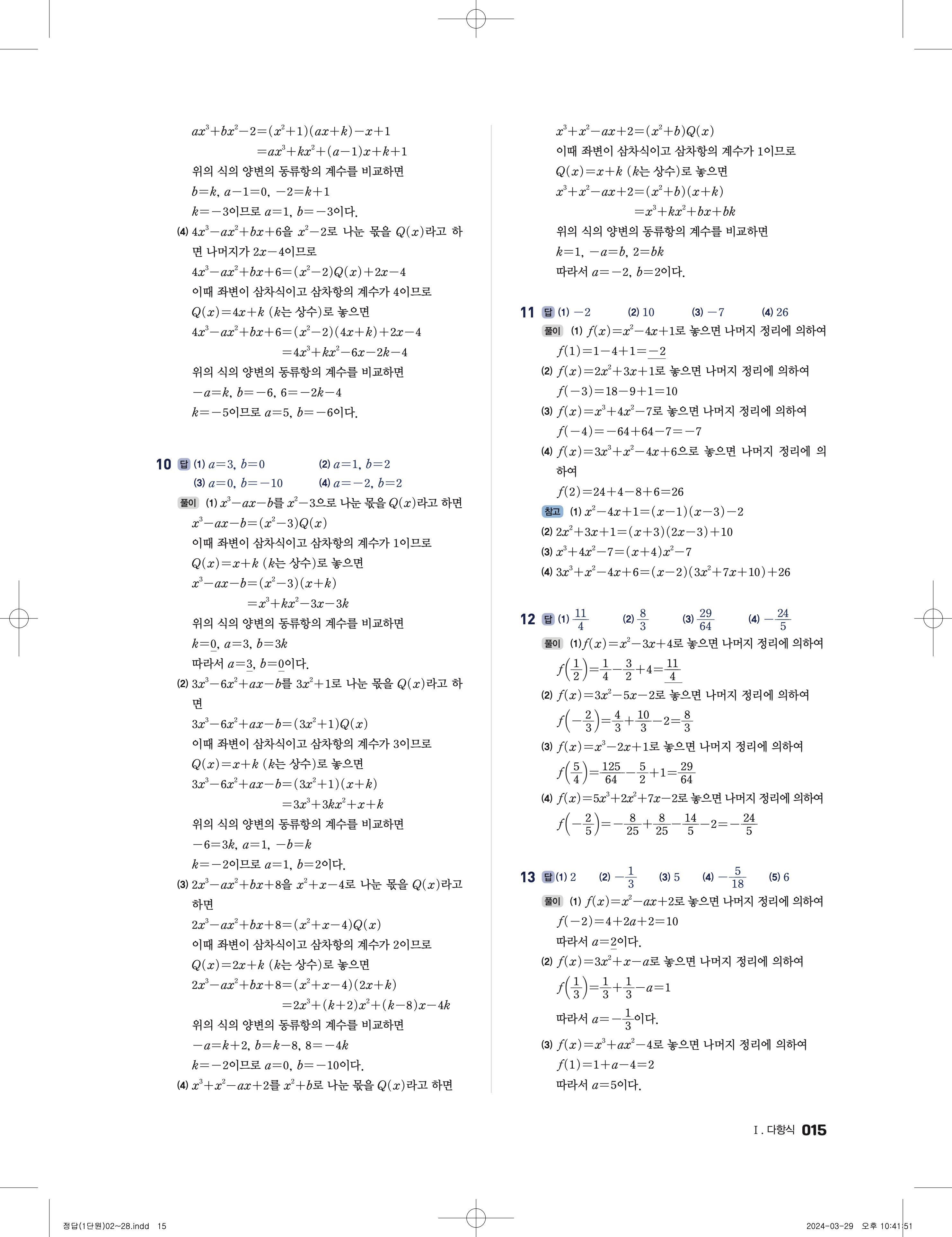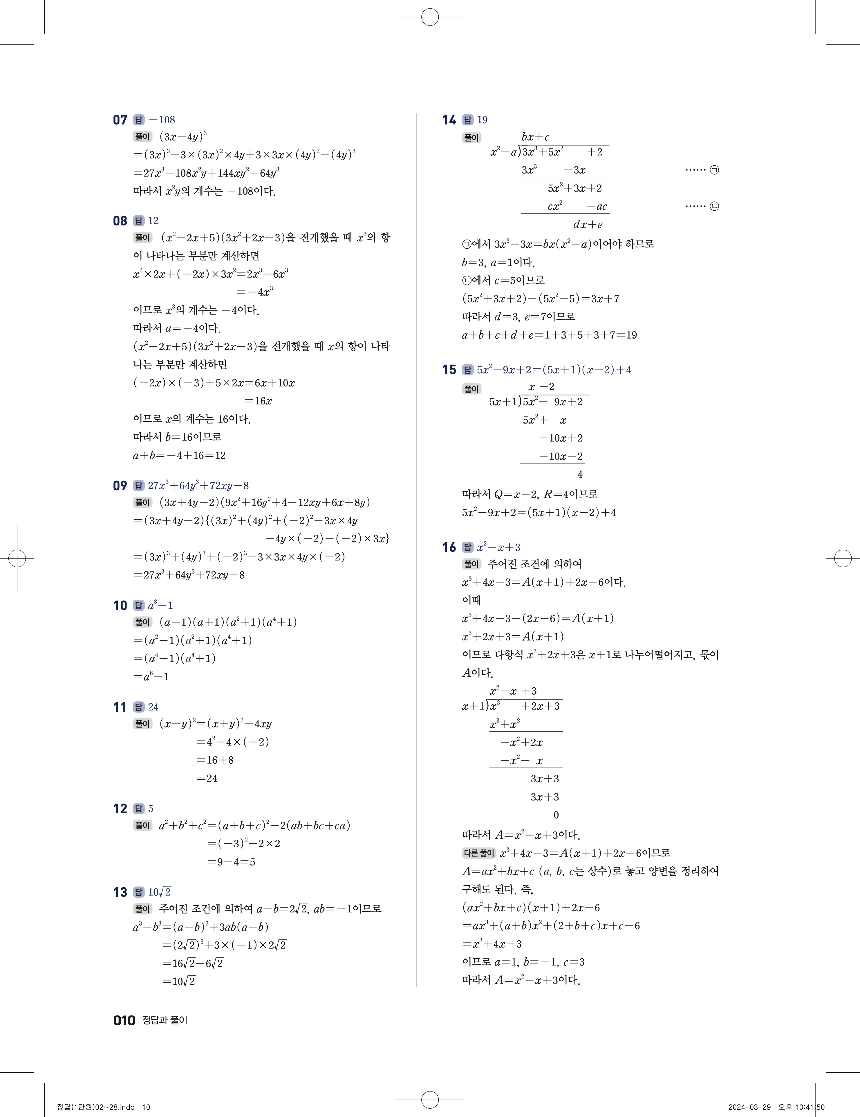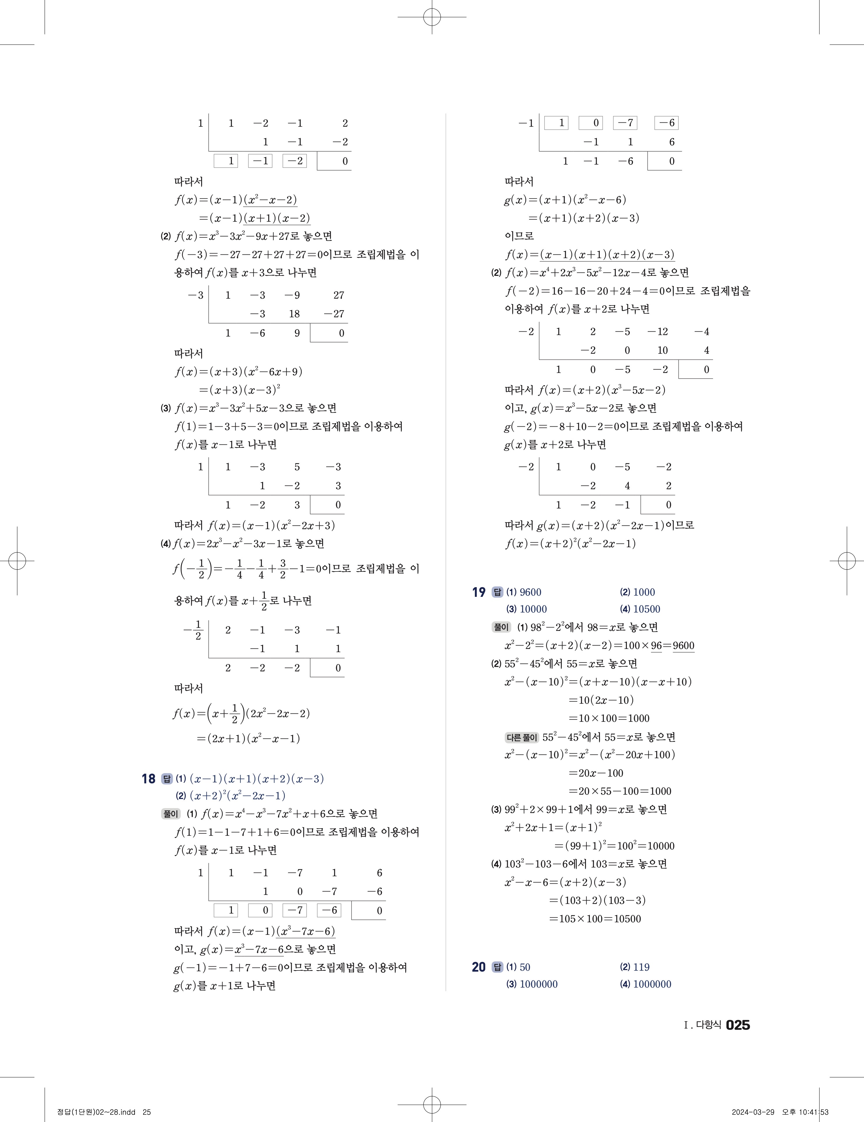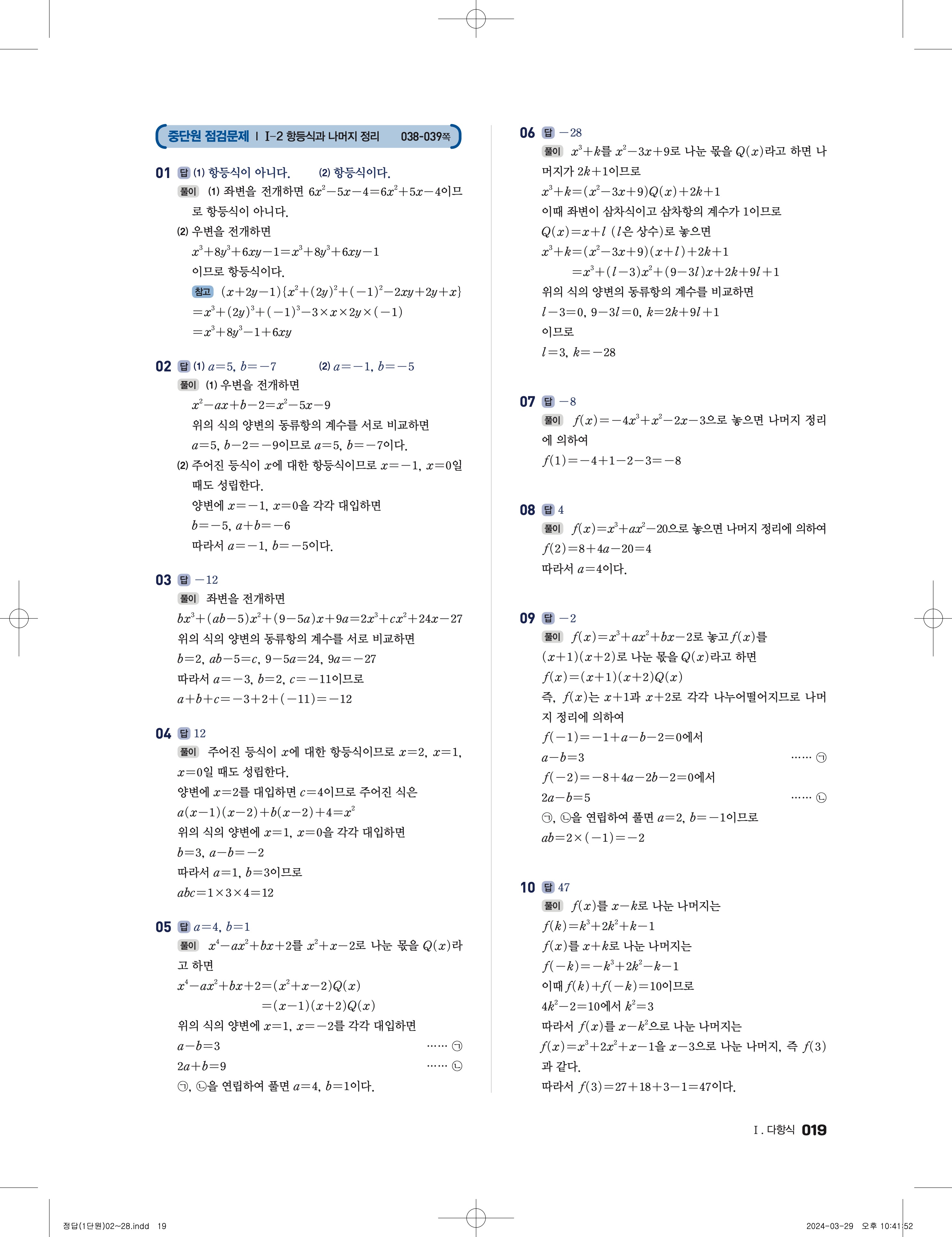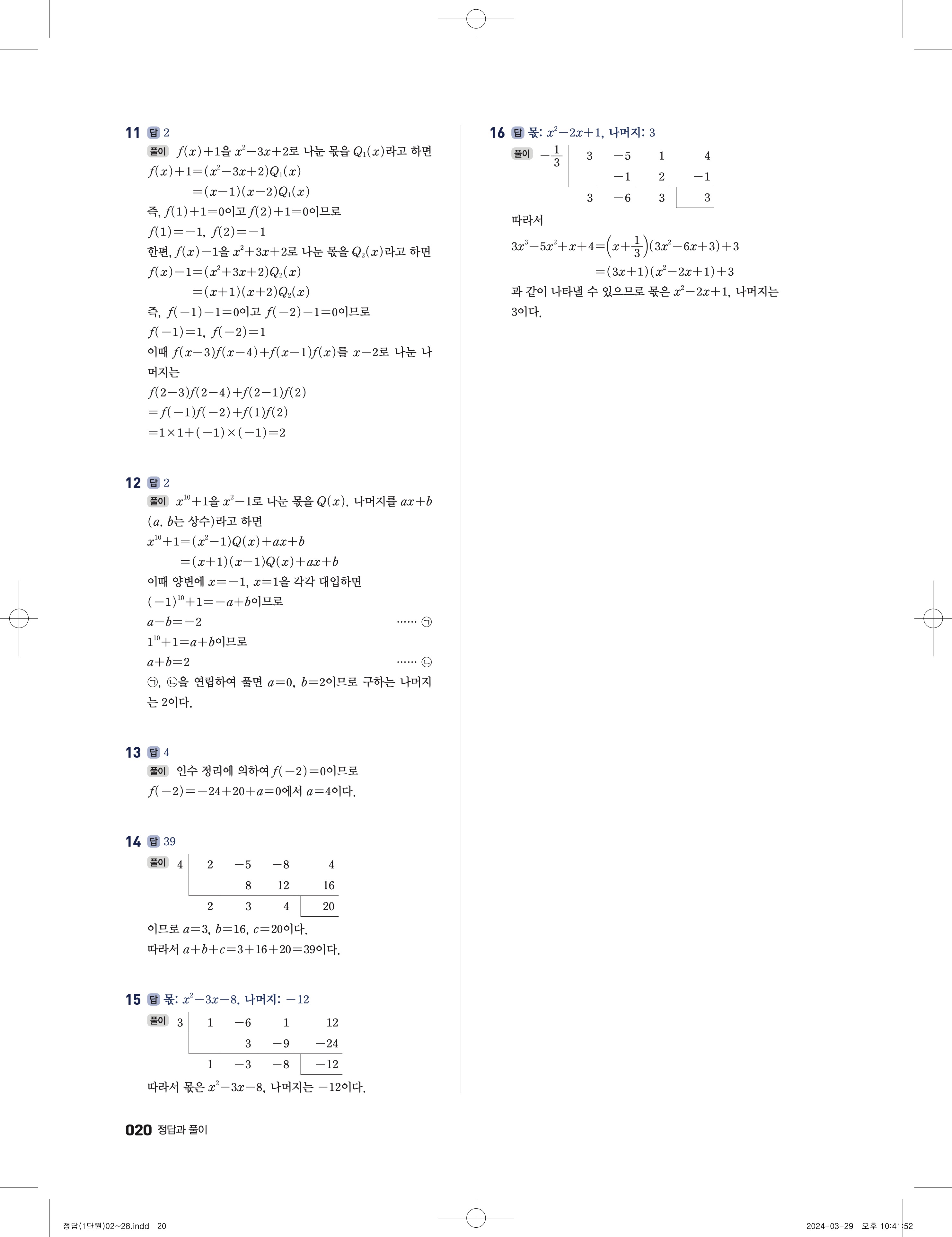급하게 채점이 필요하신 분들을 위해, 가장 많이 찾는 앞부분(다항식 연산, 나머지 정리) 정답을 텍스트로 먼저 공개합니다. 스크롤을 내려 확인하세요.