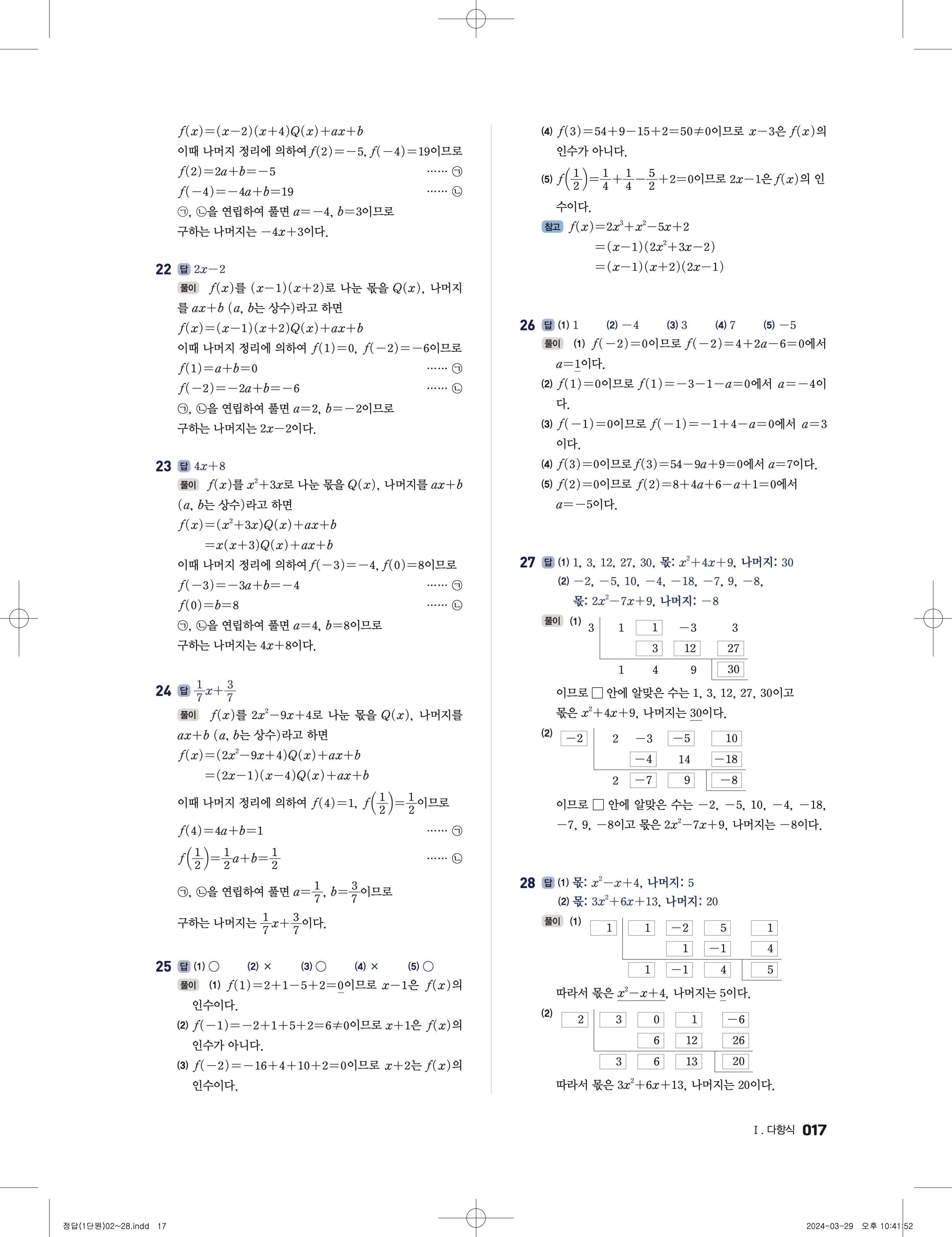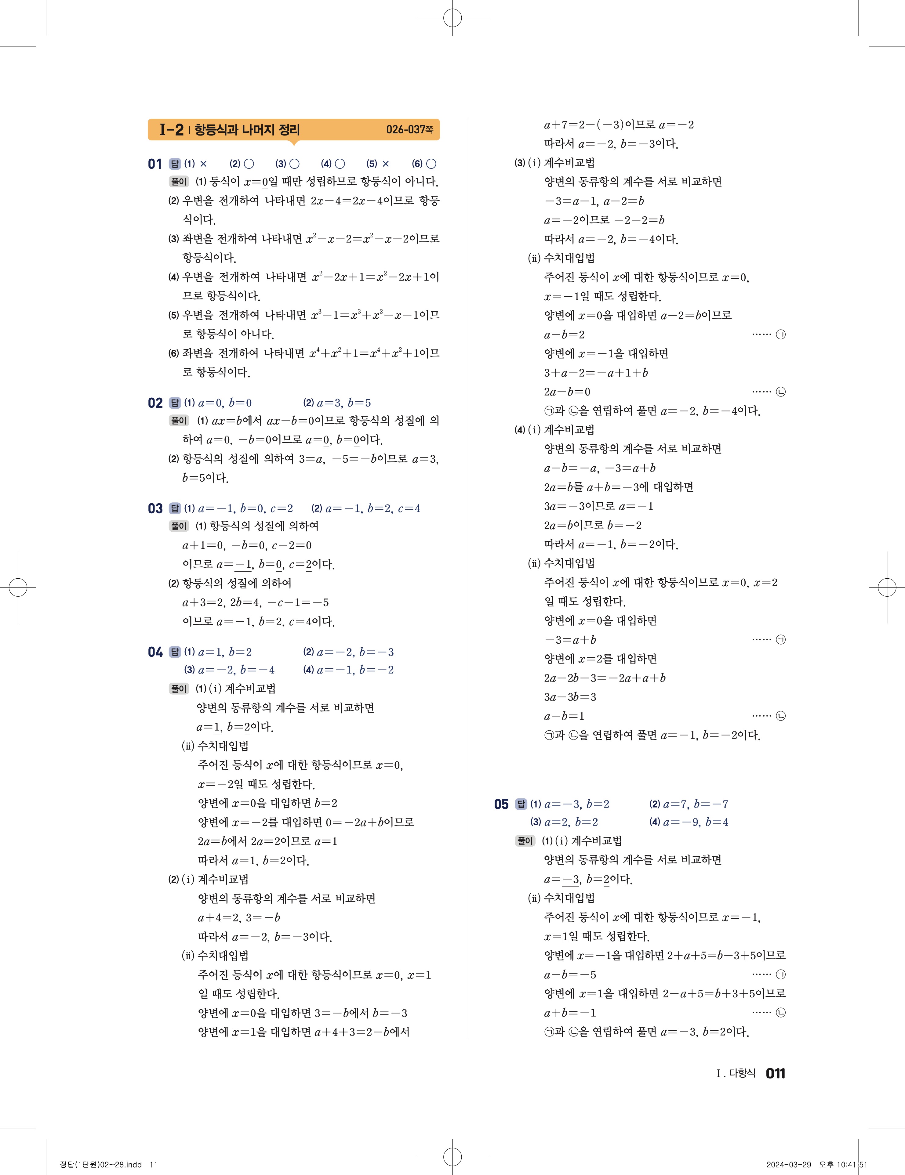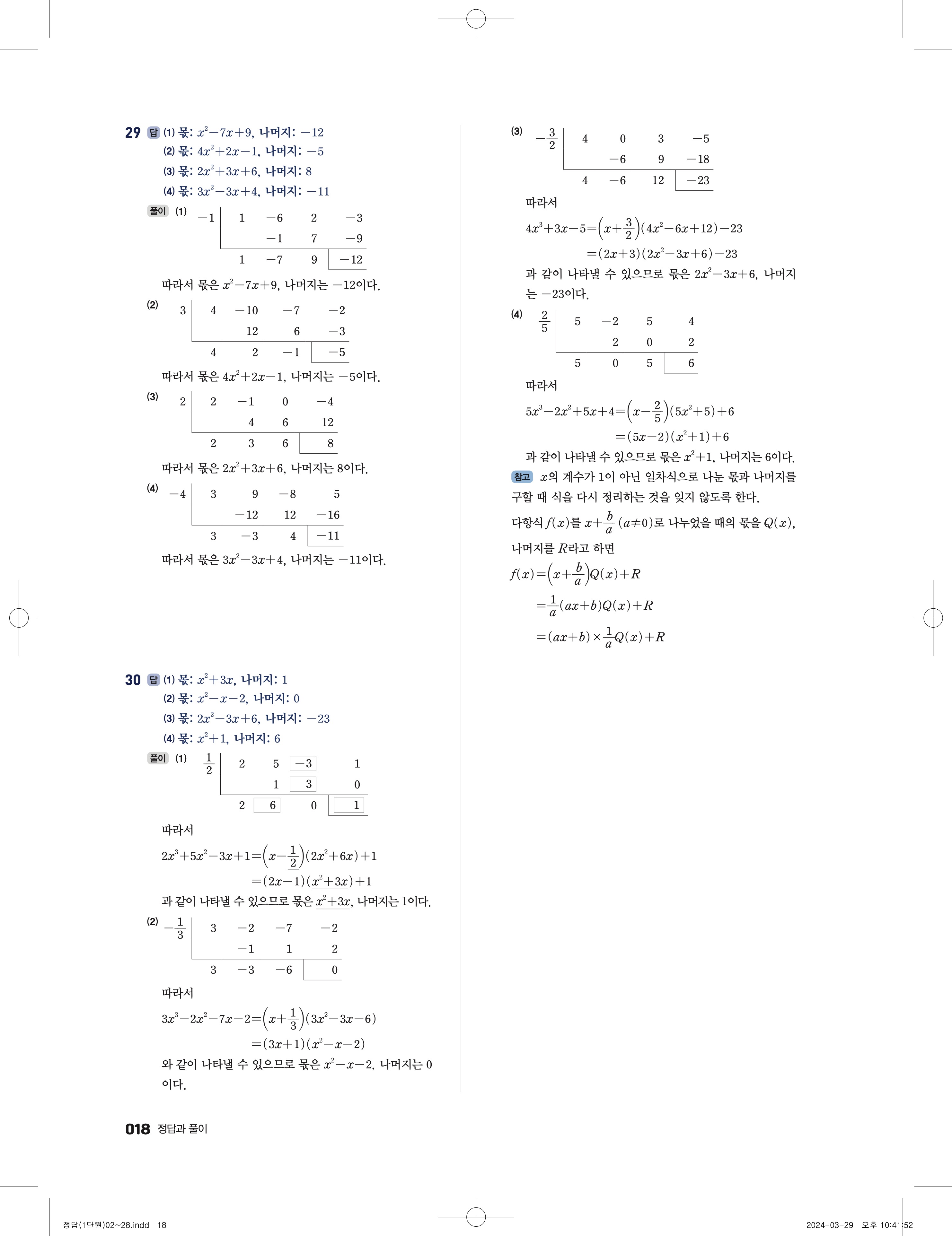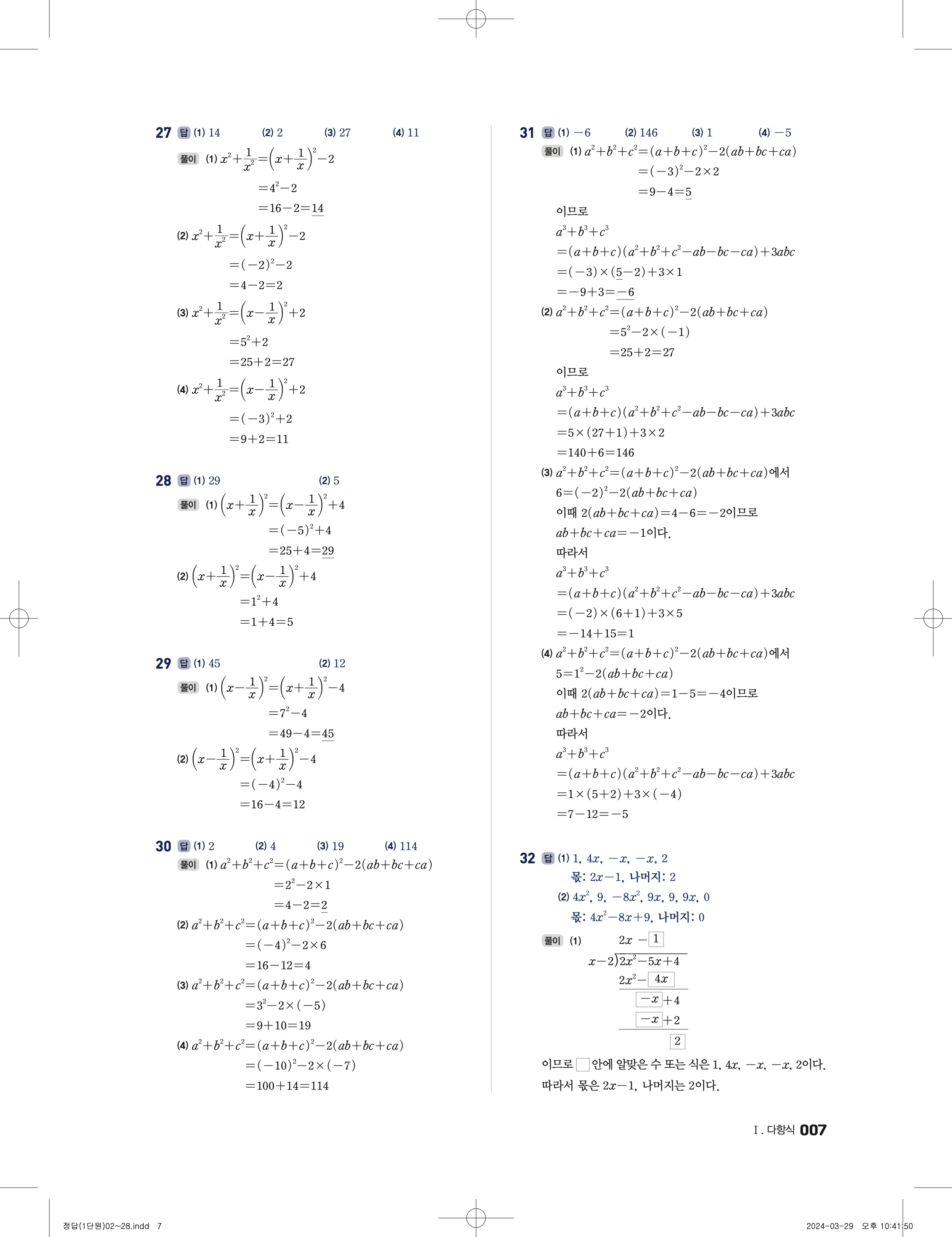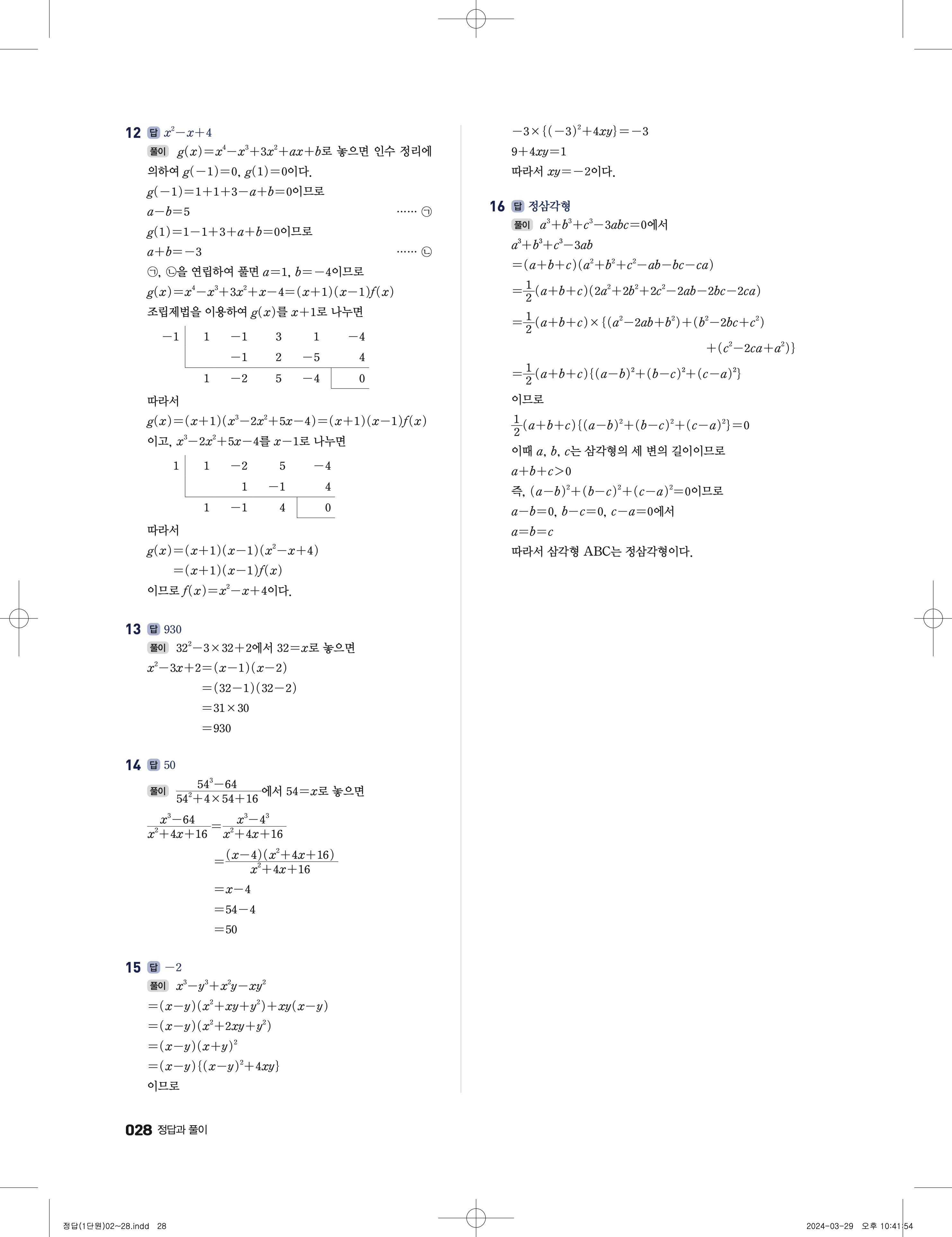 급하게 채점이 필요하신 분들을 위해, 가장 많이 찾는 앞부분(다항식 연산, 나머지 정리) 정답을 텍스트로 먼저 공개합니다. 스크롤을 내려 확인하세요.