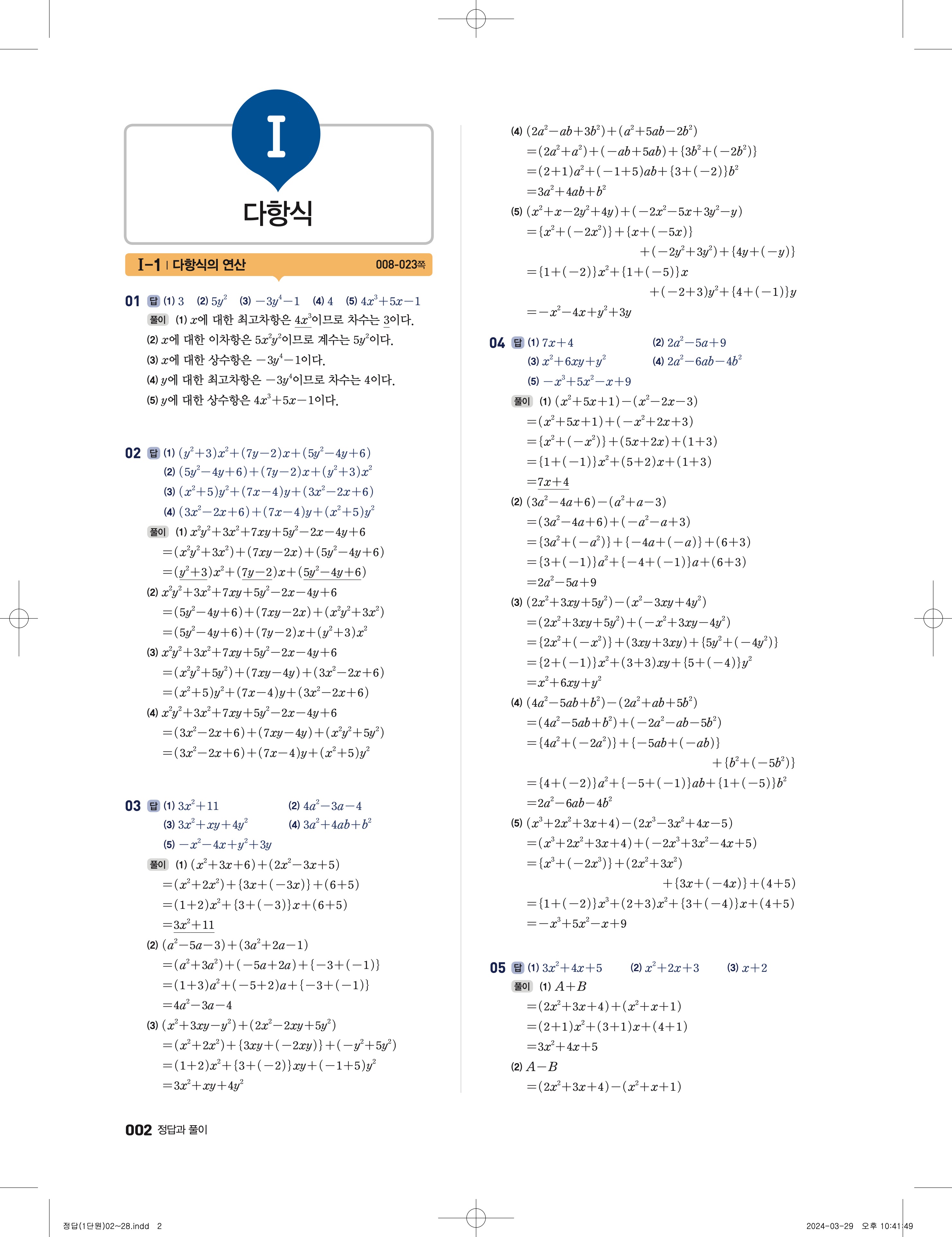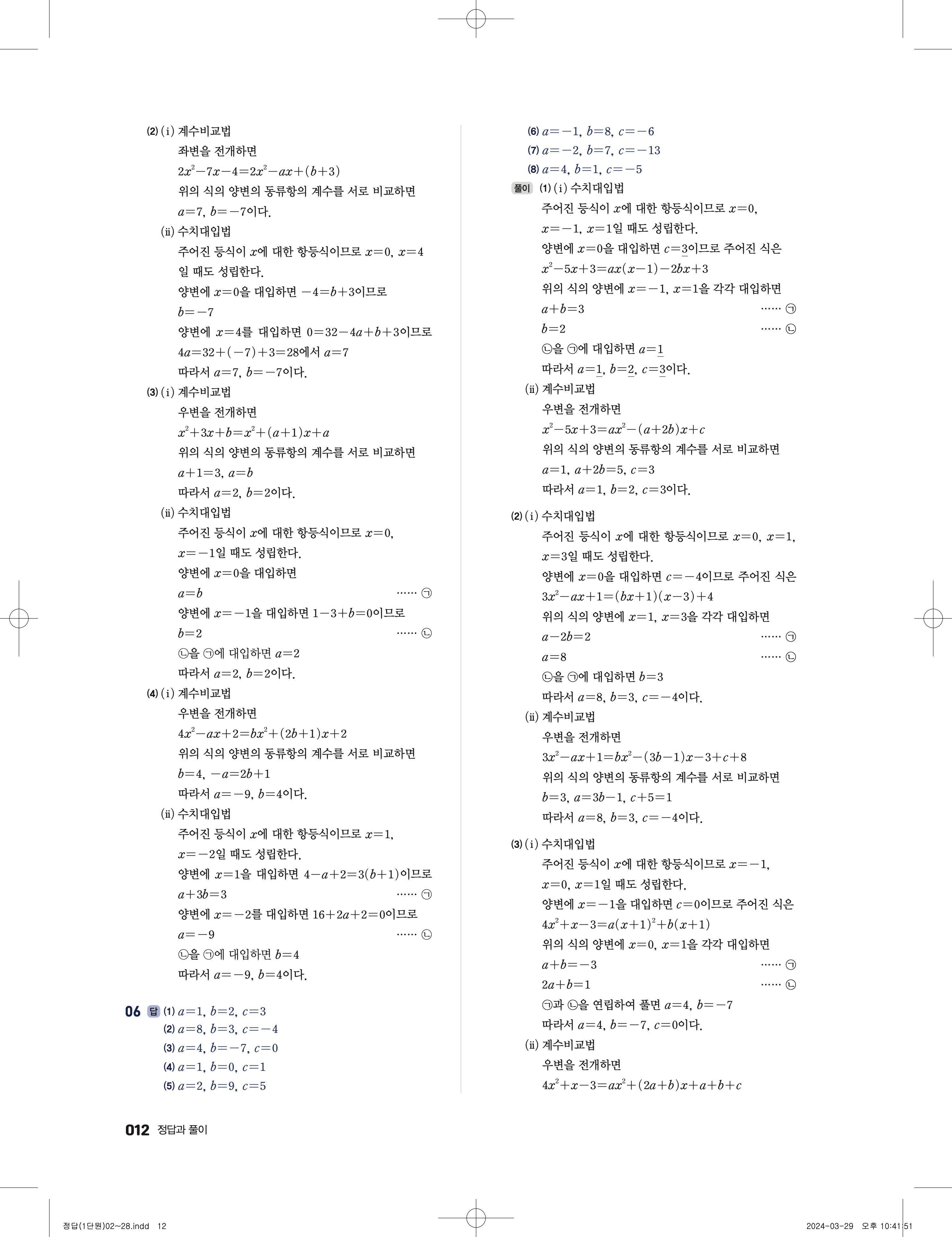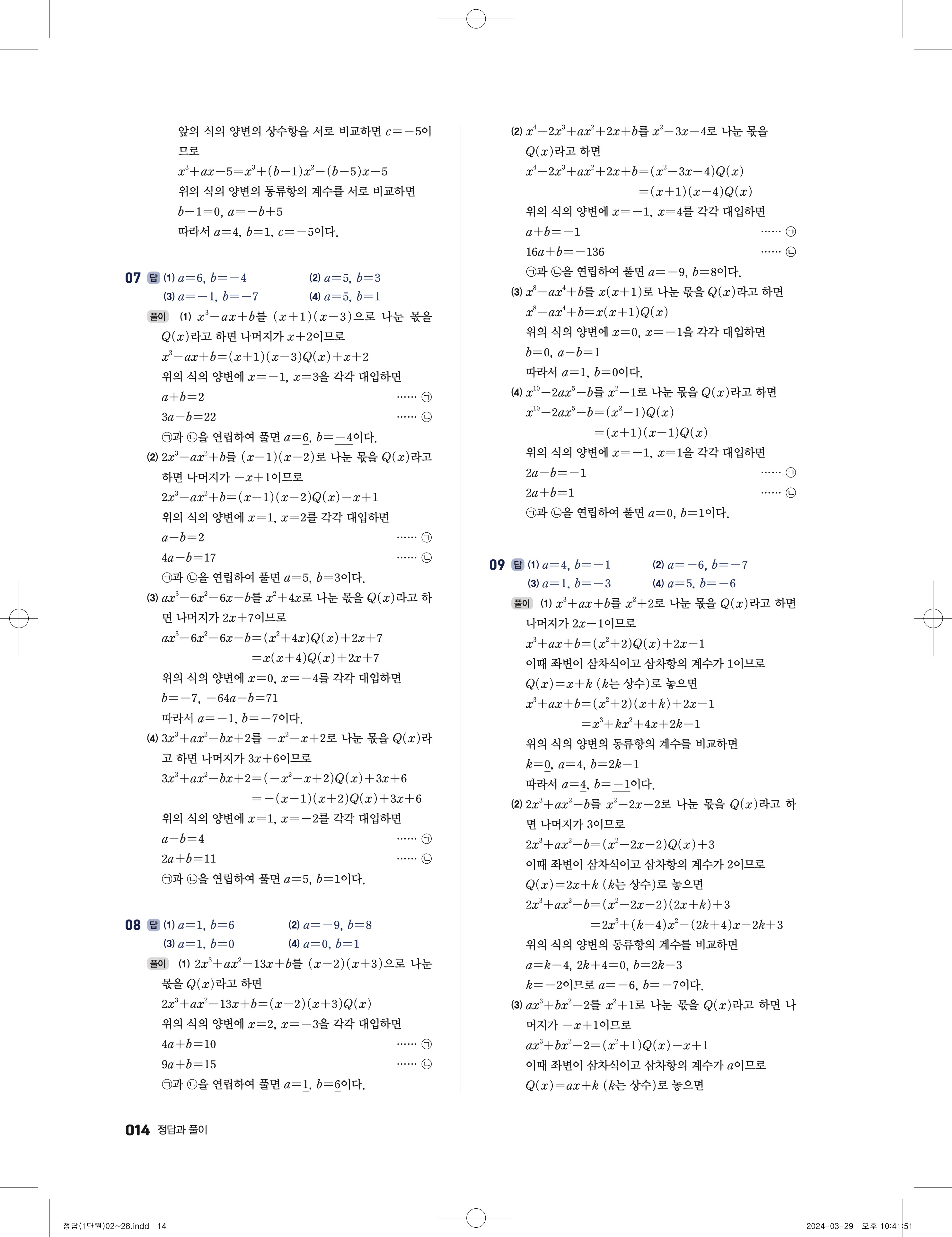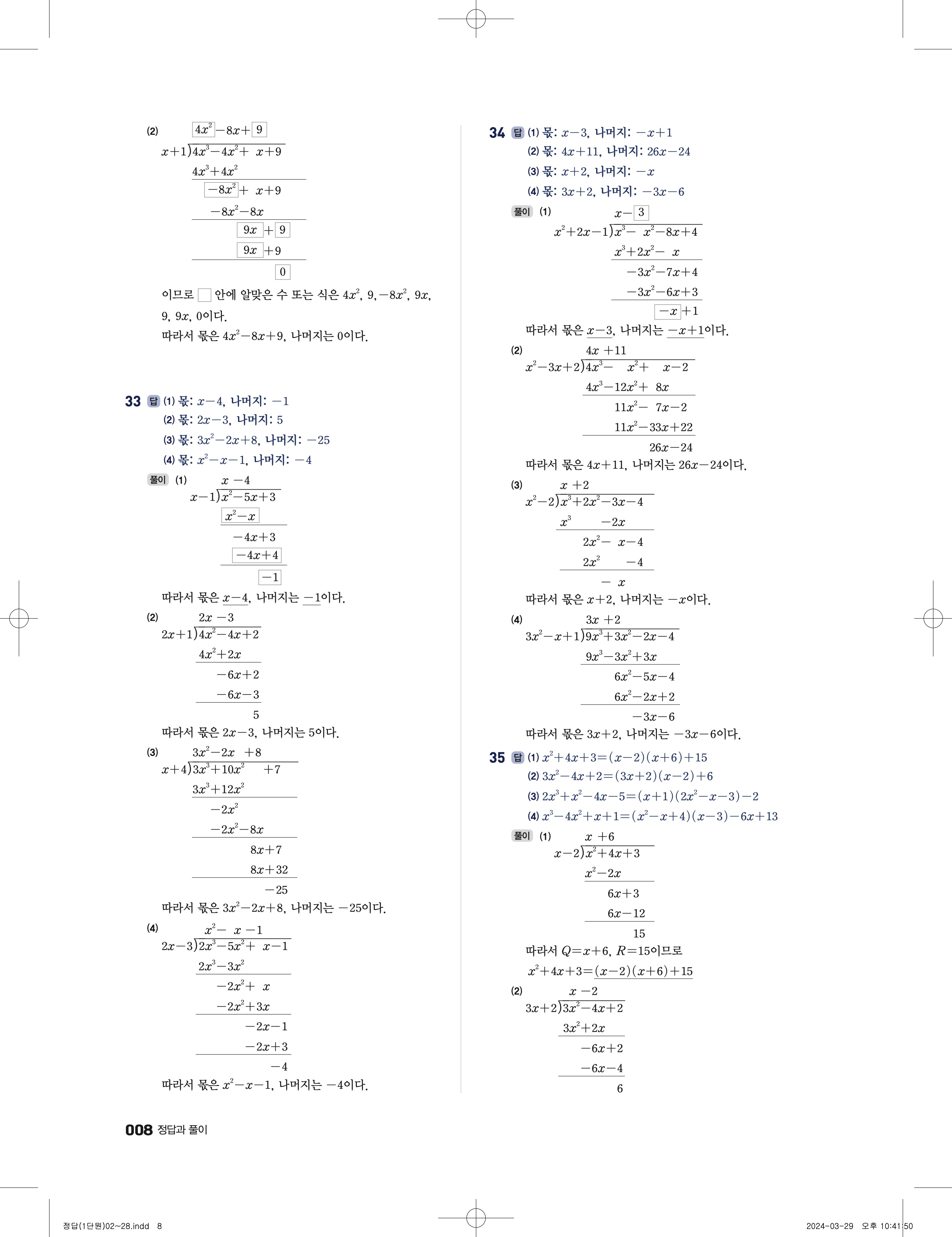 급하게 채점이 필요하신 분들을 위해, 가장 많이 찾는 앞부분(다항식 연산, 나머지 정리) 정답을 텍스트로 먼저 공개합니다. 스크롤을 내려 확인하세요.