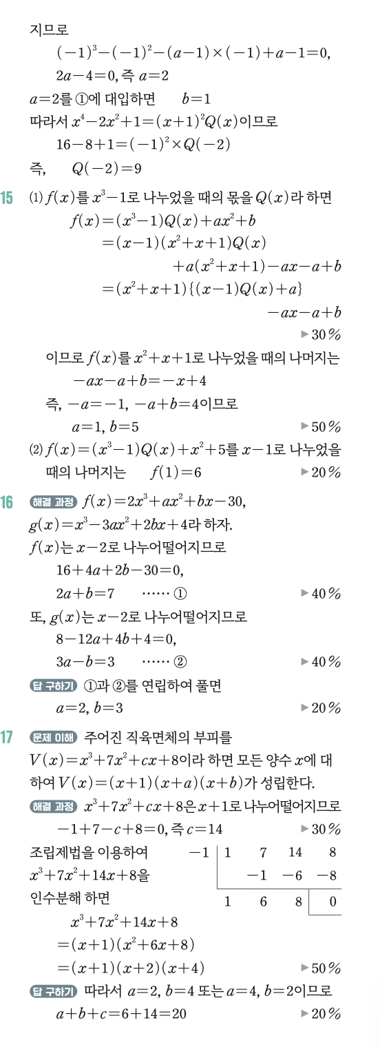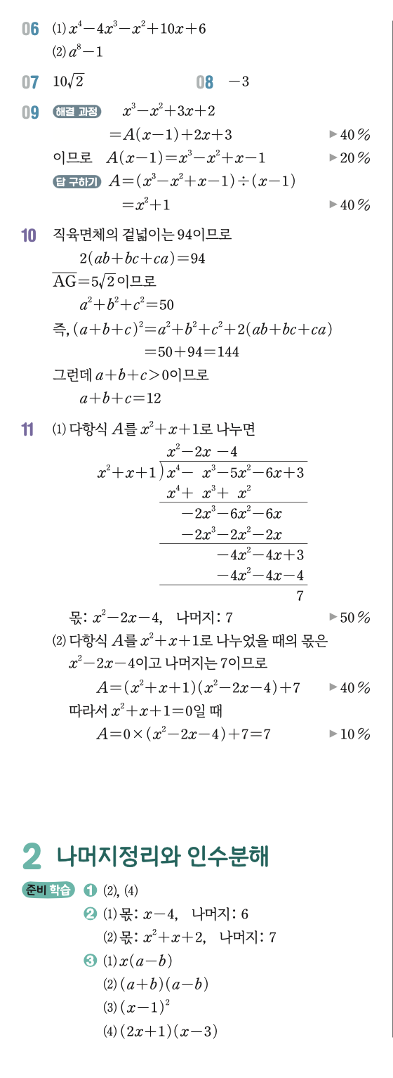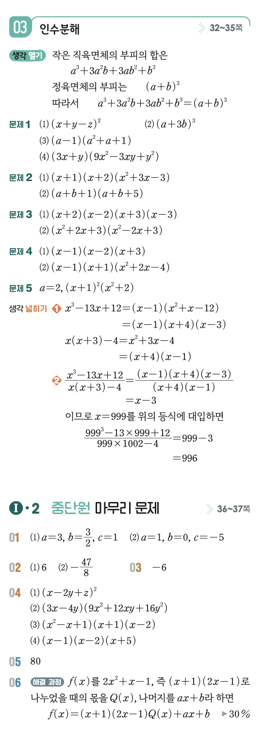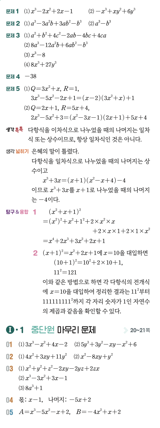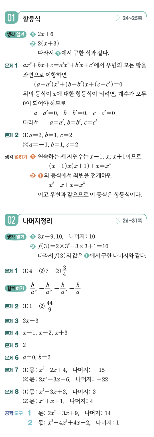 - I. 다항식: 다항식의 연산과 나머지 정리, 인수분해를 다룹니다. 복잡한 식의 전개와 인수분해 공식을 암기가 아닌 원리로 이해하는 것이 중요합니다.