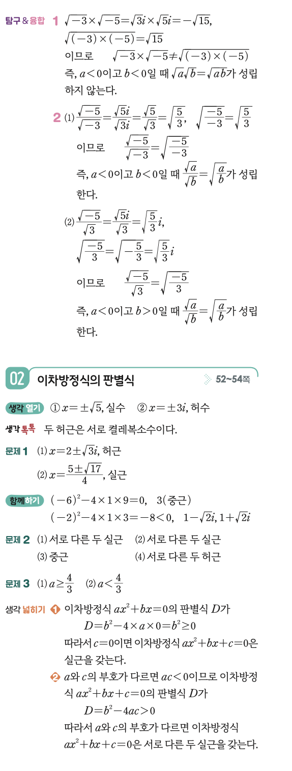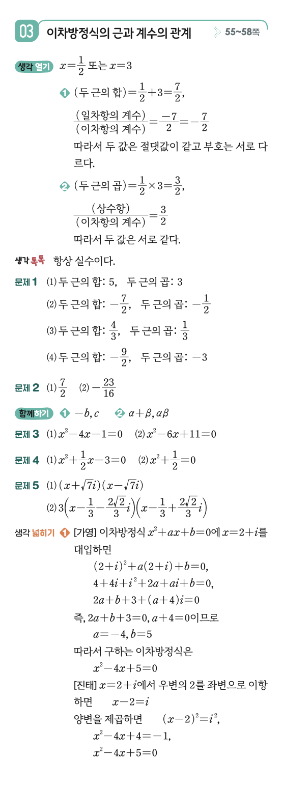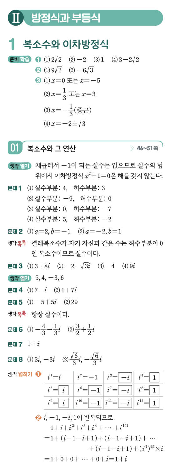 - II. 방정식과 부등식: 복소수의 성질과 이차방정식, 이차함수의 관계를 배웁니다.