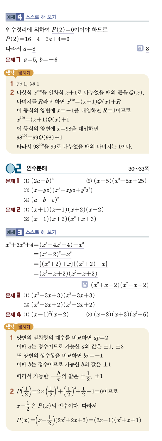 - I. 다항식: 다항식의 사칙연산, 나머지 정리와 인수분해의 원리를 이해합니다.