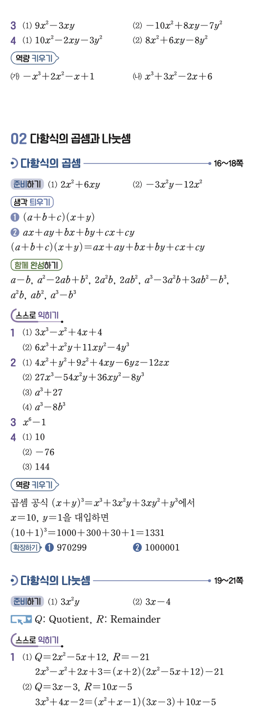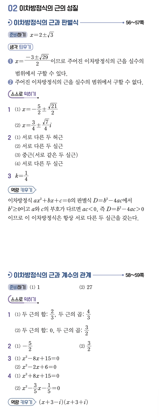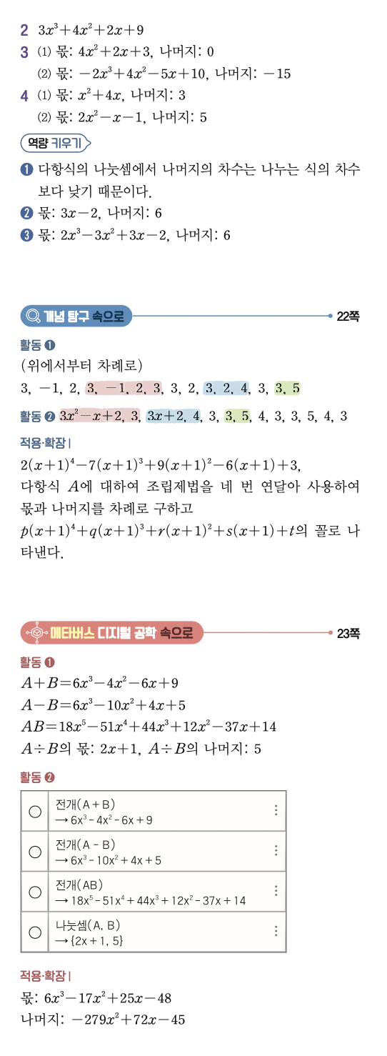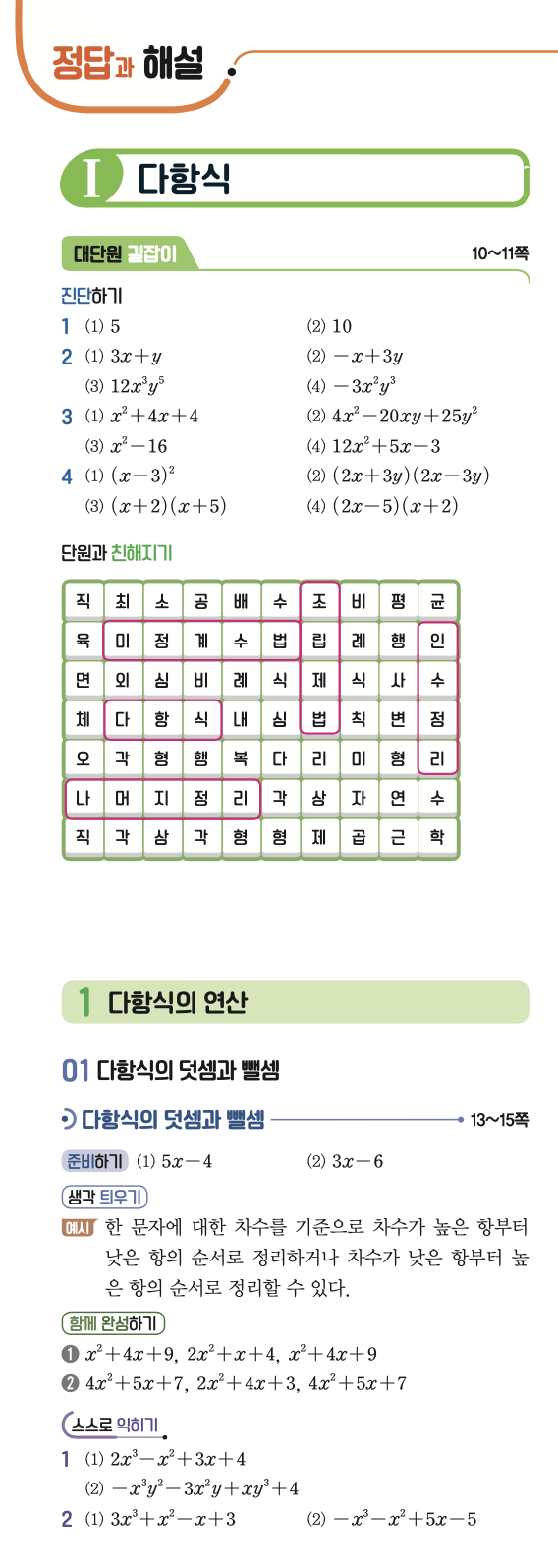 - 교과서 본문 뒤 '정답과 풀이': 교과서 맨 뒷부분에 수록된 정답 섹션에는 모든 예제와 연습문제의 정답 및 주요 문항 해설이 포함되어 있습니다.