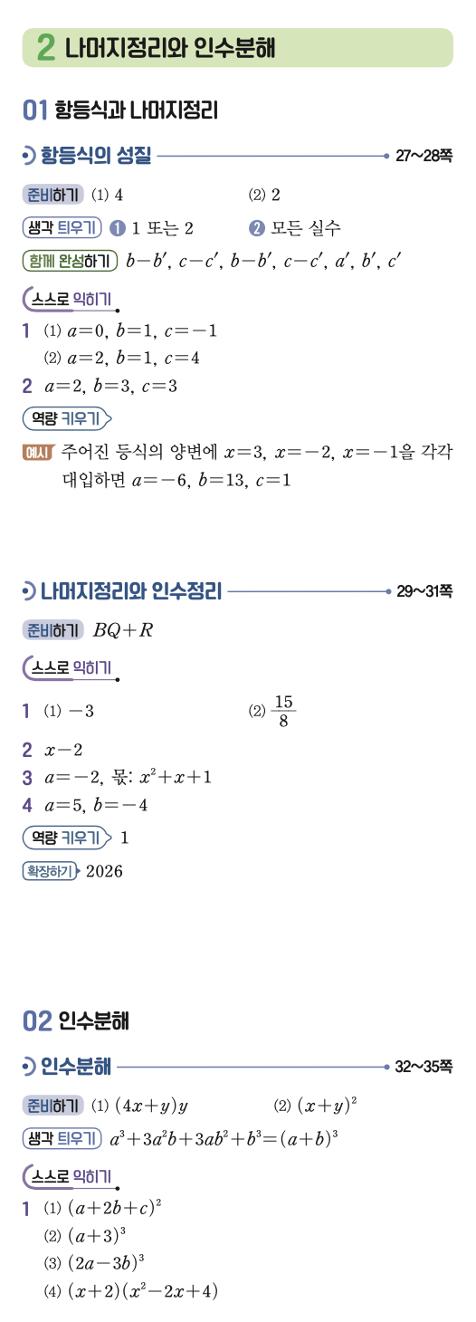 - I. 다항식: 다항식의 연산, 나머지 정리와 인수분해. (중등 수학의 확장판으로 식을 다루는 기술을 익힙니다.)