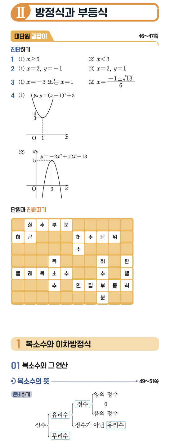 - II. 방정식과 부등식: 복소수, 이차방정식과 이차함수의 관계, 여러 가지 방정식과 부등식. (함수의 그래프와 방정식의 해를 연결하는 사고가 중요합니다.)