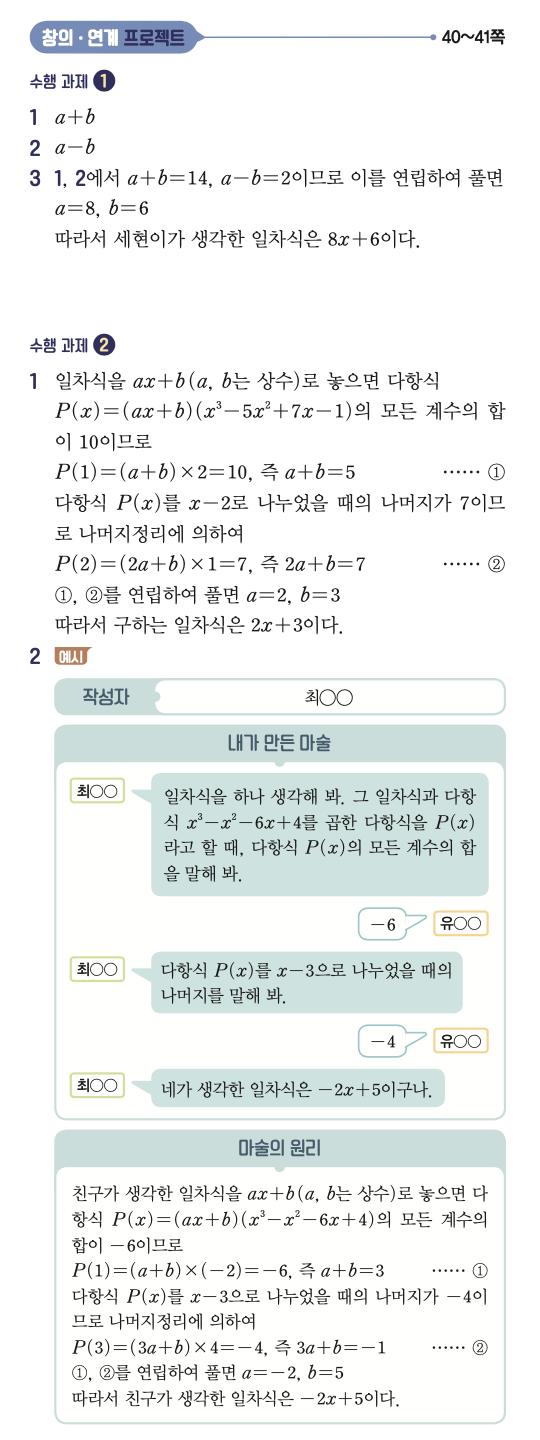 안녕하세요! 새로운 교육과정으로 고등 수학을 시작하는 학생 여러분 반갑습니다. 천재교과서(전인태) 공통수학1은 개념의 원리를 상세히 풀이하여 자기주도 학습에 매우 유용한 교재입니다. 학습 중 풀이 과정이 막히거나 정답 확인이 필요할 때 아래 가이드를 참고해 보세요.
