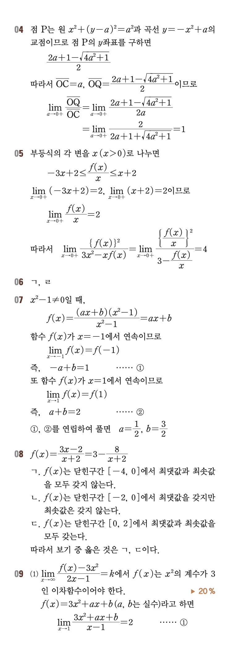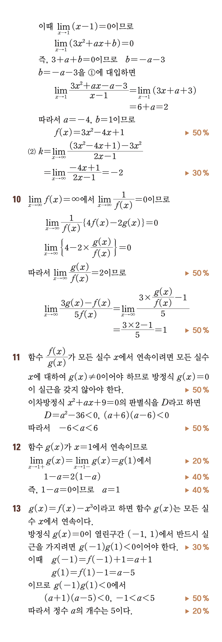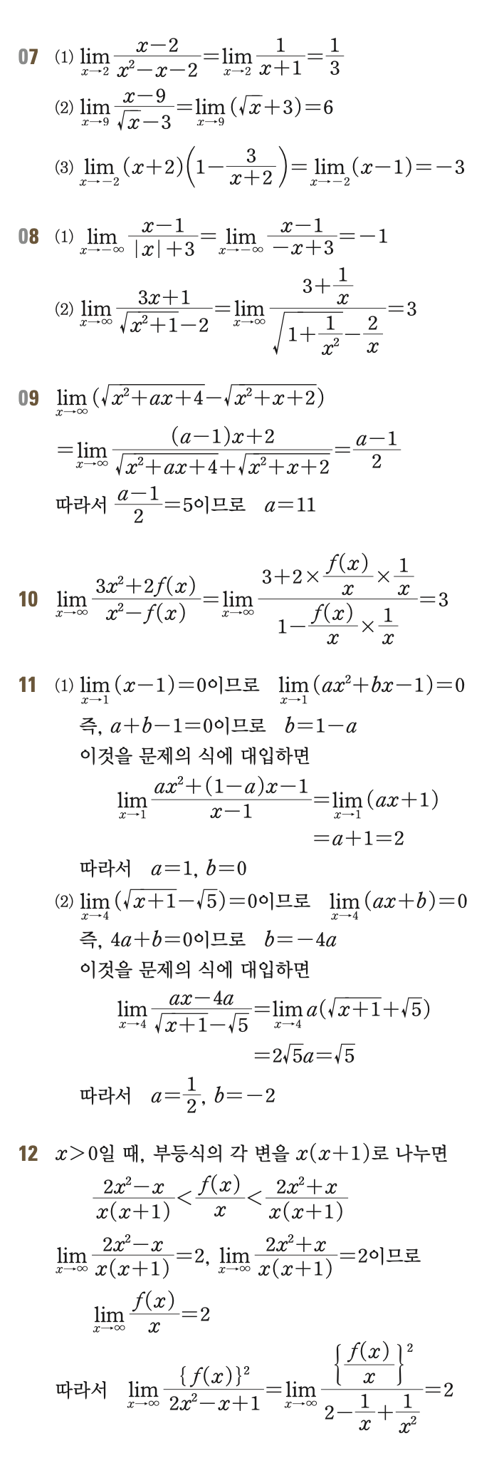 수열의 수렴과 발산, 등비수열의 극한을 다루는 기초 단계입니다. 극한의 성질을 이용하여 부정형($\frac{\infty}{\infty}$, $\infty - \infty$ 등)의 극한값을 구하는 과정에서 해설지가 어떤 논리적 단계를 거치는지 확인하세요.