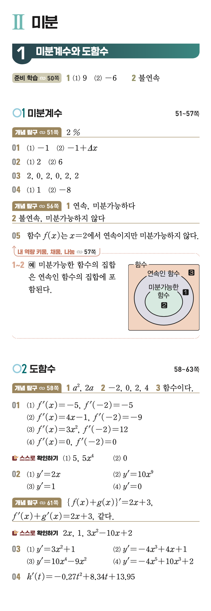 지수함수, 로그함수, 삼각함수의 미분과 함께 합성함수의 미분, 역함수의 미분법 등 다양한 미분 기술을 익힙니다. 복잡한 도함수 계산 시 부호 실수나 상수 누락이 잦으므로 해설지의 계산 과정을 꼼꼼히 대조해야 합니다.