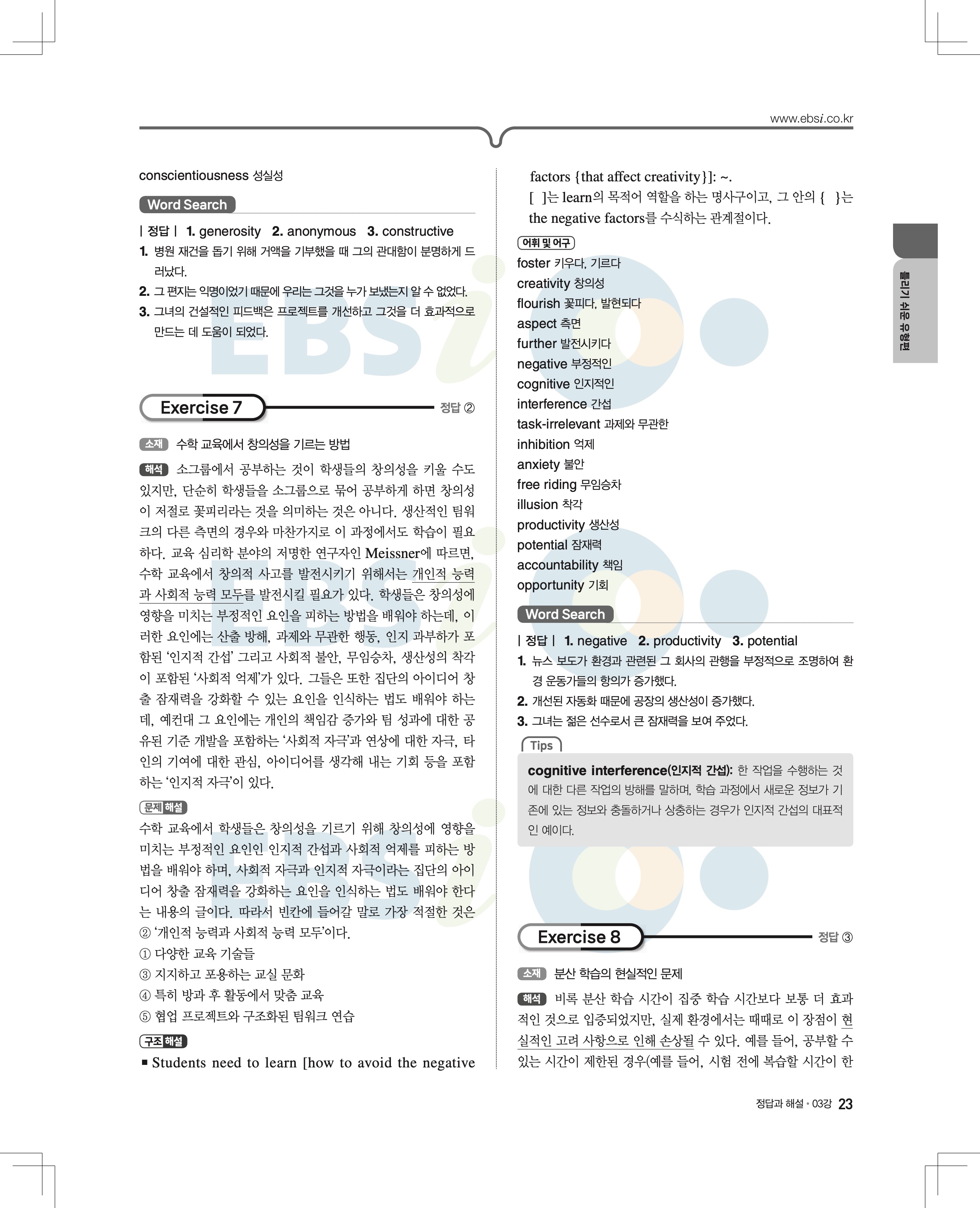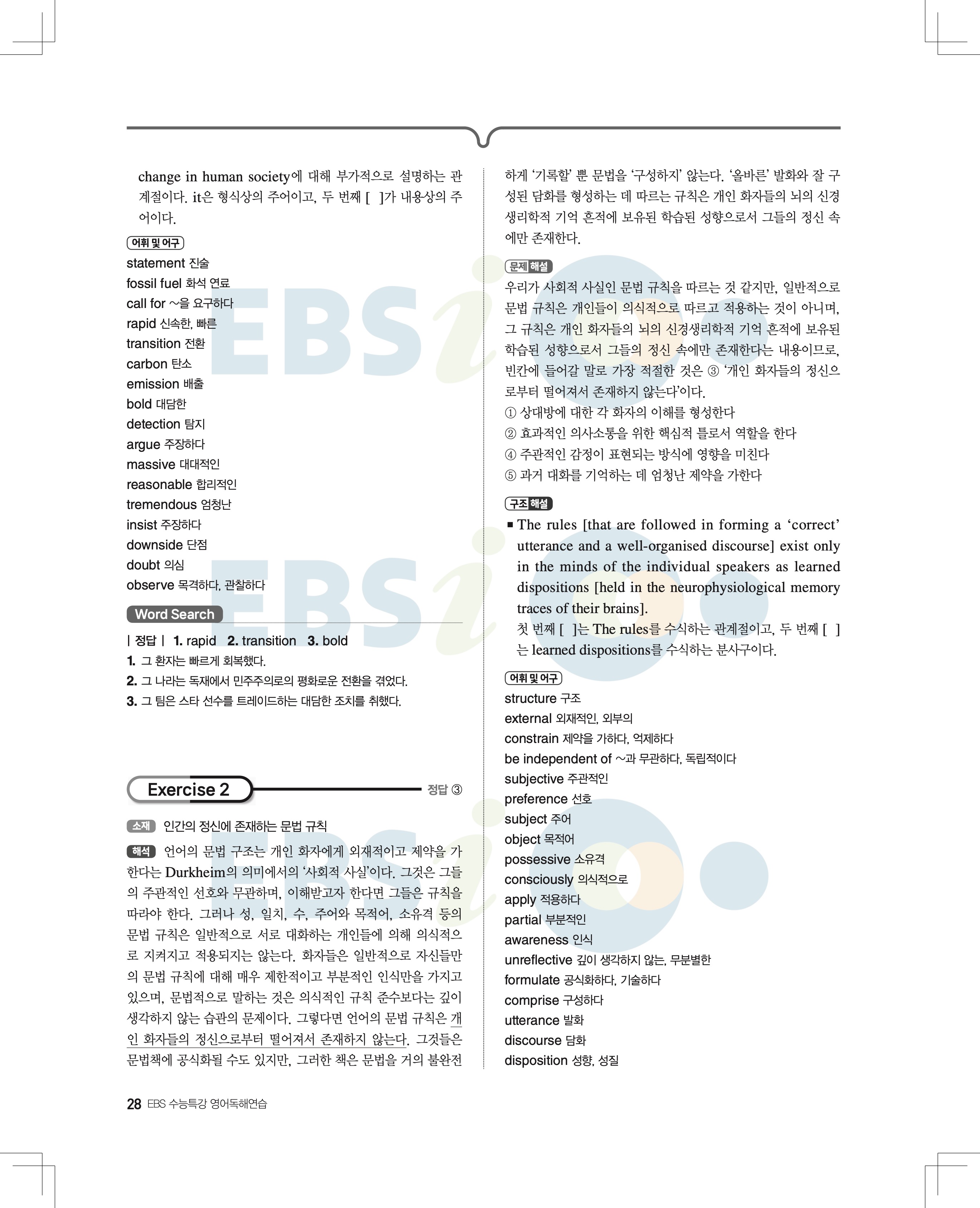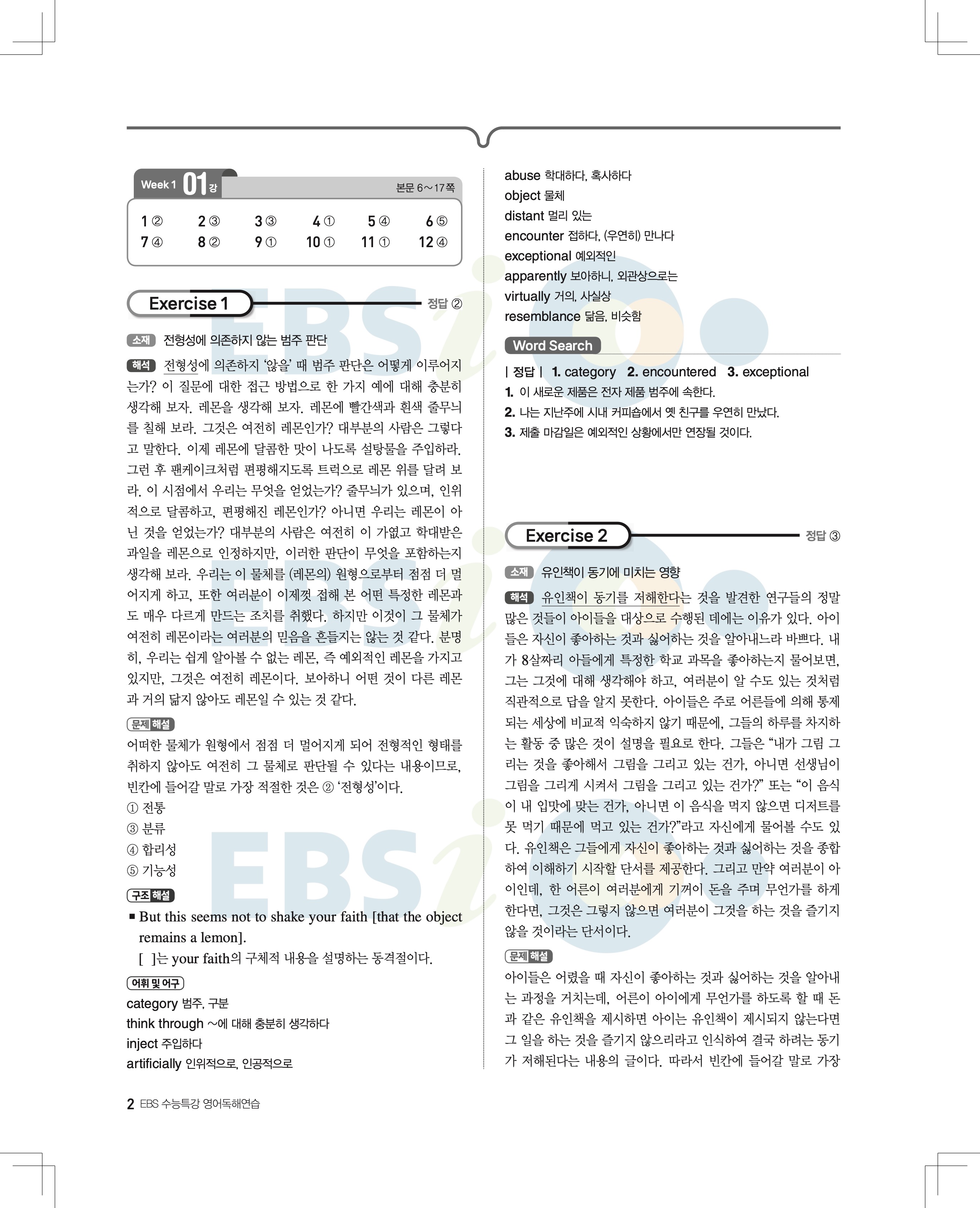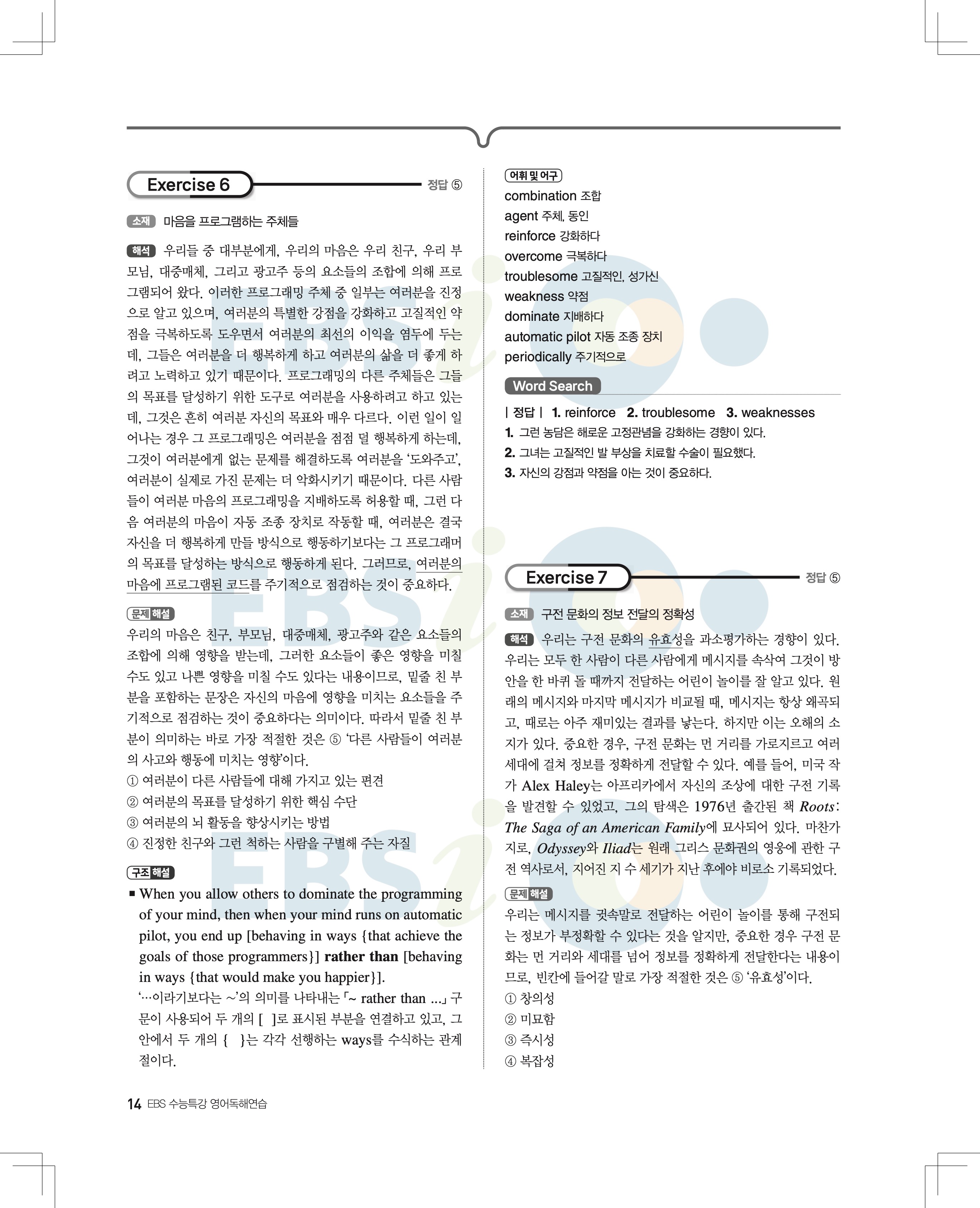 수능특강 영어독해연습은 수능 영어의 다양한 독해 유형을 집중적으로 다룹니다. 주제 추론, 요지 파악, 제목 선택, 빈칸 추론, 순서 배열, 문장 삽입, 장문 독해 등 수능 핵심 유형별로 양질의 지문이 수록되어 있어 실전 대비에 필수적입니다.