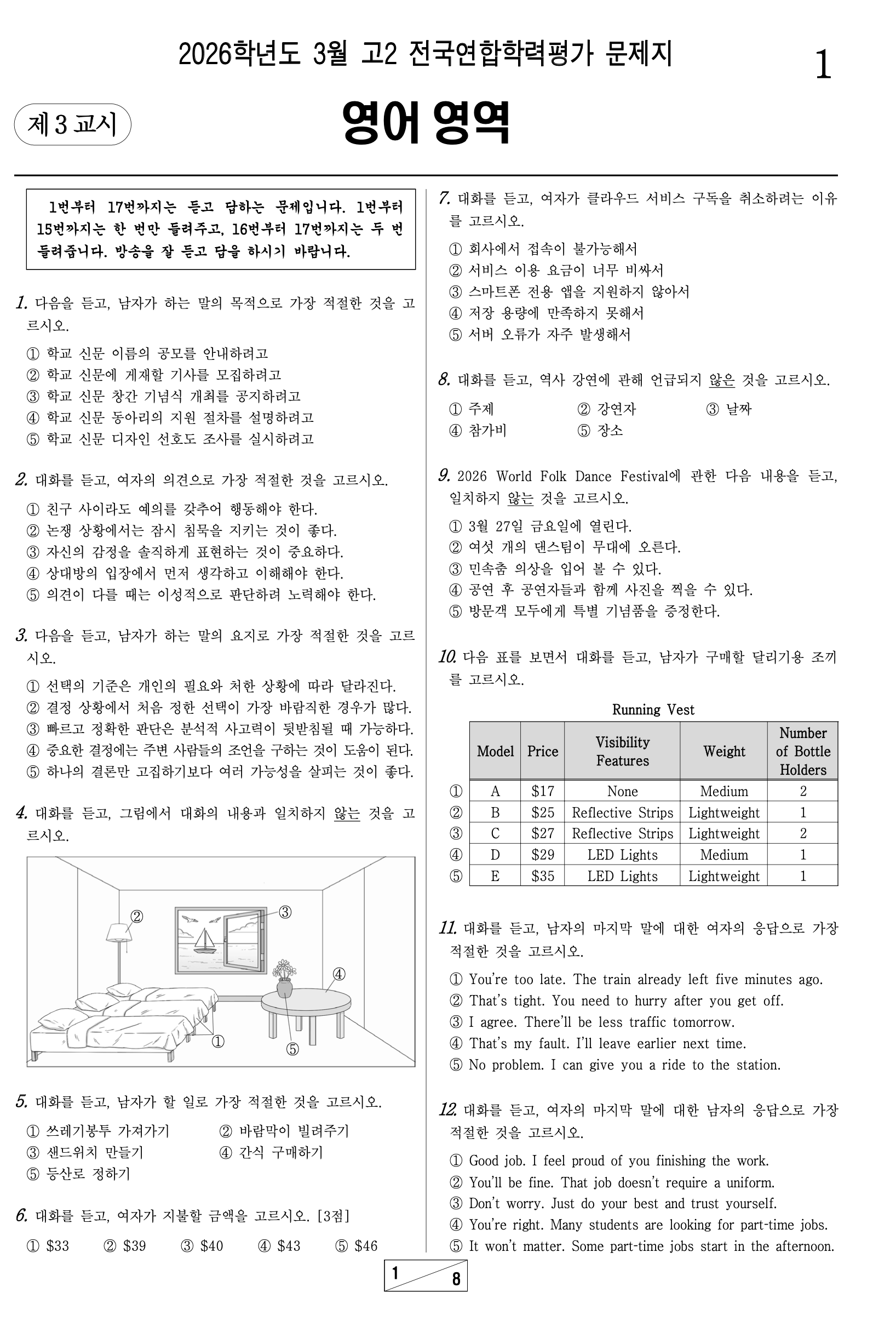 본 정답표는 서울특별시교육청 발표 자료를 기준으로 작성되었습니다. 영어영역은 절대평가로 원점수 기준 등급이 확정되며, 표준점수와 백분위는 별도 산출되지 않습니다. 보다 정확한 성적 분석은 성적통지표 수령 후 확인하시기 바랍니다.