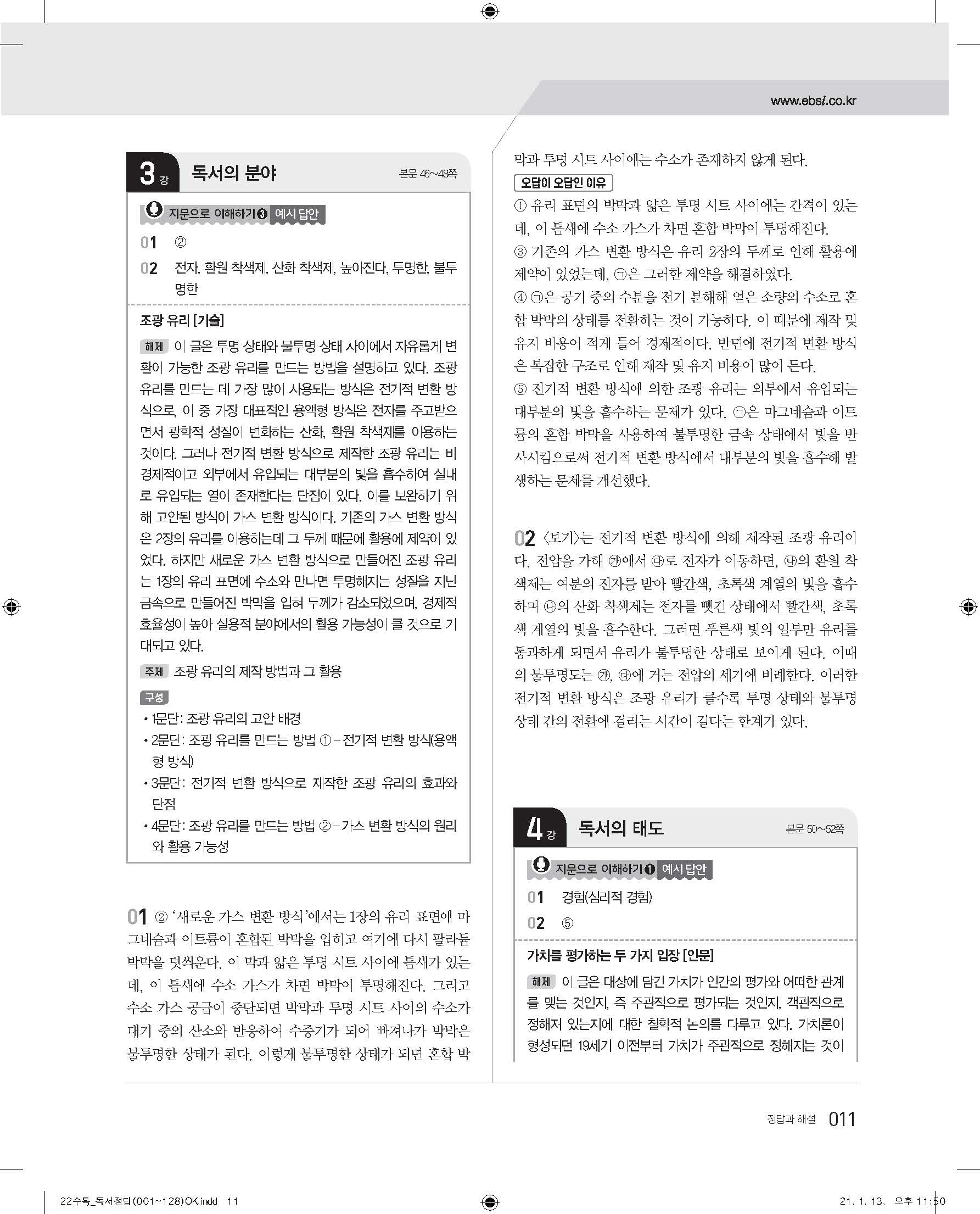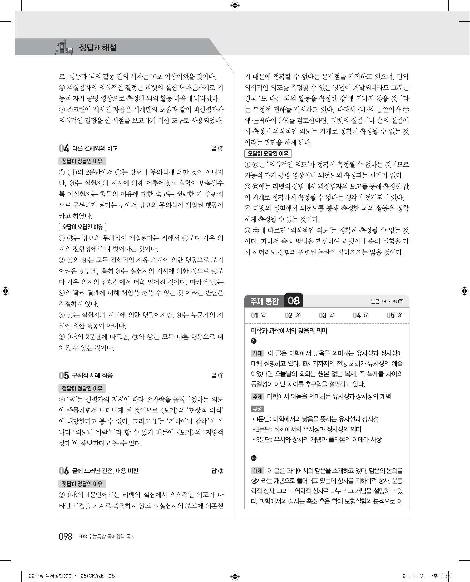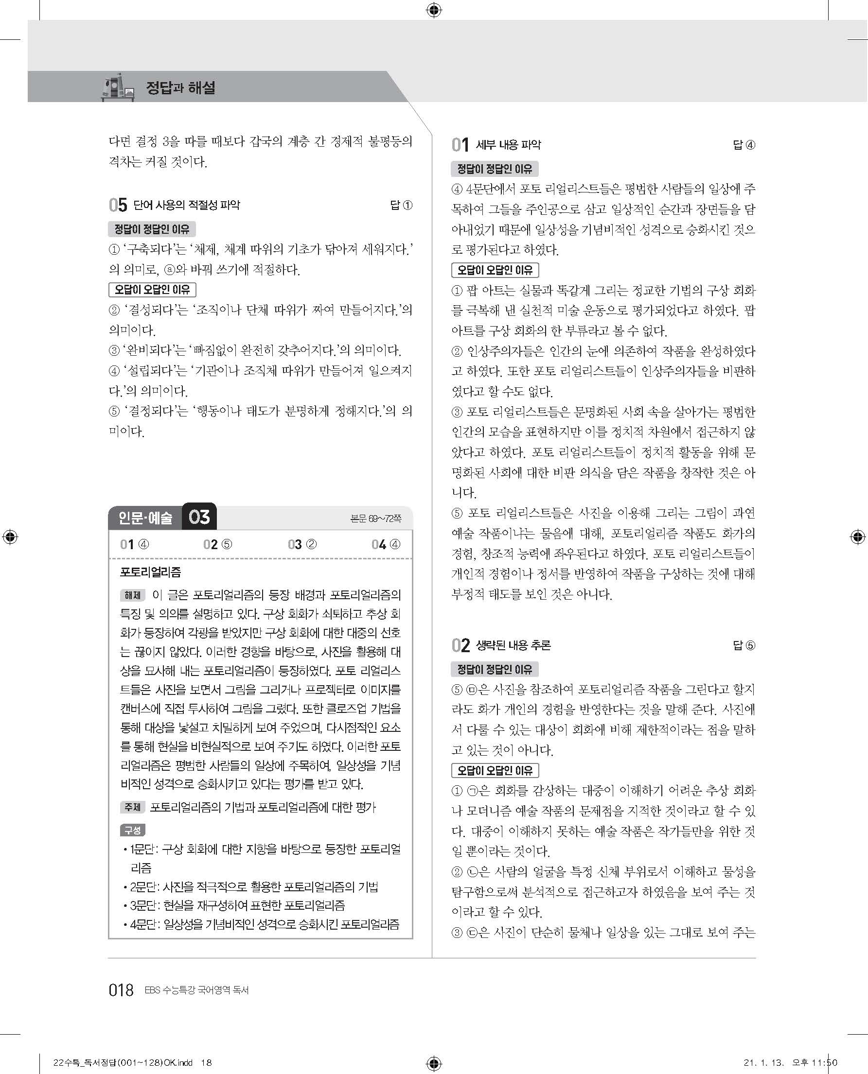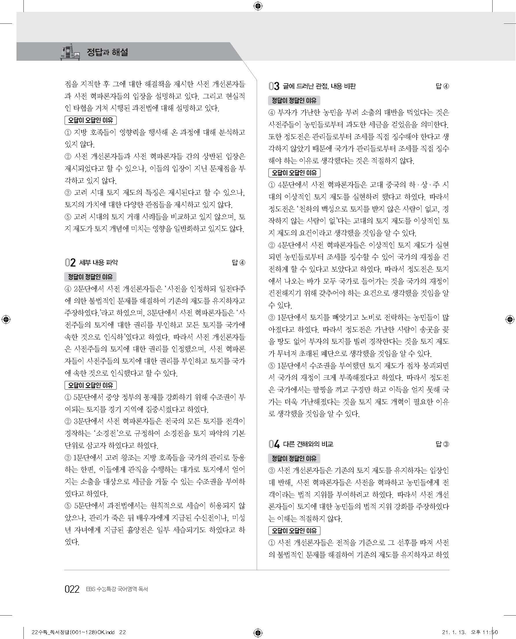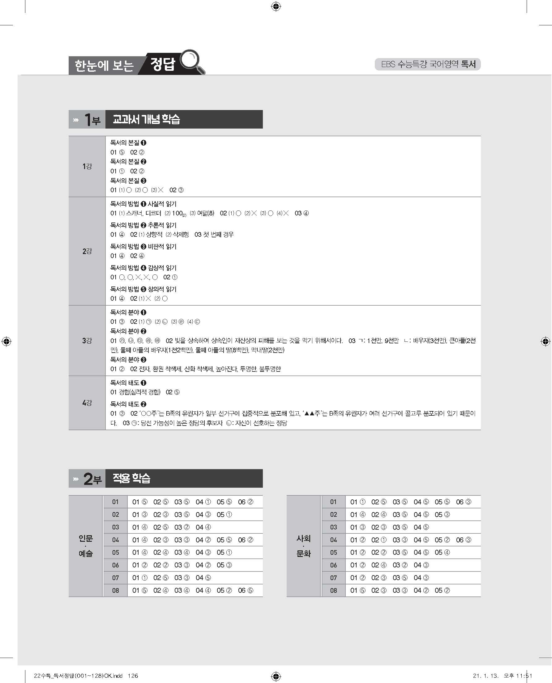 EBS 2022 수능특강 독서 사진답지 빠른답지 모바일최적화