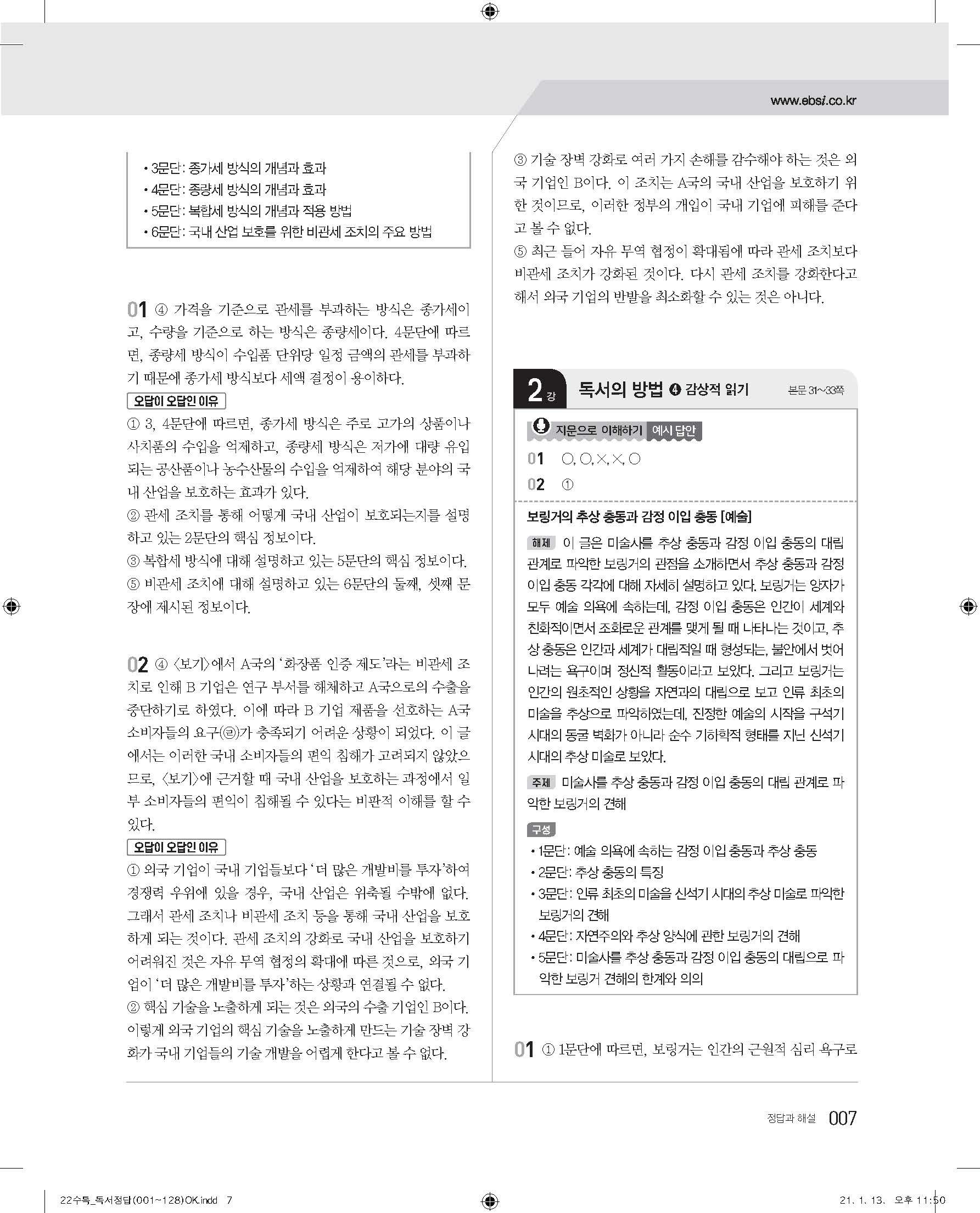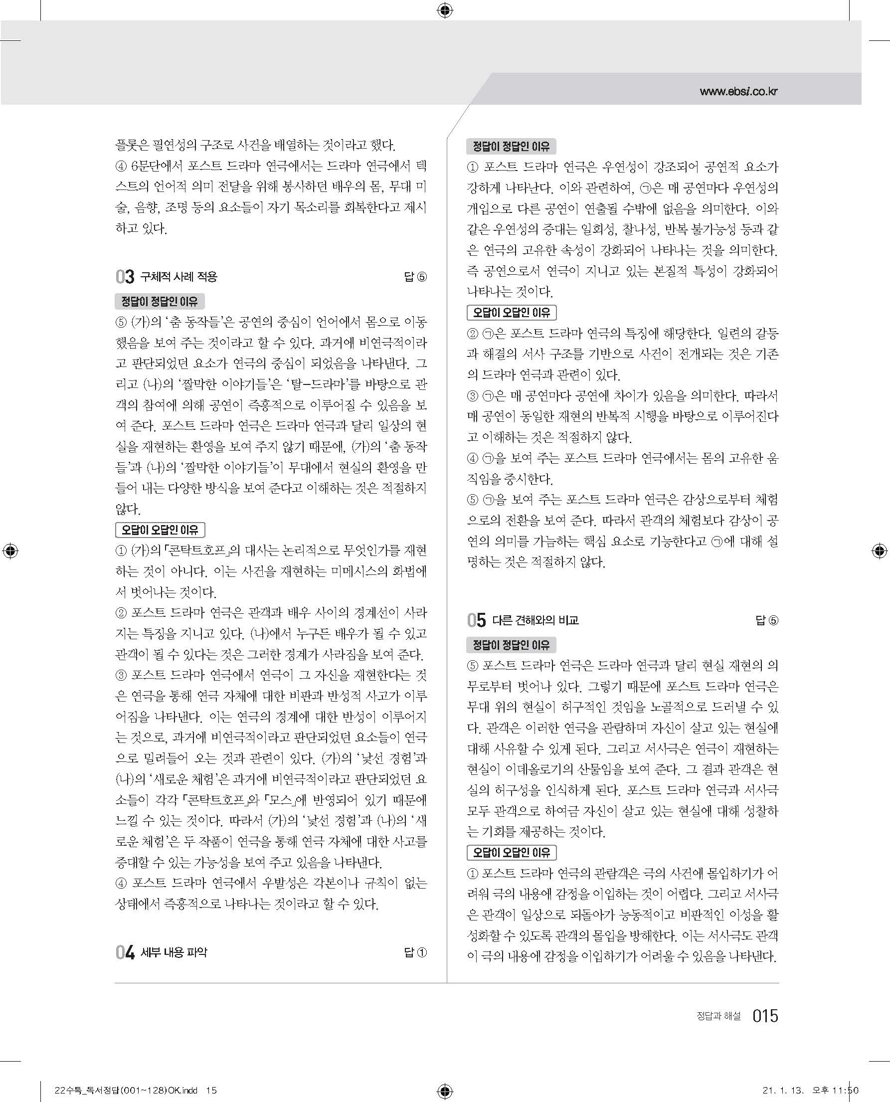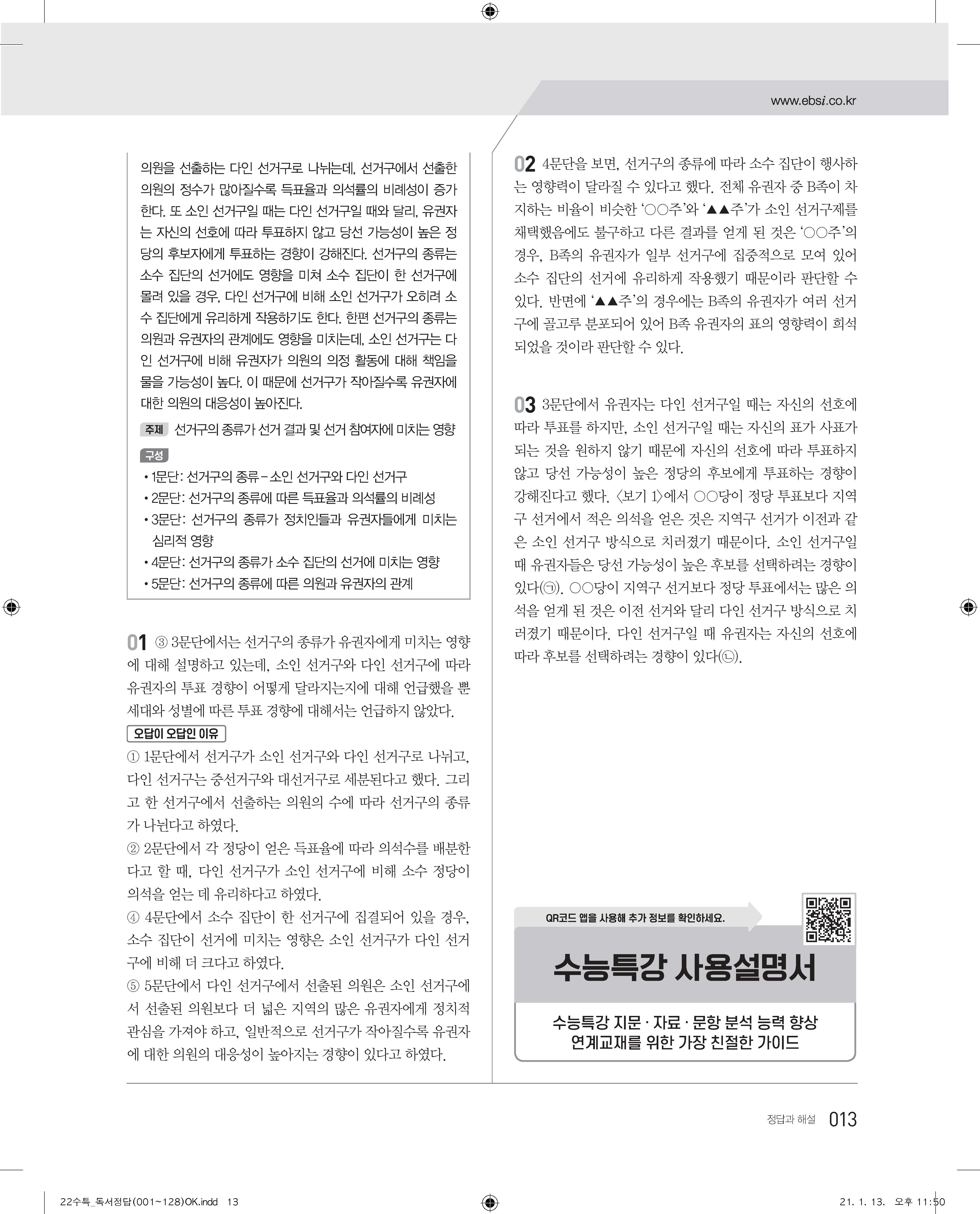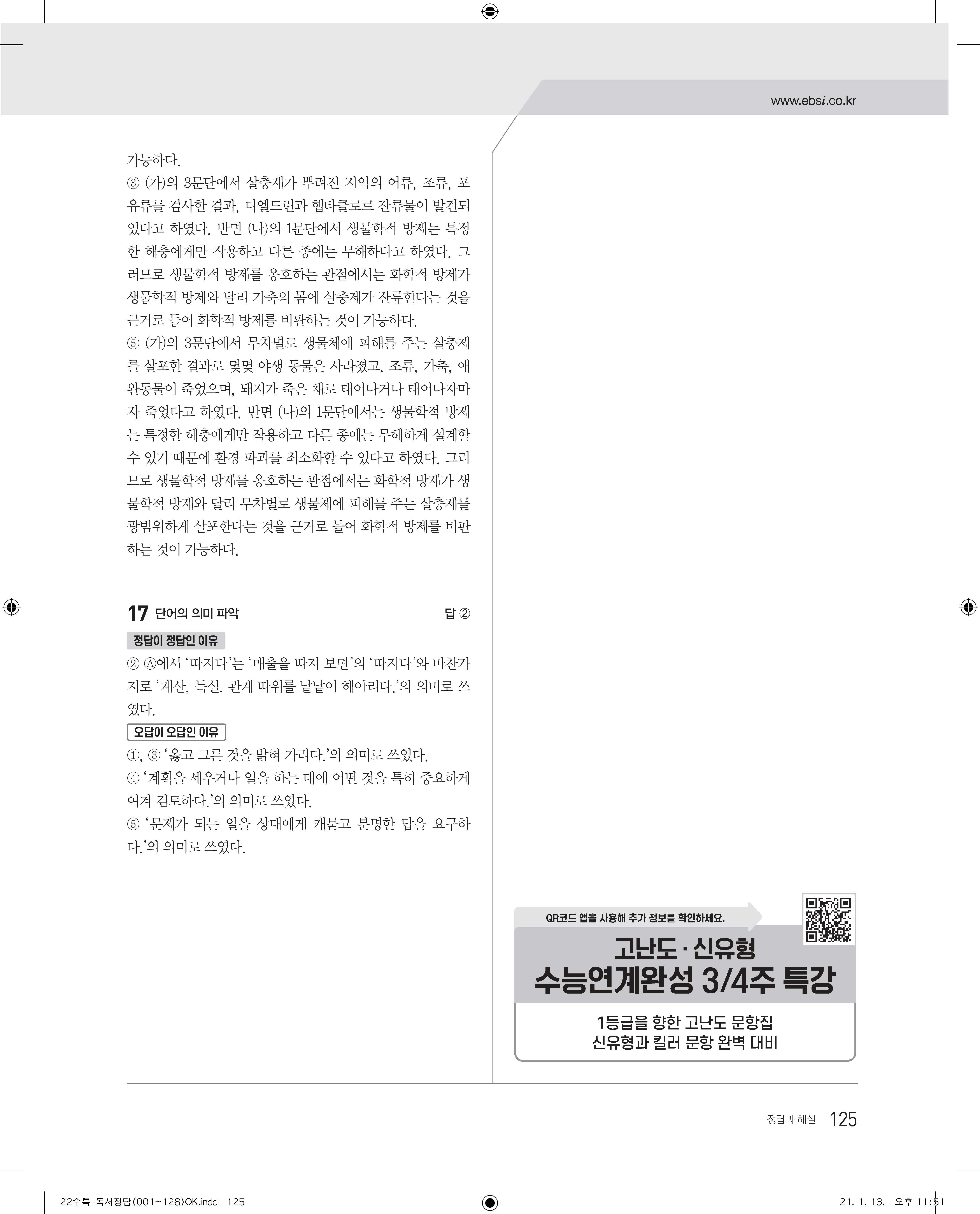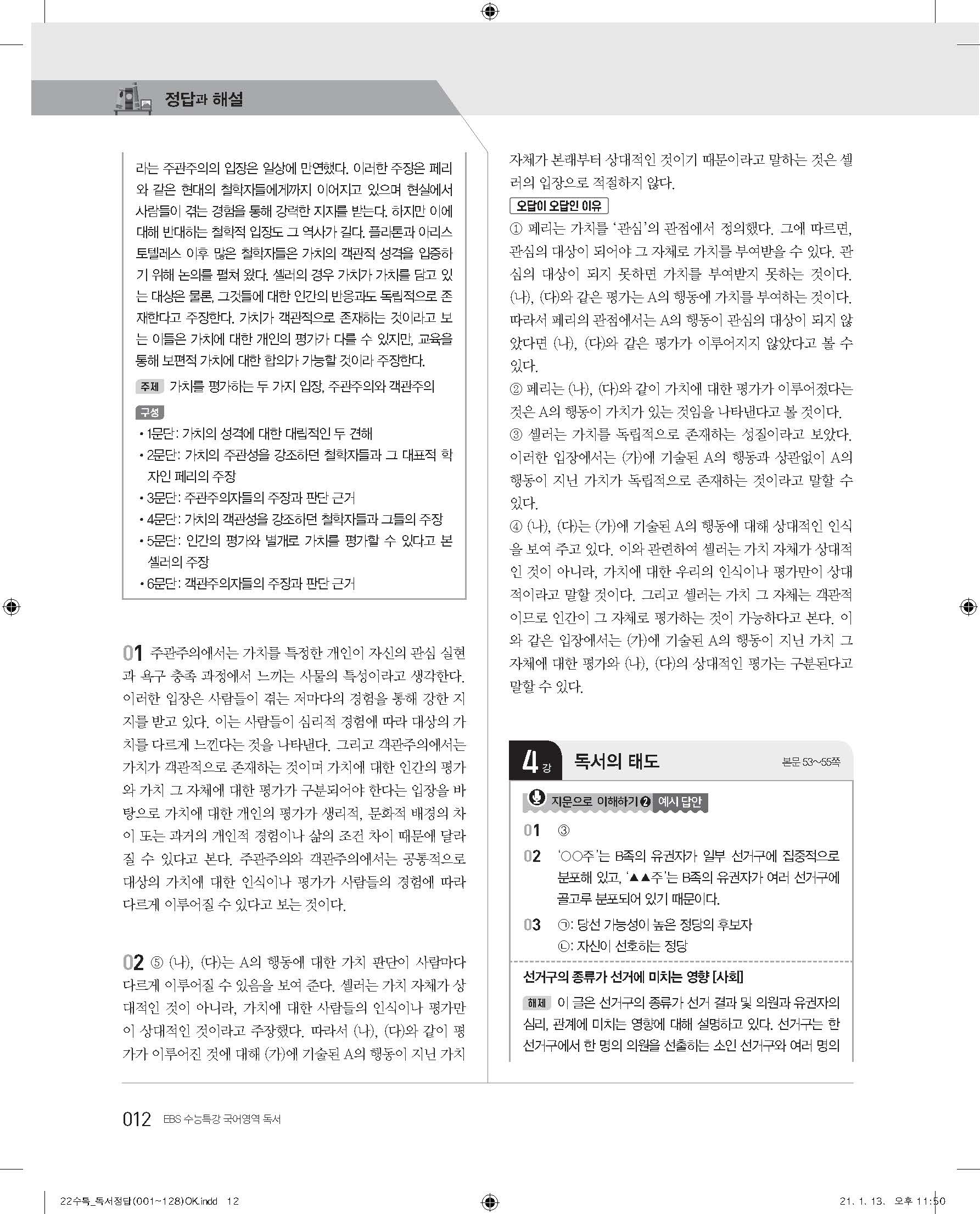 EBS 2022 수능특강 독서 사진답지 빠른답지 모바일최적화