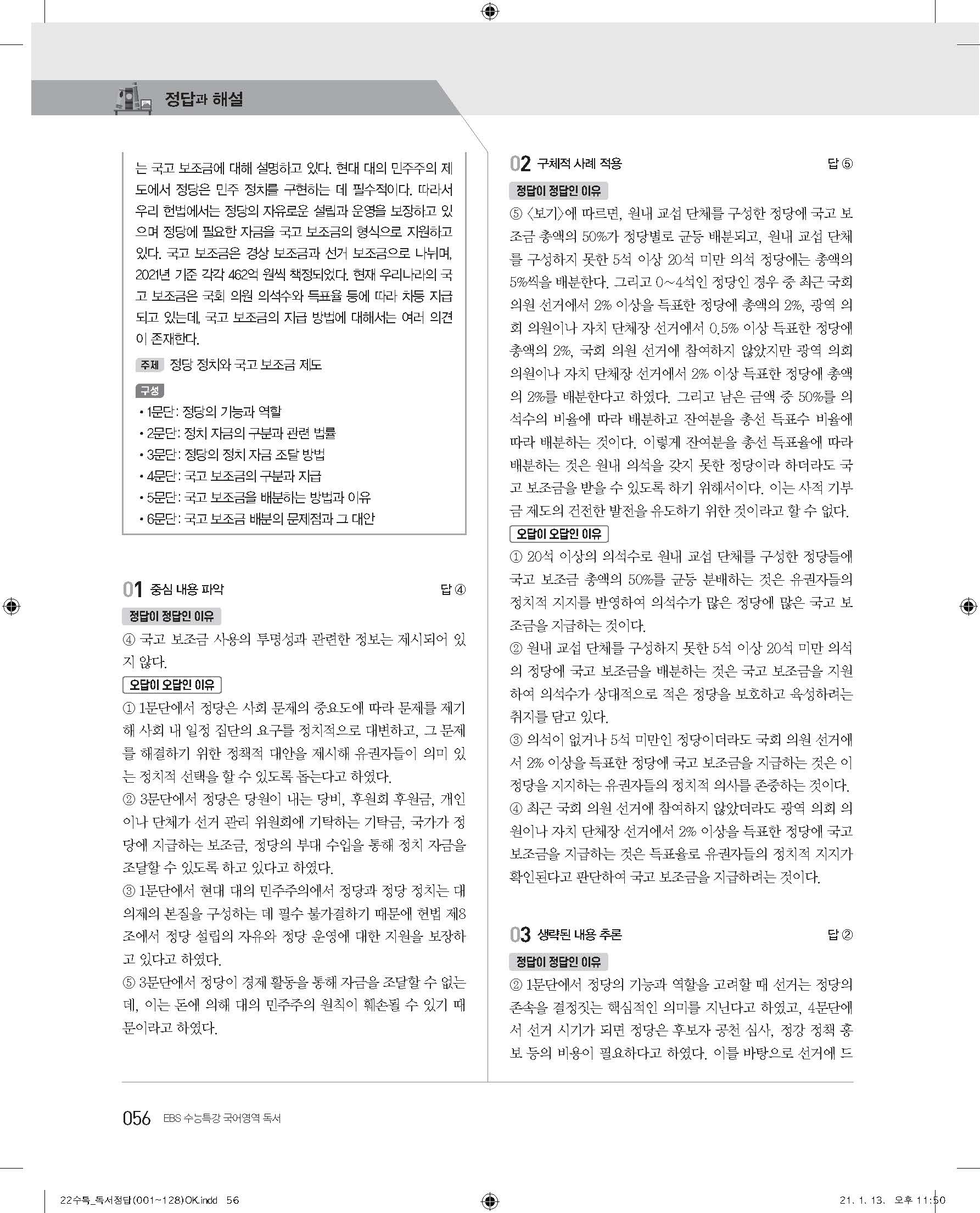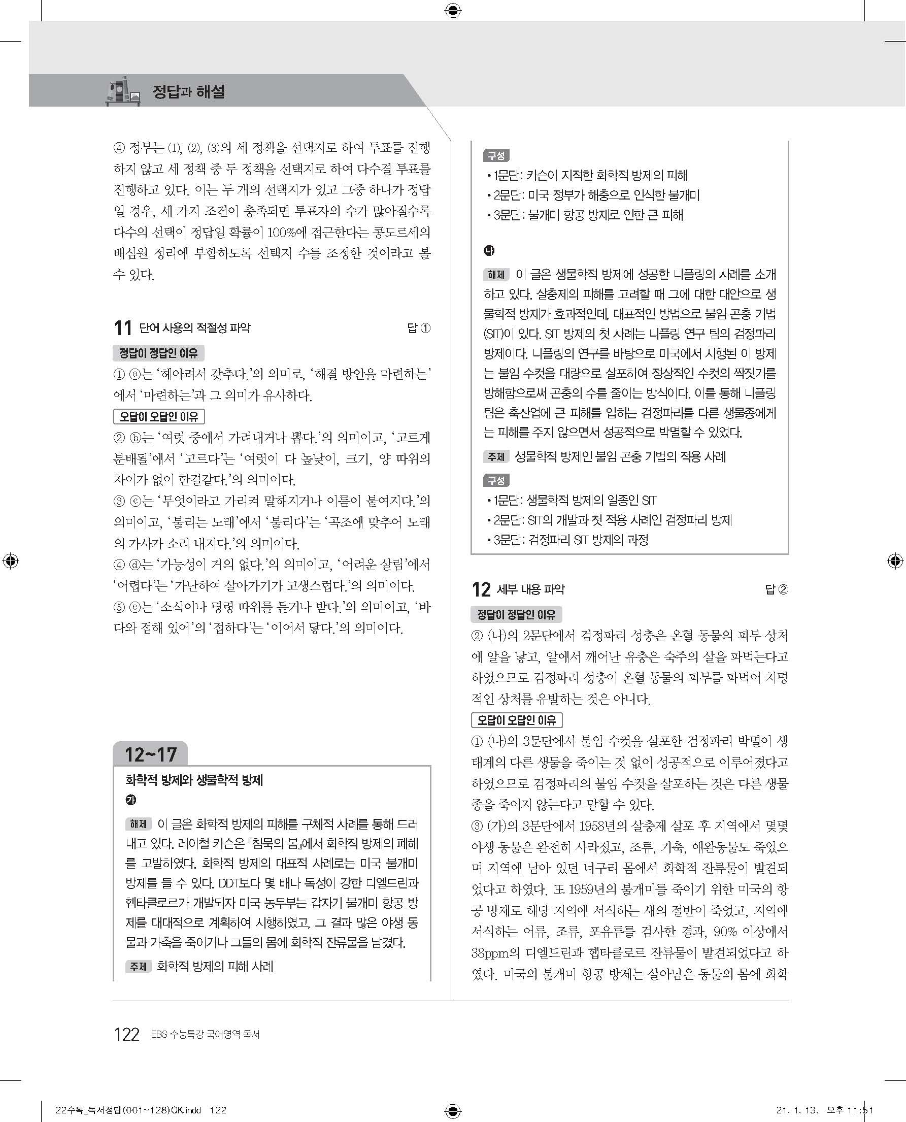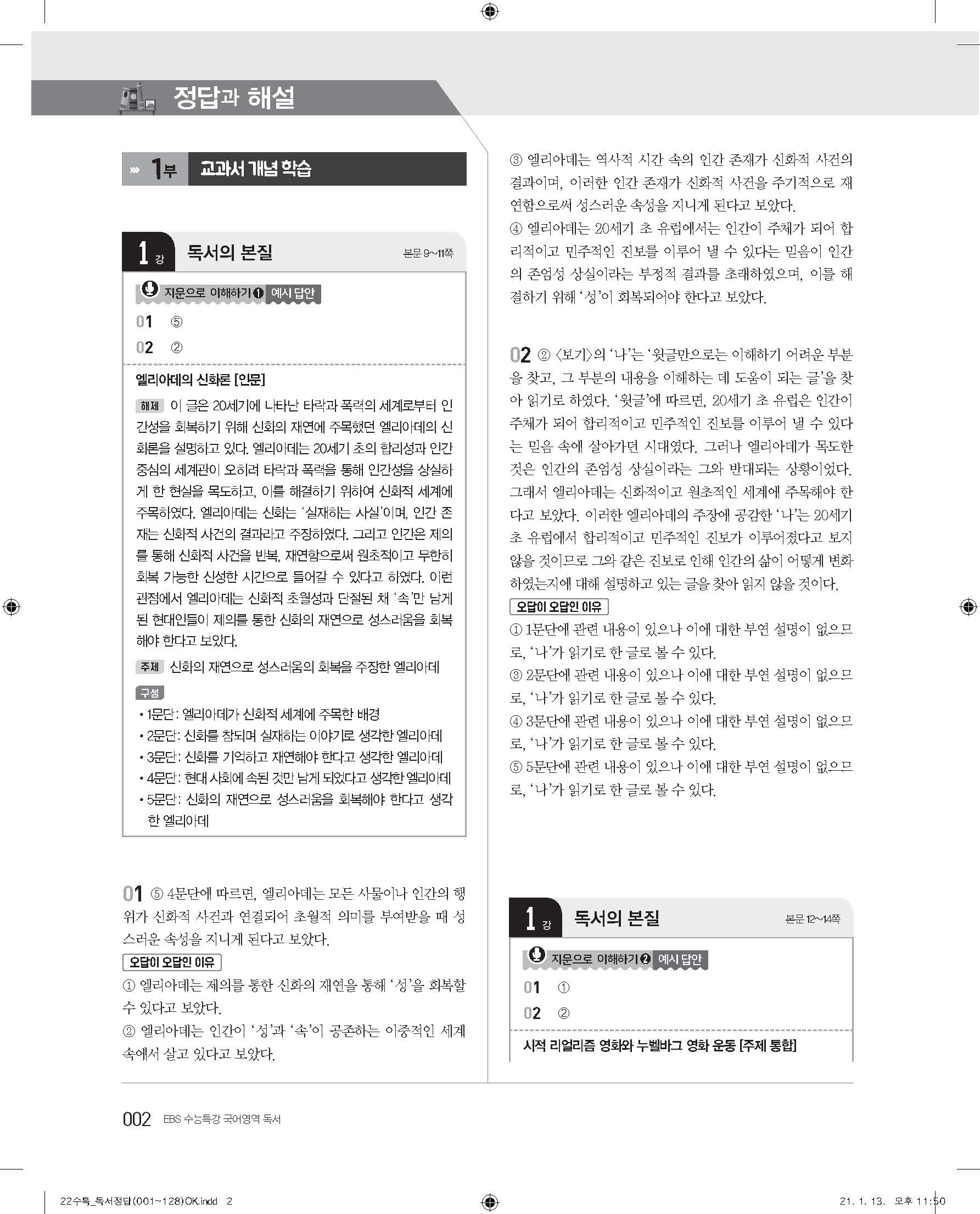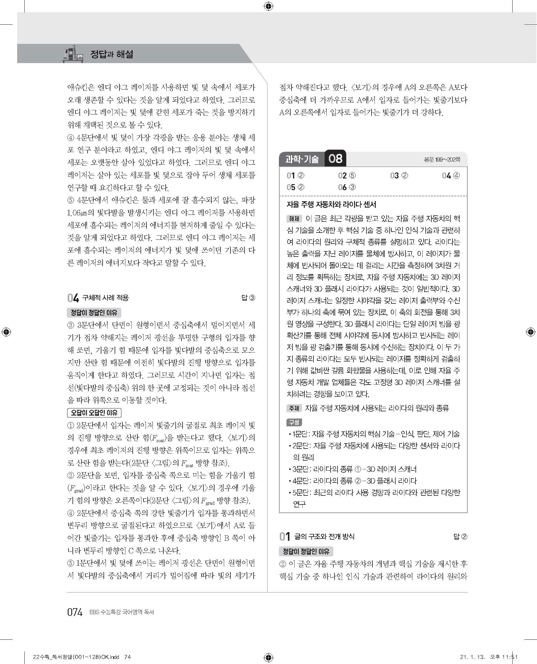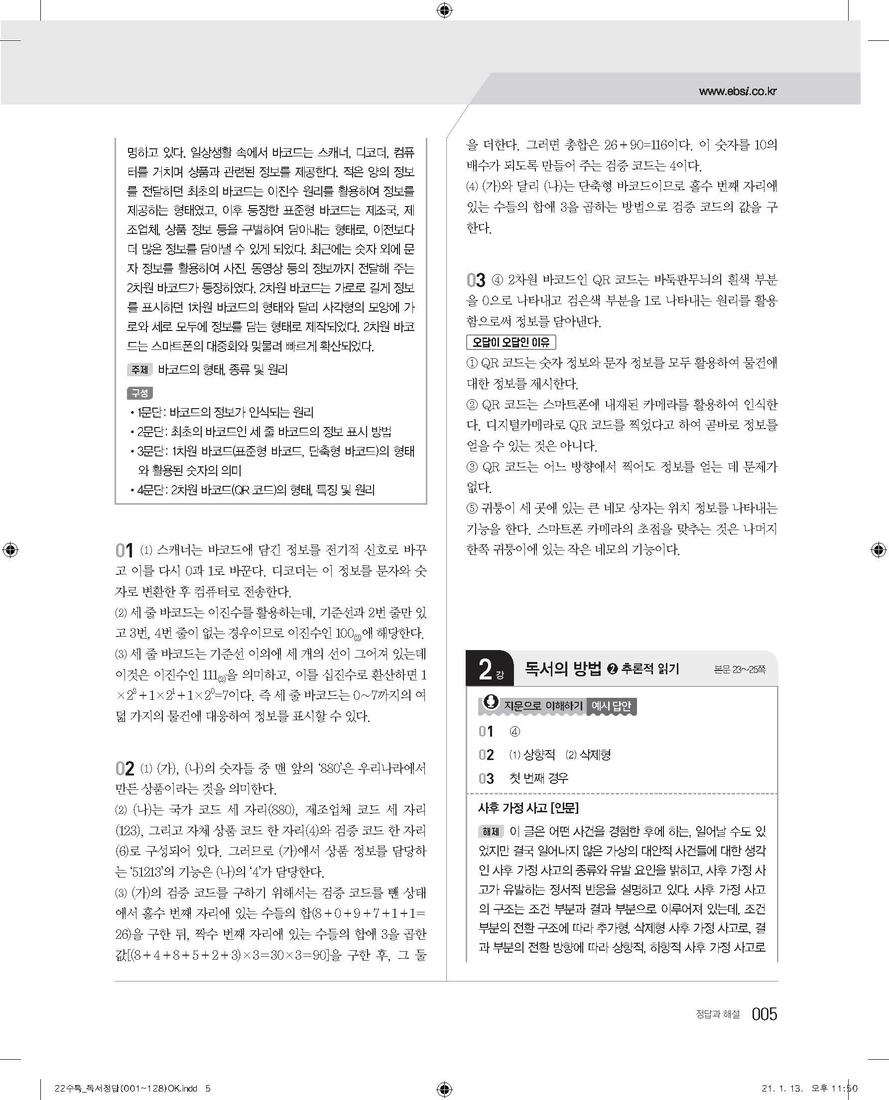EBS 2022 수능특강 독서 사진답지 빠른답지 모바일최적화