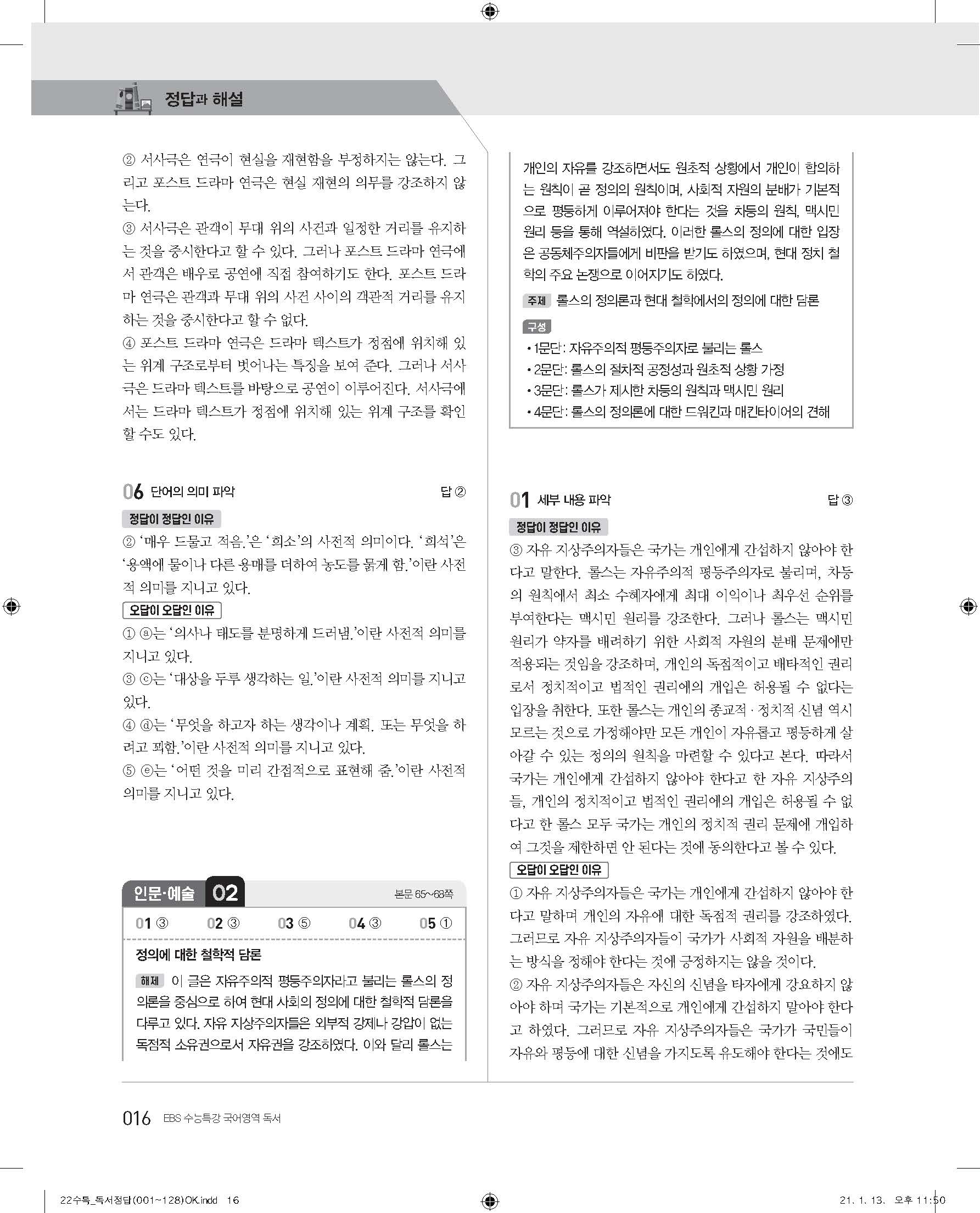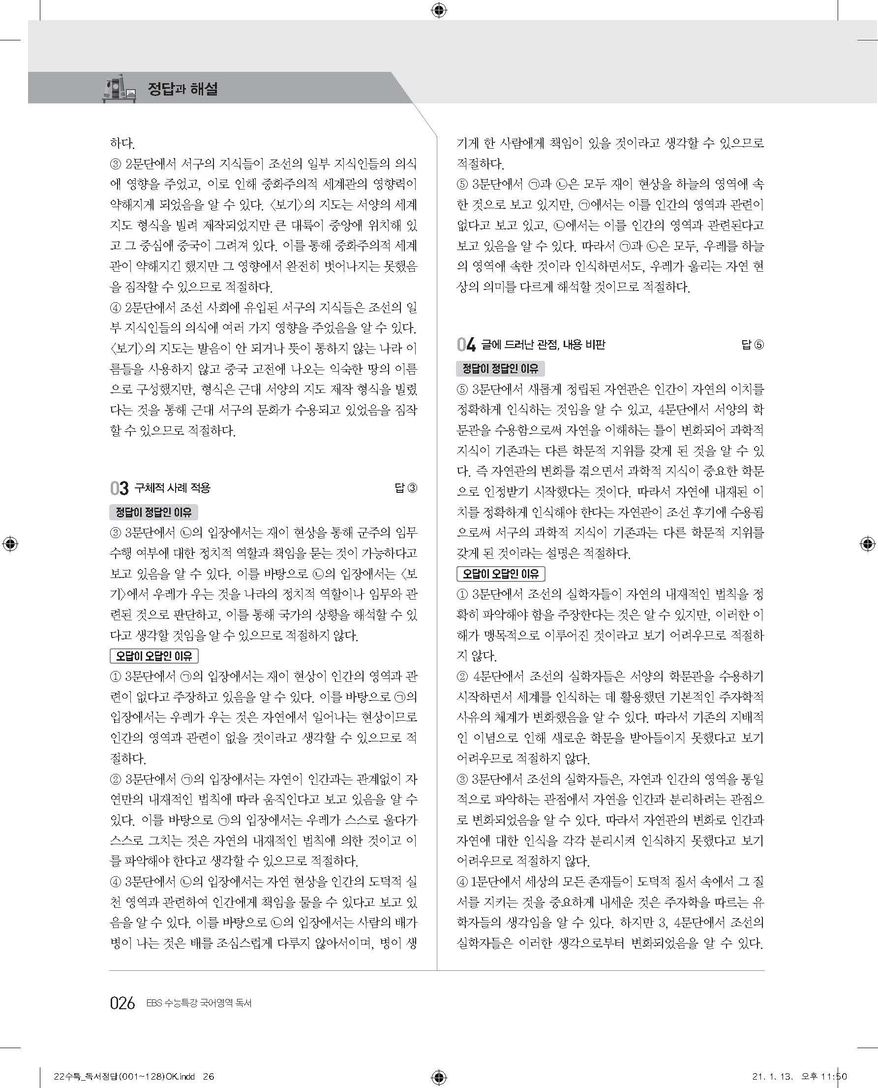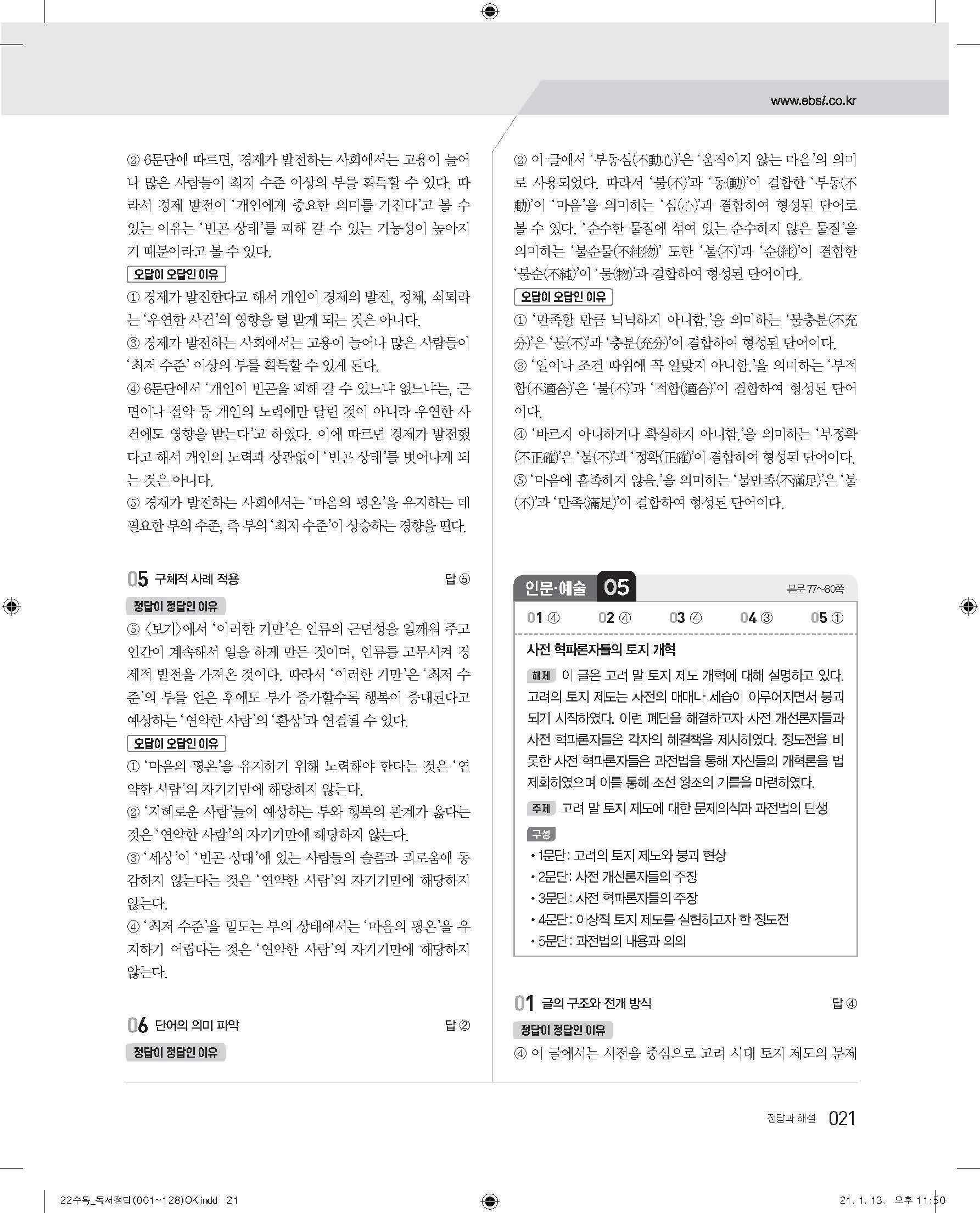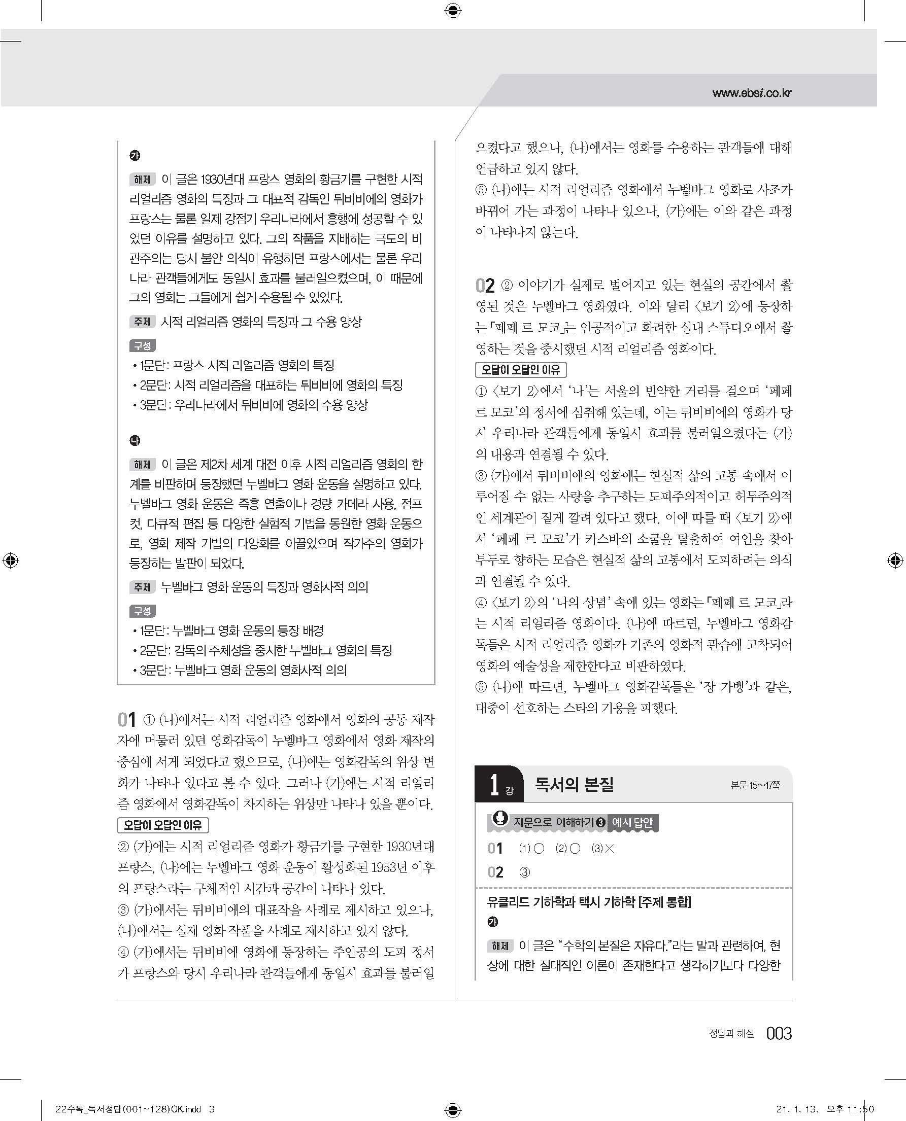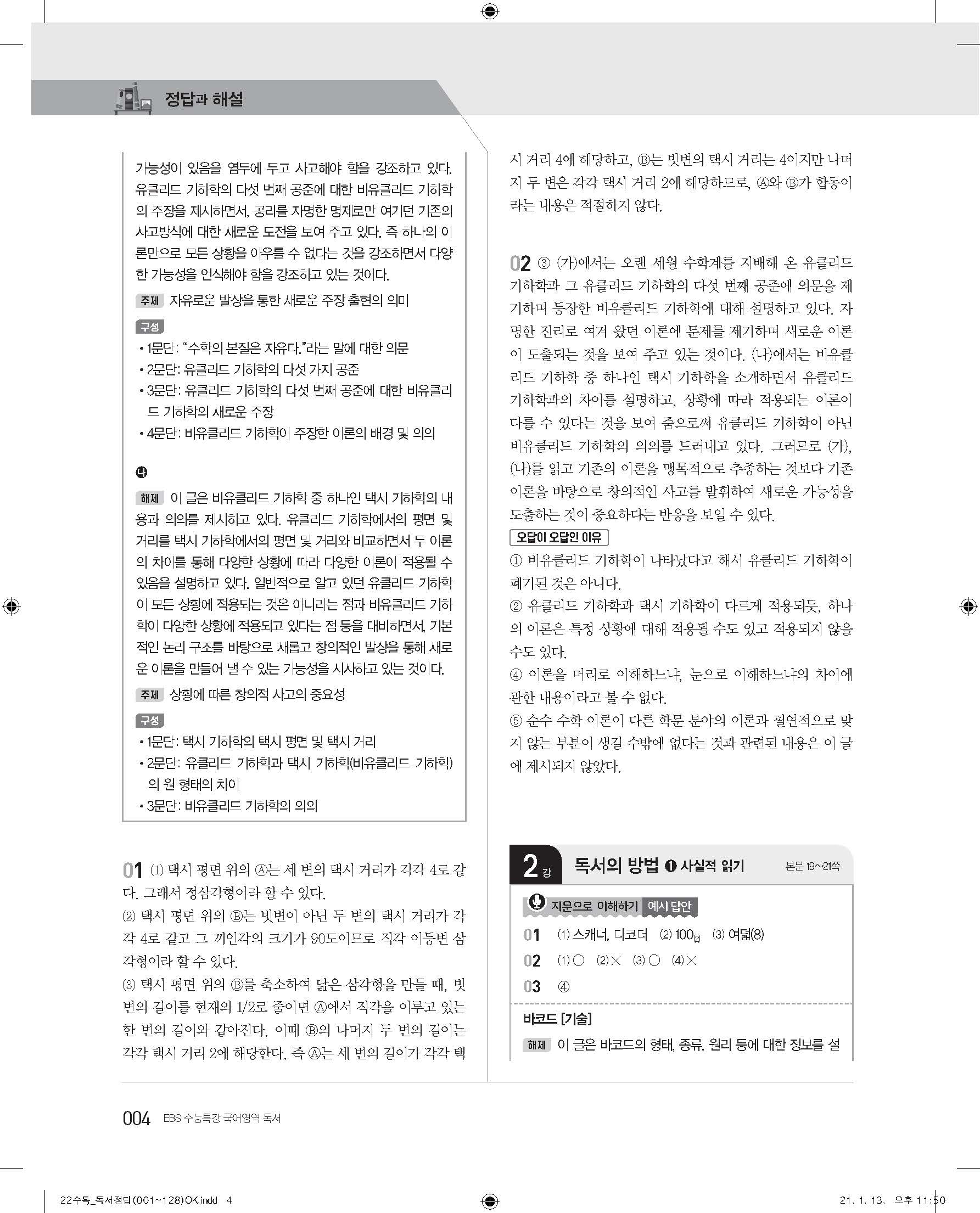 EBS 2022 수능특강 독서 사진답지 빠른답지 모바일최적화