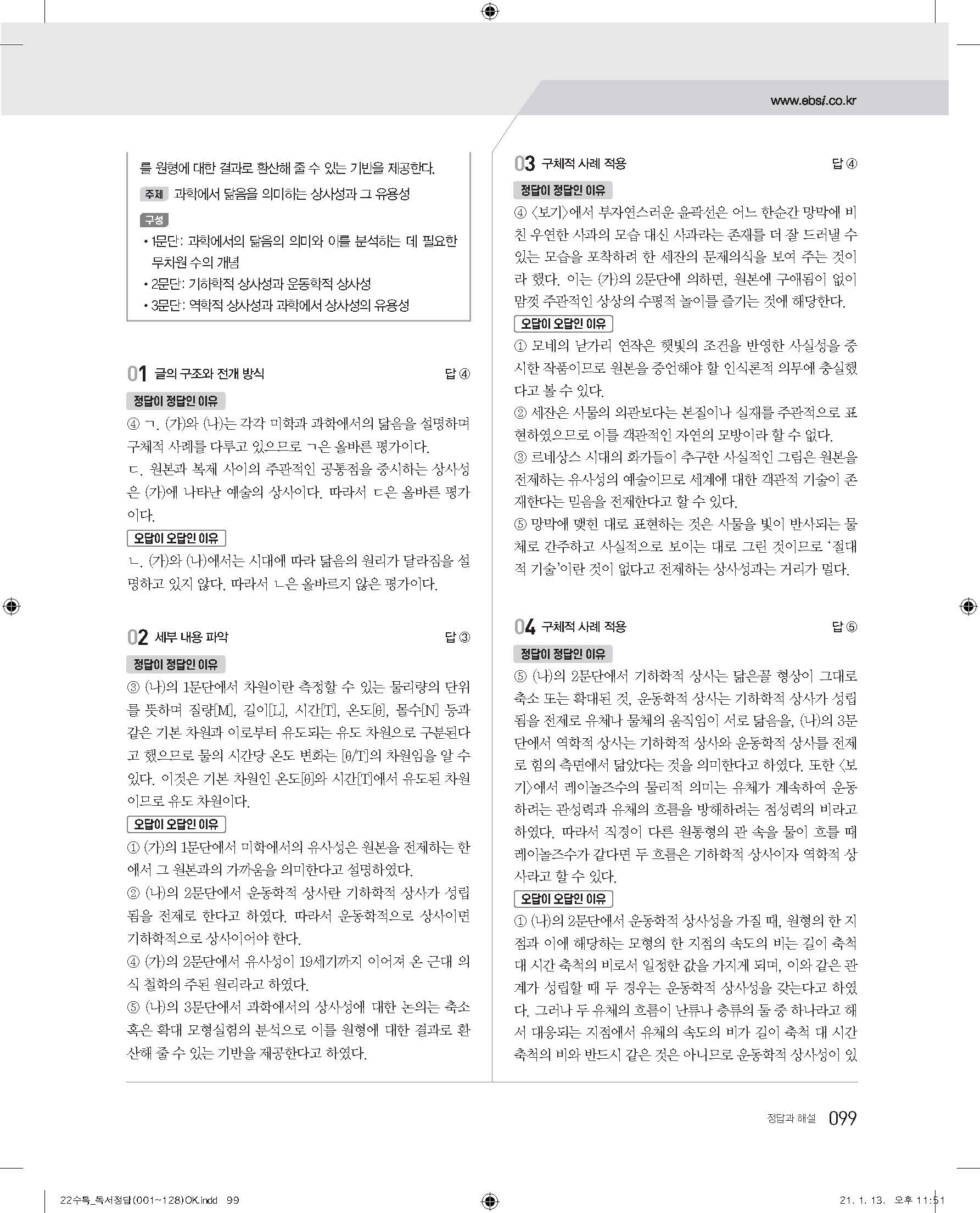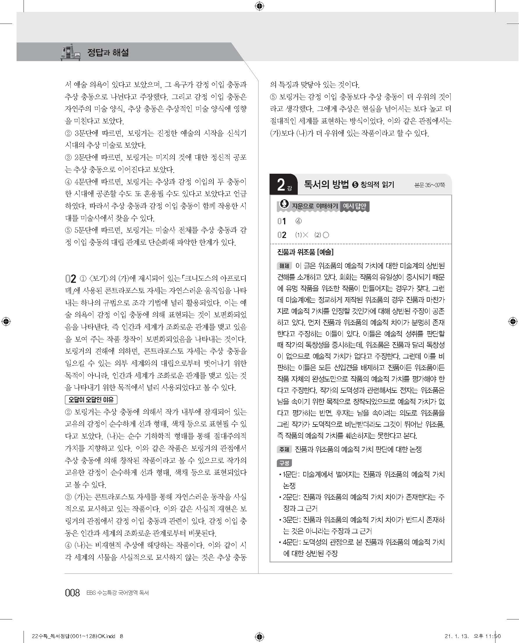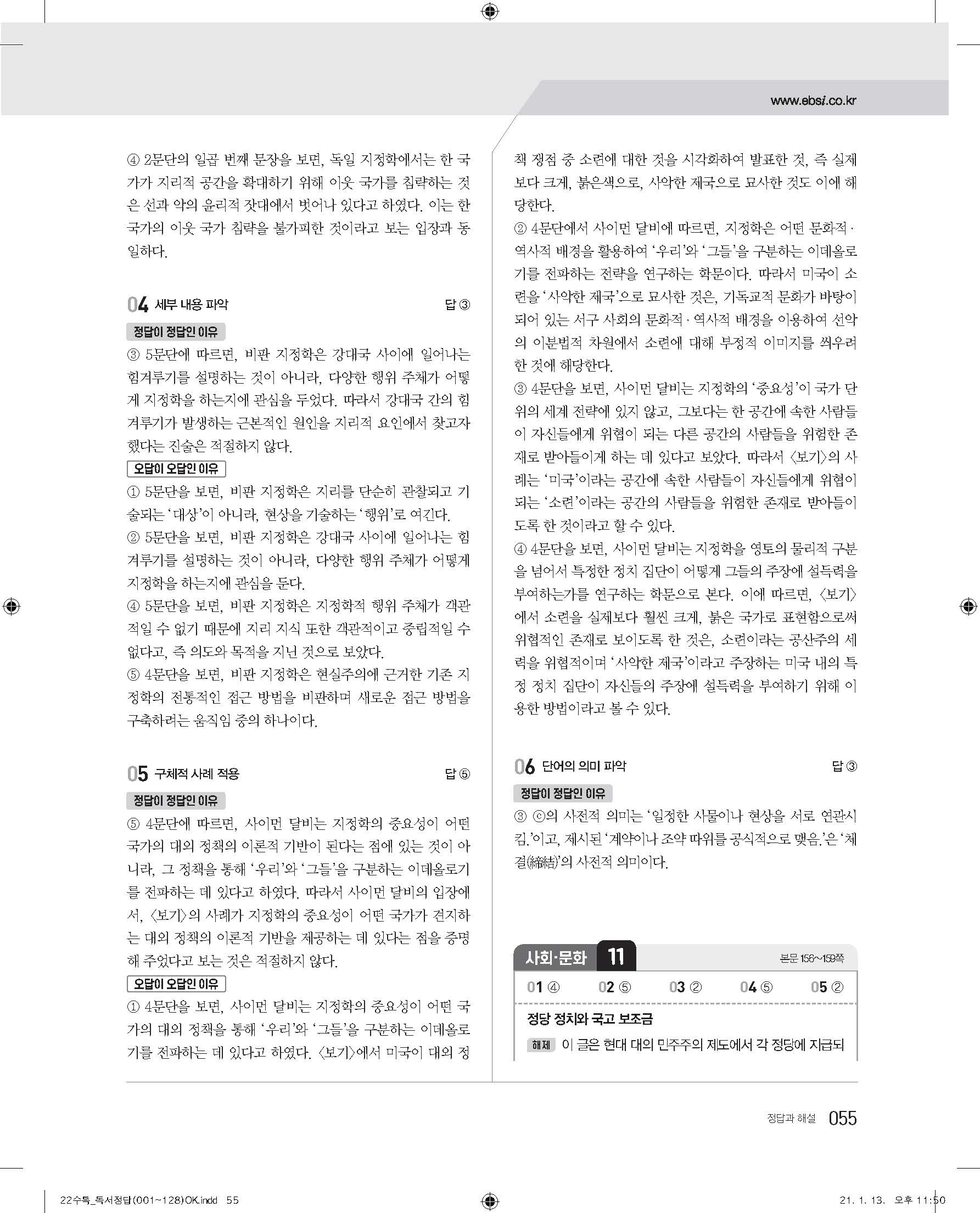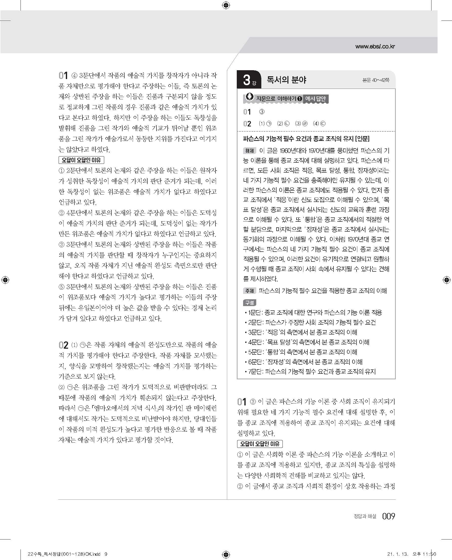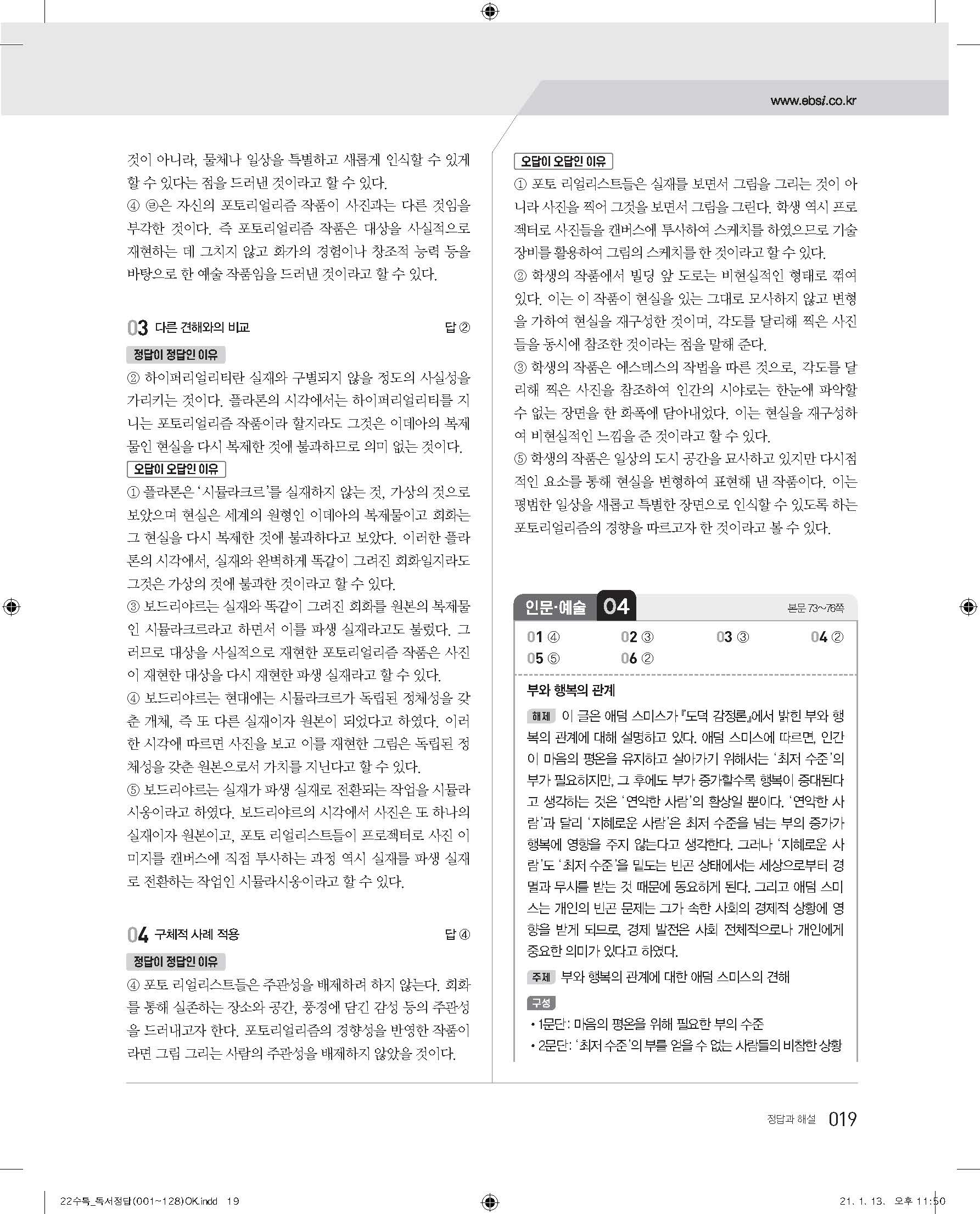 EBS 2022 수능특강 독서 사진답지 빠른답지 모바일최적화