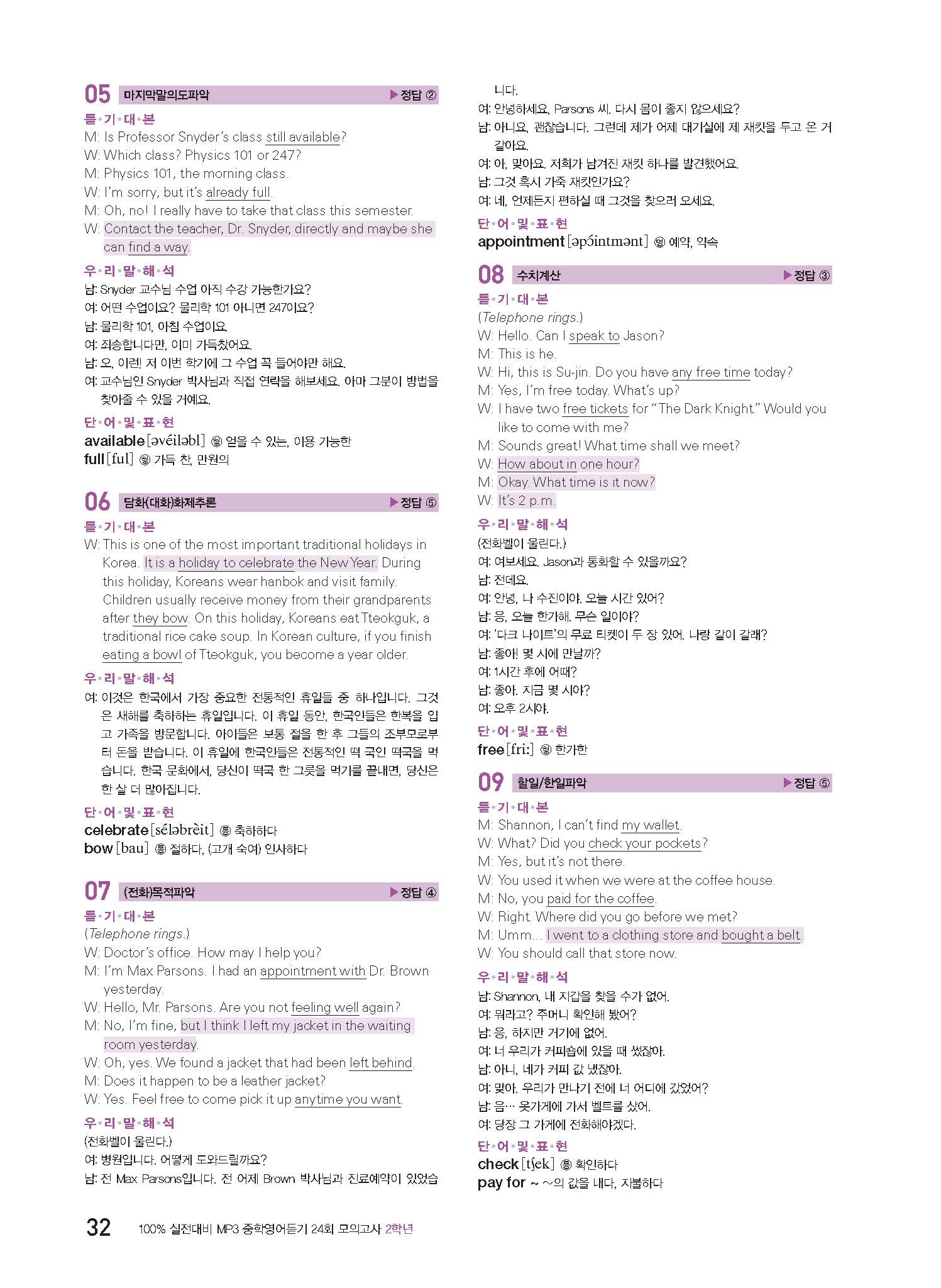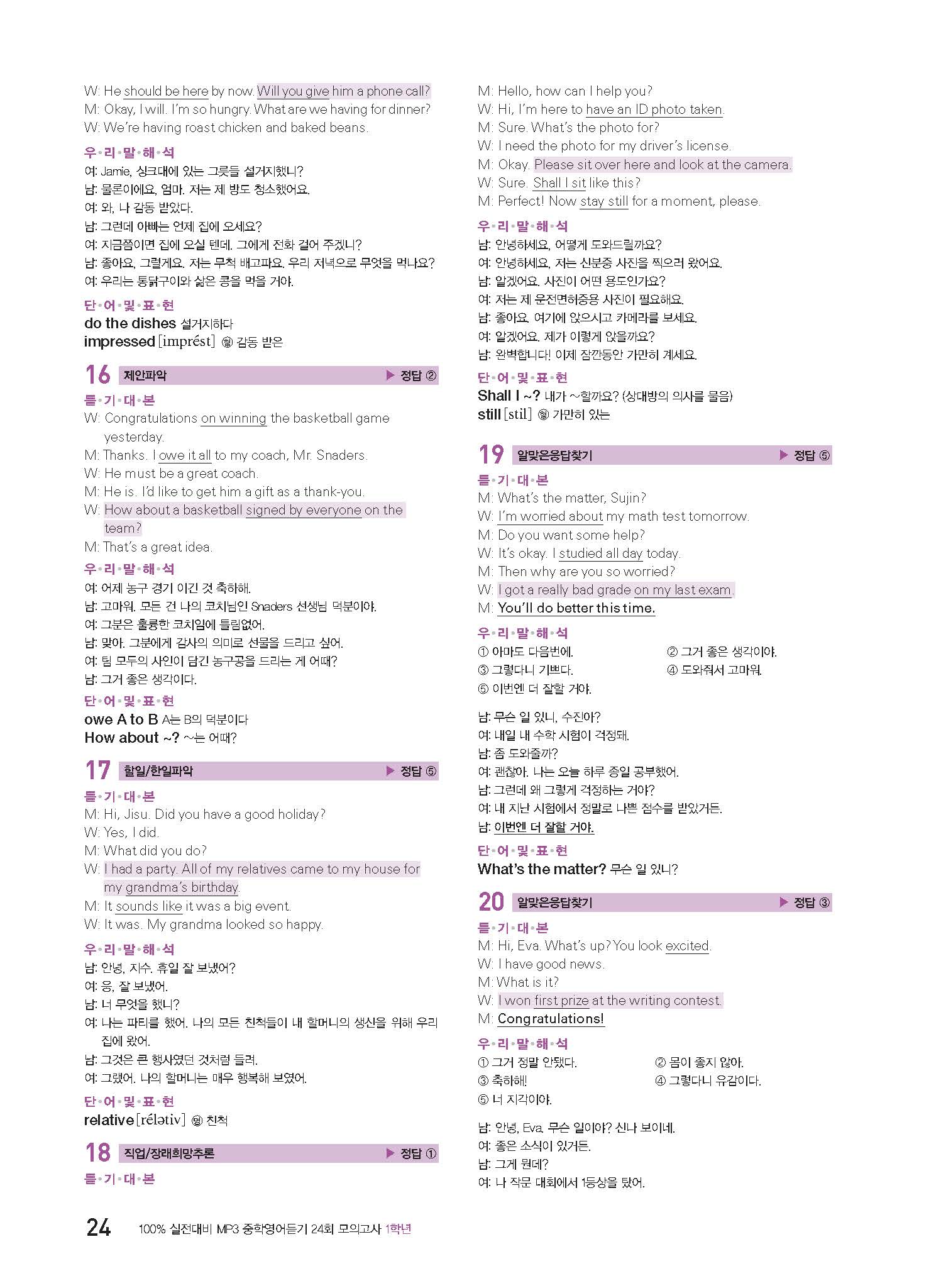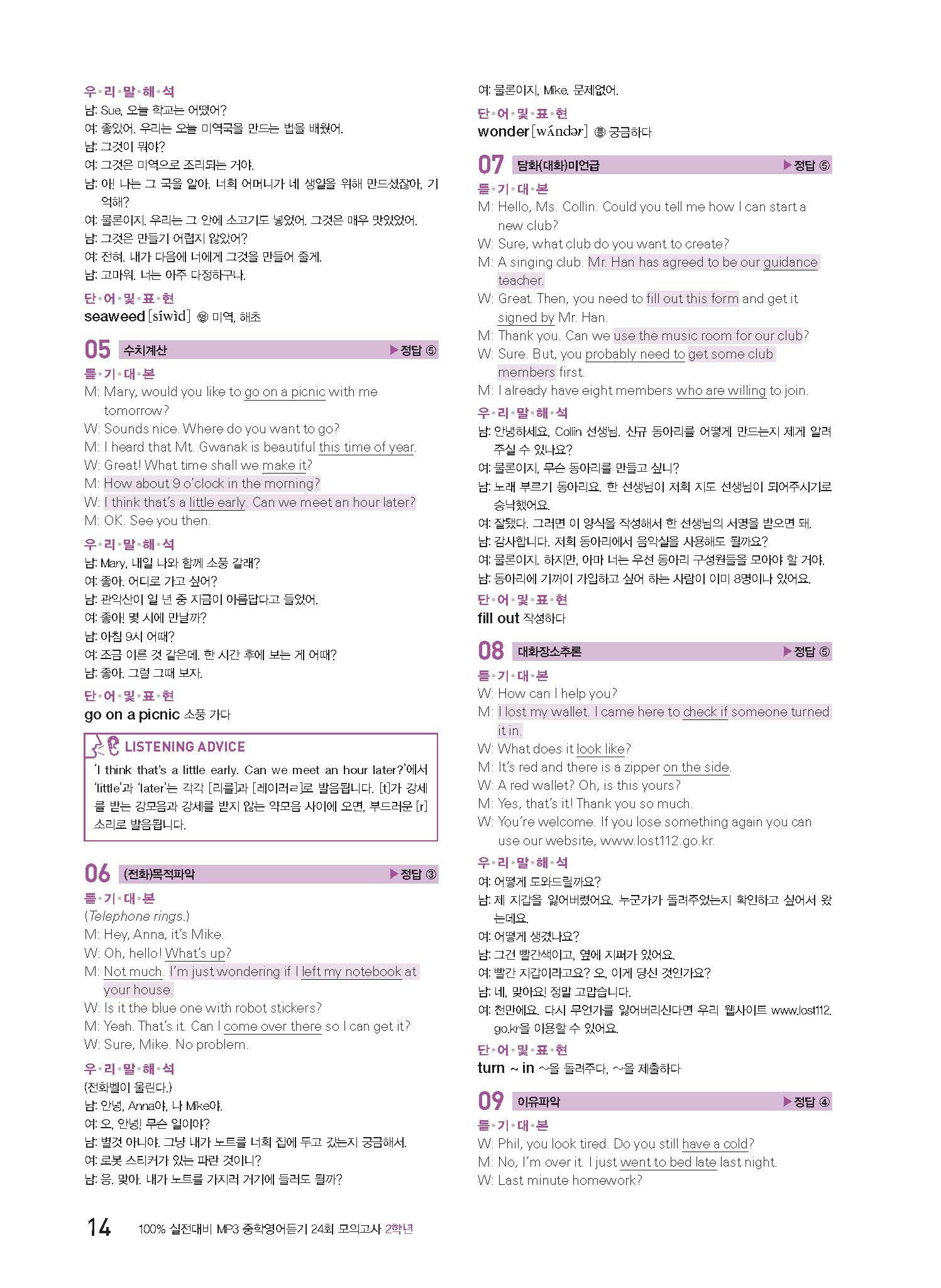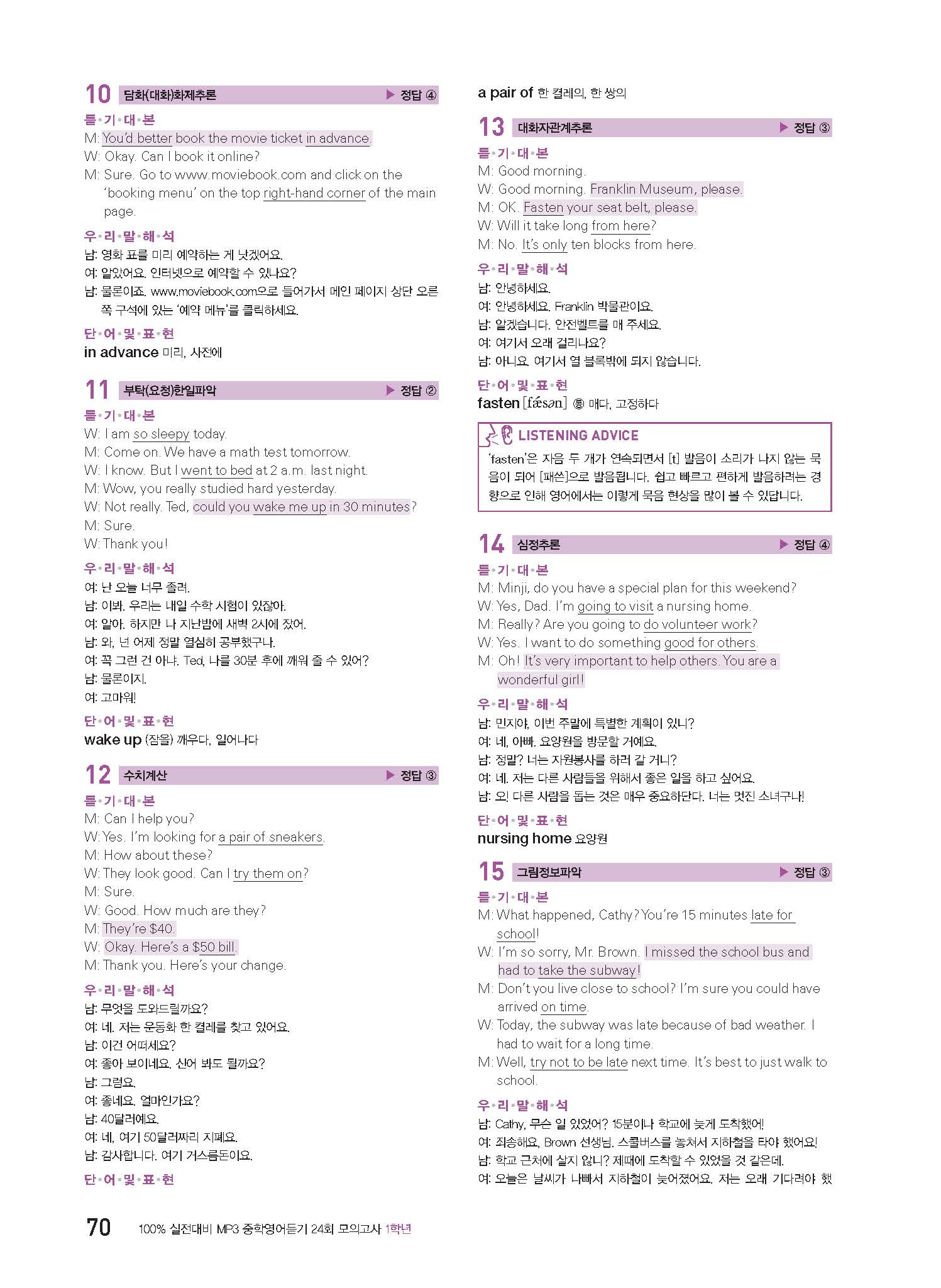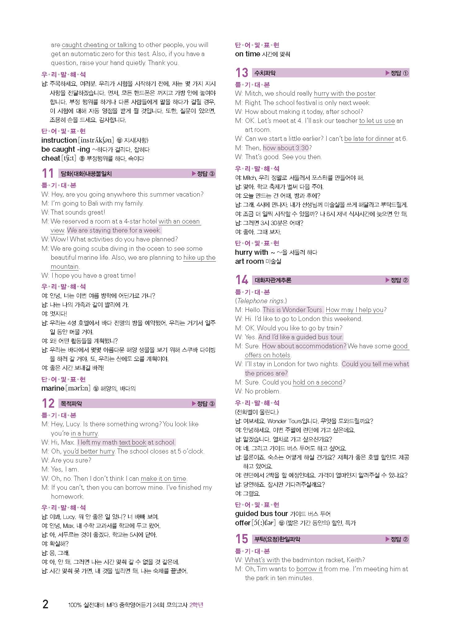 2021 100% 실전대비 MP3 중학영어듣기 24회 모의고사 2학년 답지 사진답지 빠른답지 모바일최적화