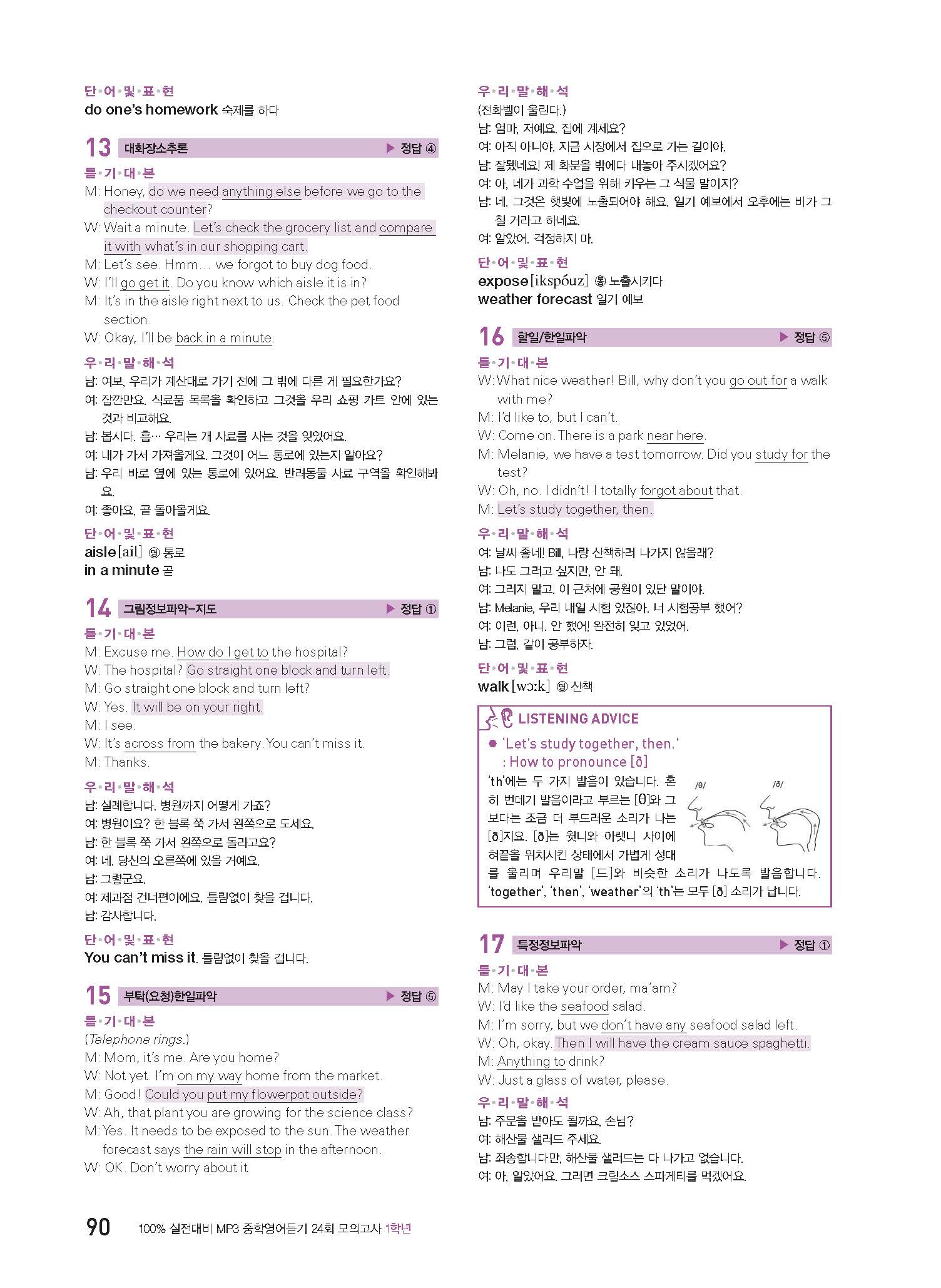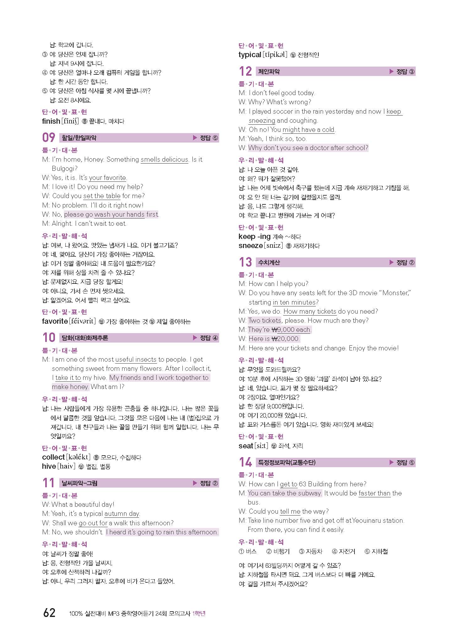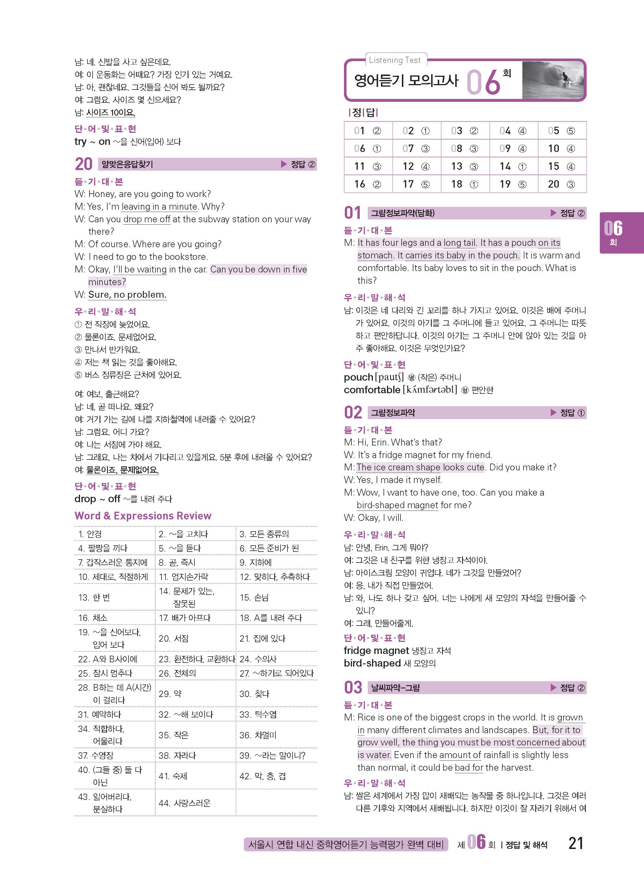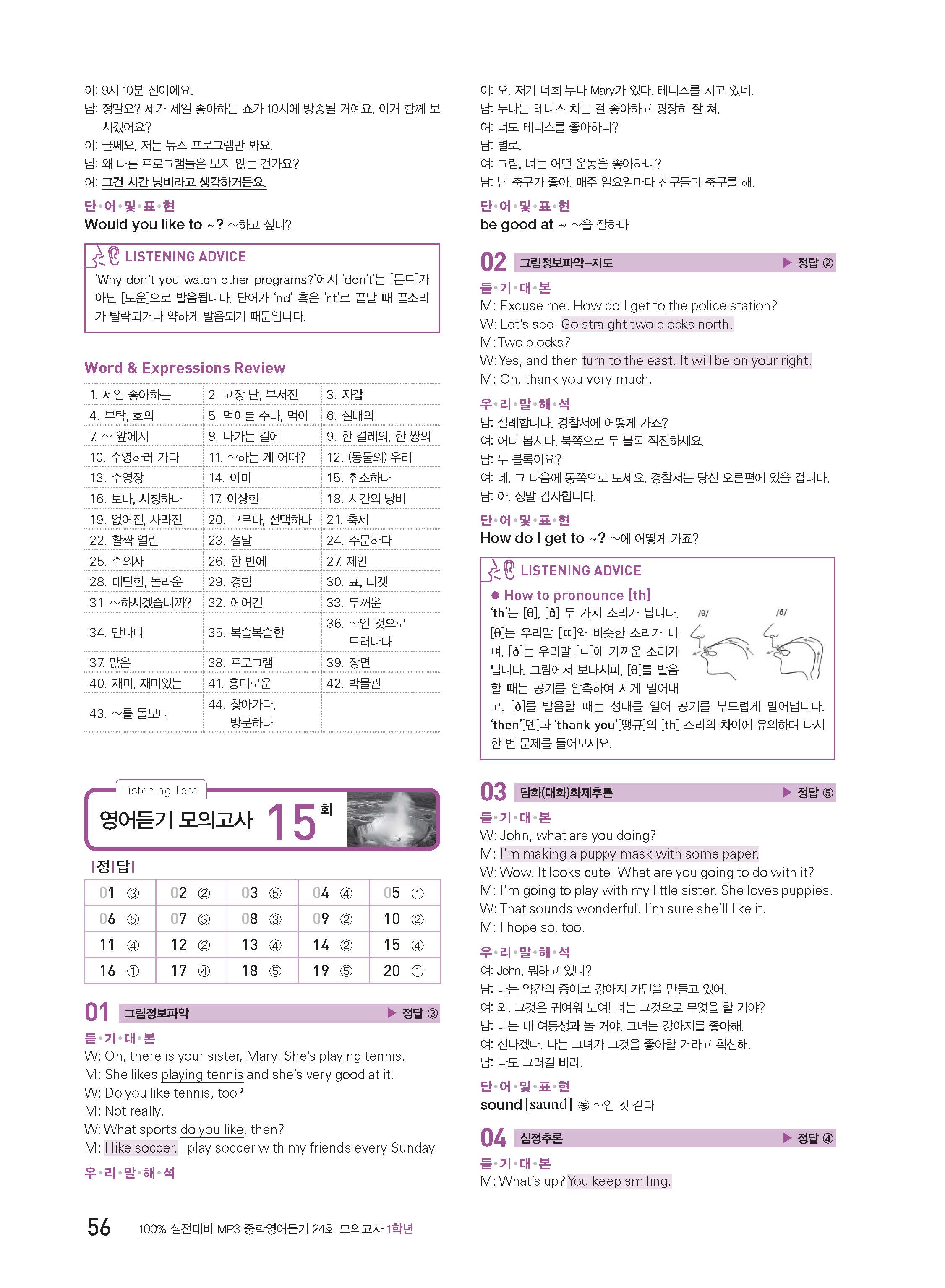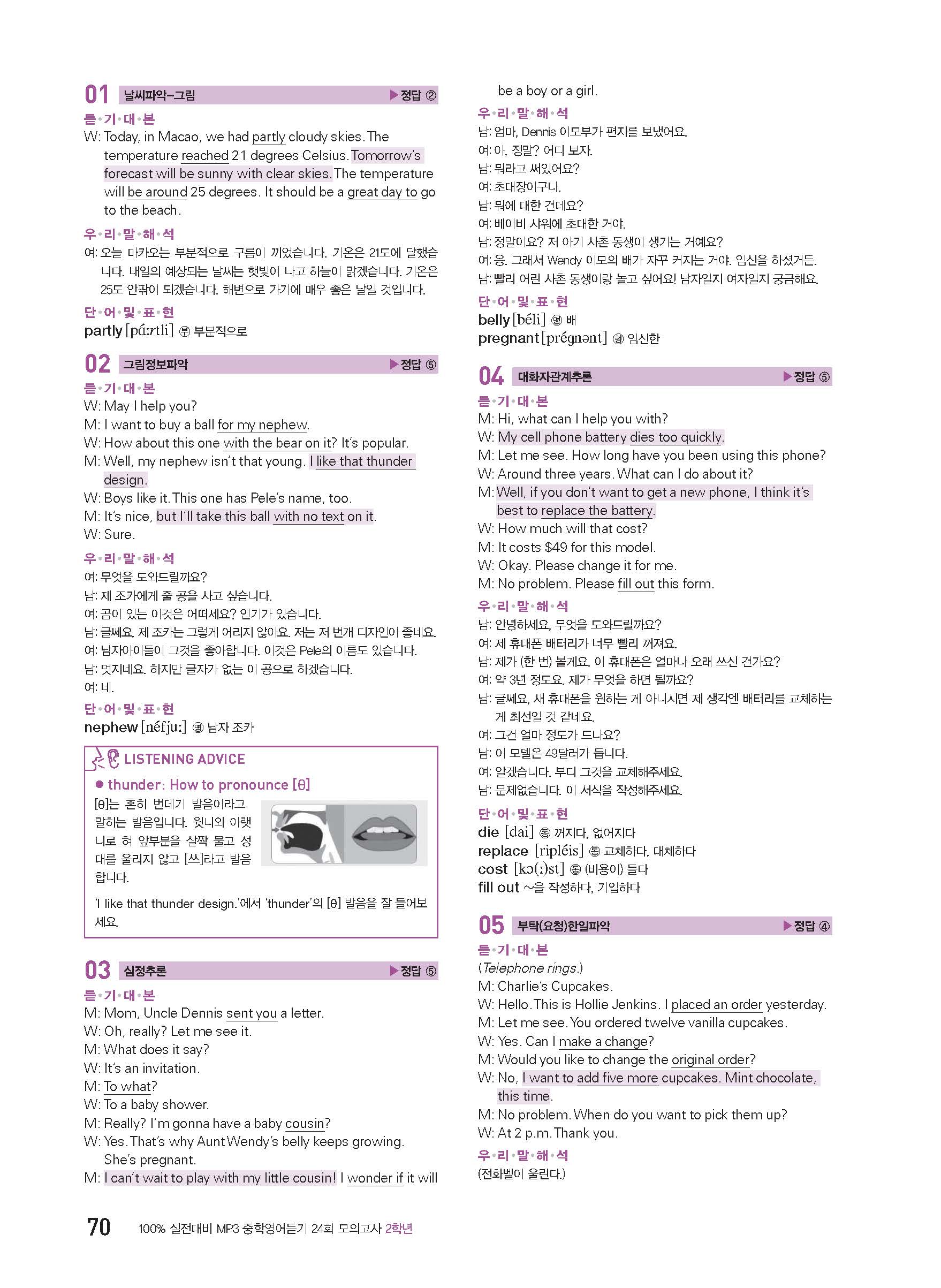 2021 100% 실전대비 MP3 중학영어듣기 24회 모의고사 2학년 답지 사진답지 빠른답지 모바일최적화
